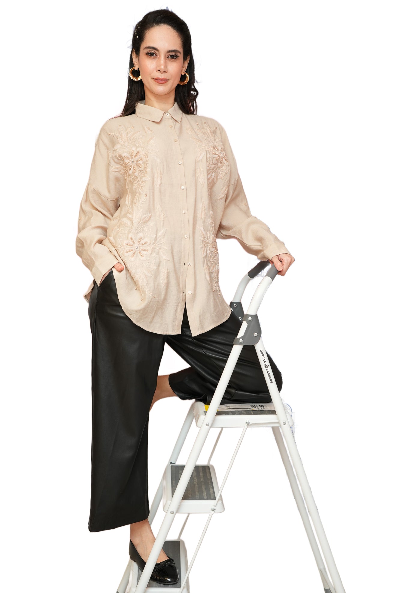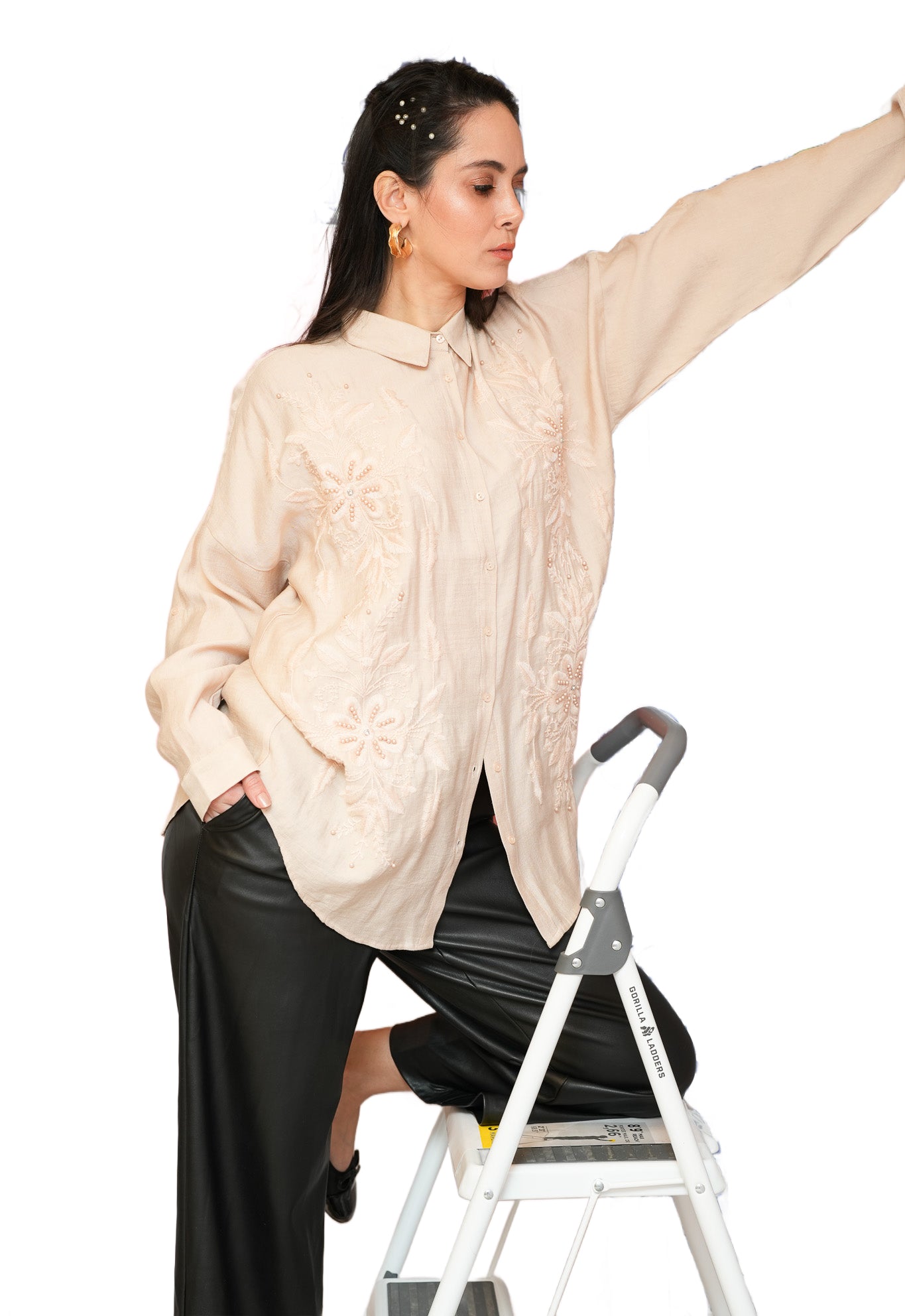 The Beige Bloom Shirt is a graceful and effortlessly stylish piece that embodies the warmth and glow of spring. Crafted in a soft beige fabric, this long-sleeve shirt features delicate floral embroidery in warm hues, reminiscent of golden sunshine filtering through a blooming garden. Whether paired with denim for a relaxed daytime look or tailored trousers for a sophisticated ensemble, this shirt radiates charm and versatility.