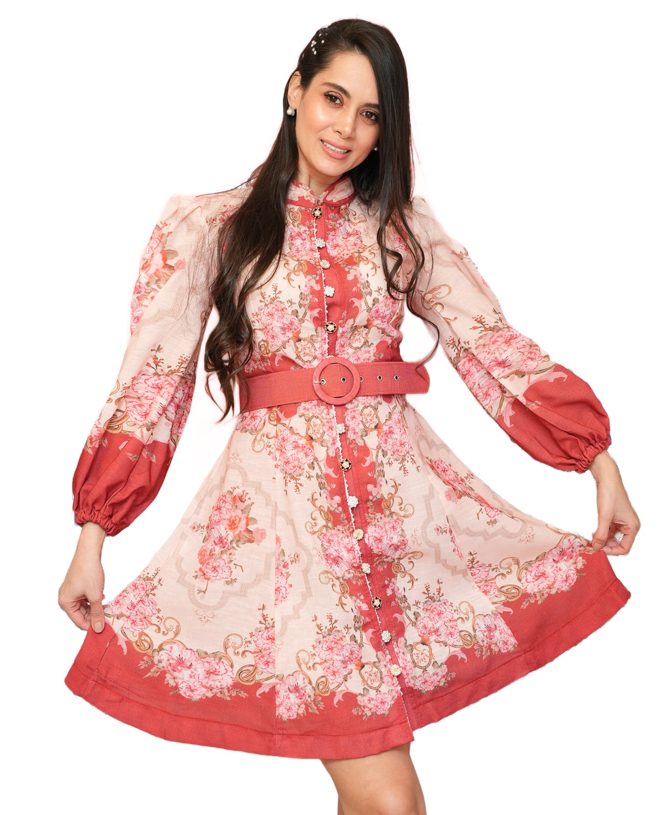 A graceful fusion of floral charm and structured elegance. Belle in Blush is the ultimate statement mini dress for the romantic at heart. Crafted in a soft blush pink with rich crimson accents, this piece features delicate button detailing, a high neckline, and a flattering belted waist. Whether you’re headed to a garden party or a fancy brunch, this dress will have all eyes on you.