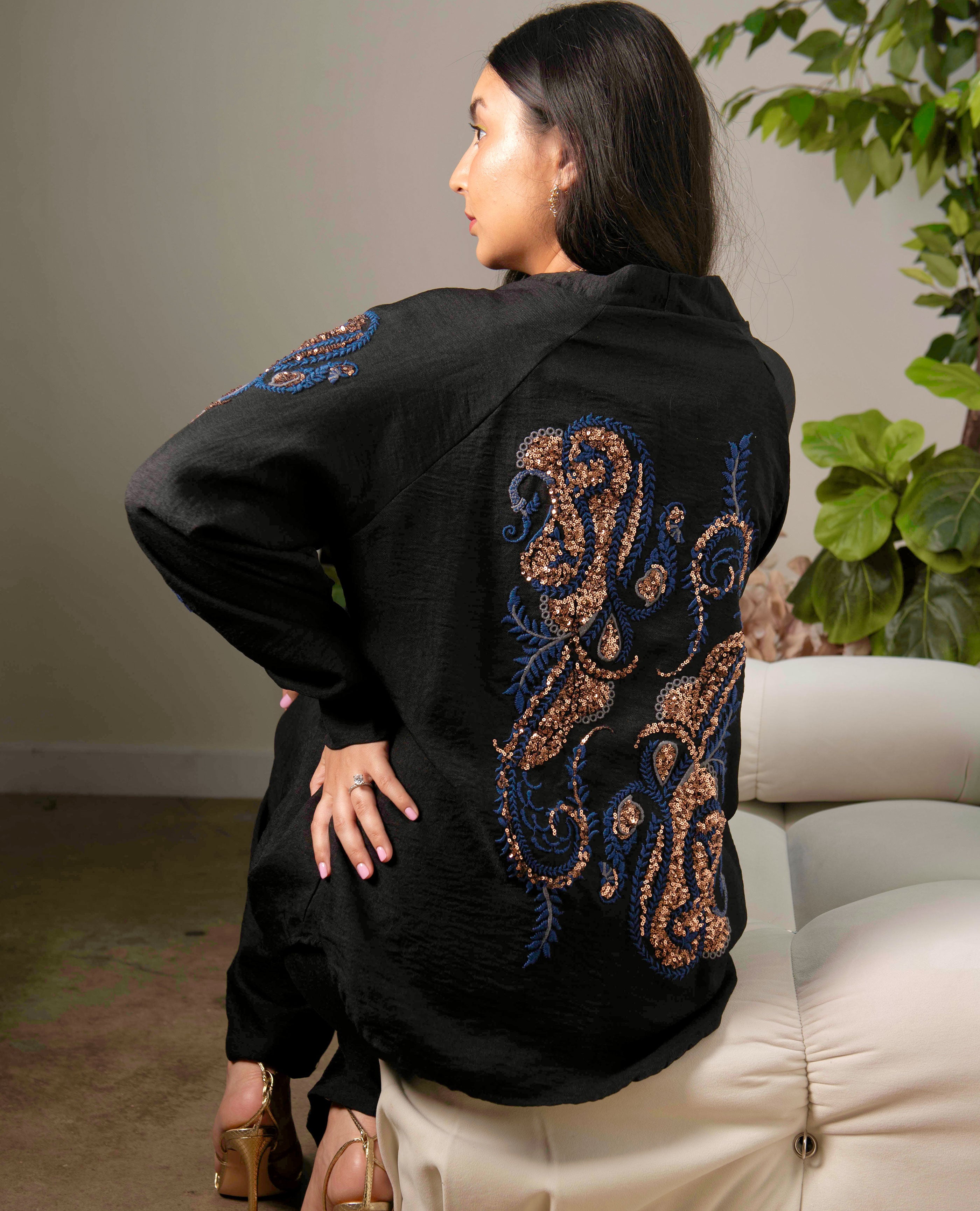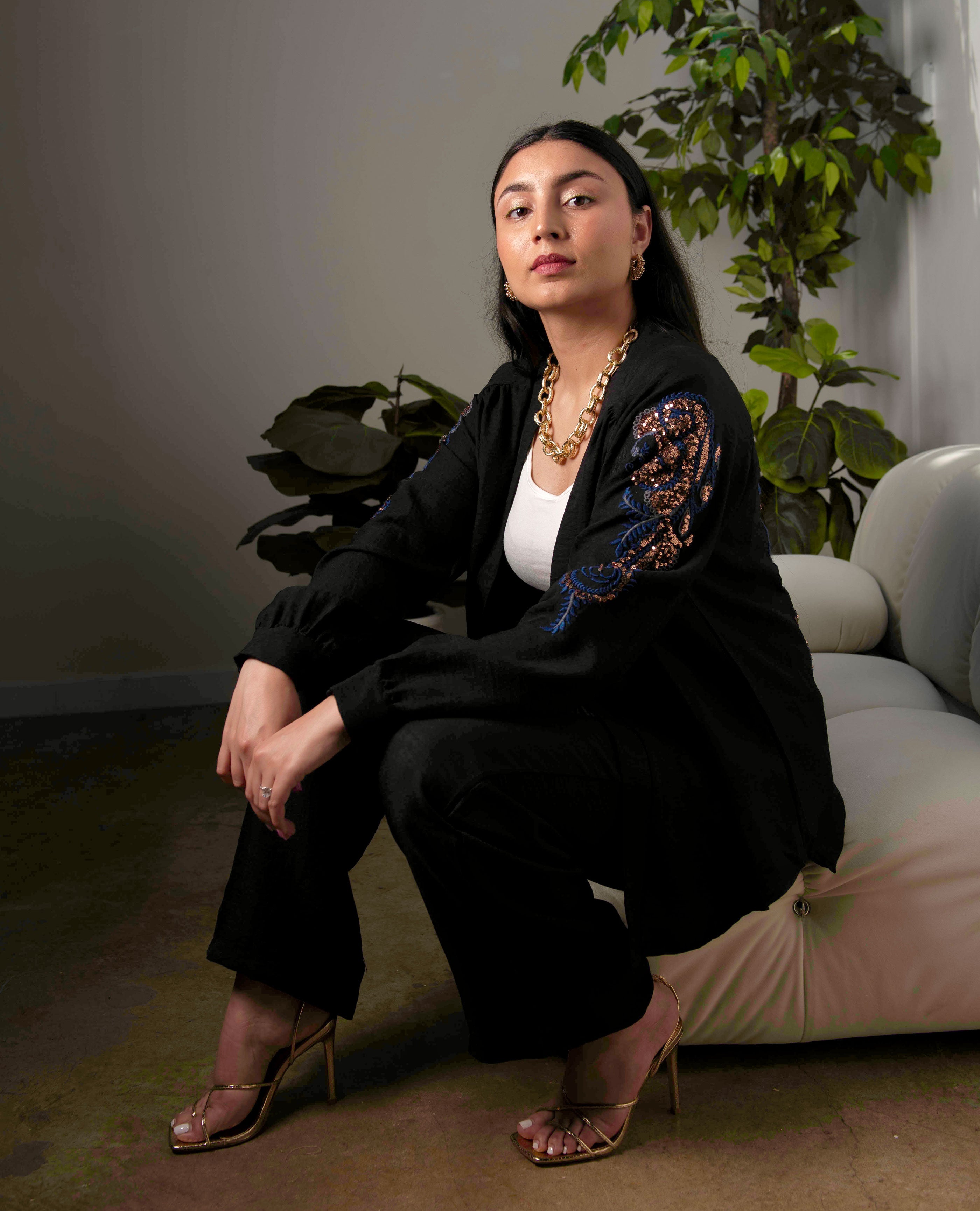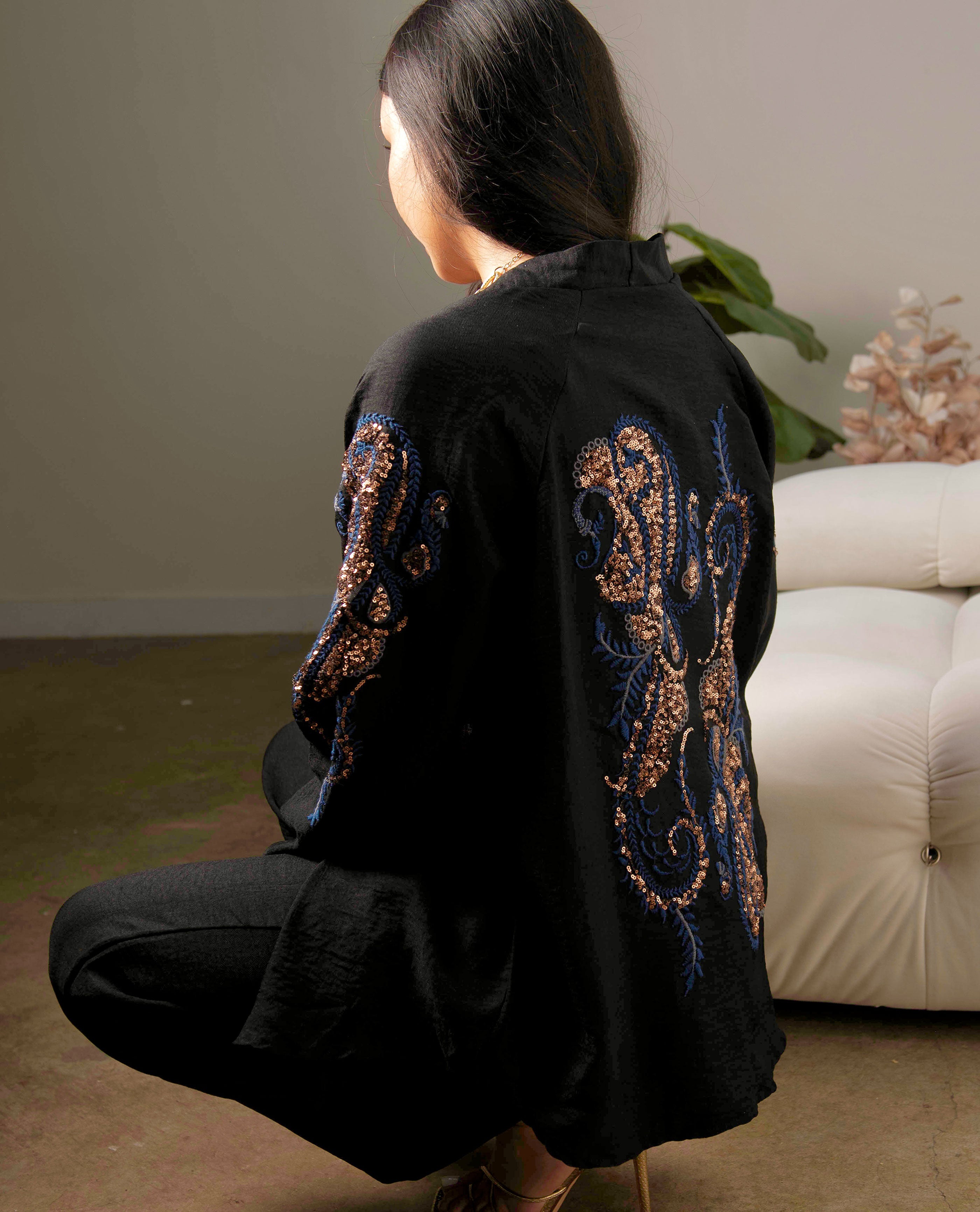 Our black Iris coord set is a true standout piece. The back features intricate embroidery that adds a touch of luxury, blending the shimmer of sequins with finely detailed stitching.