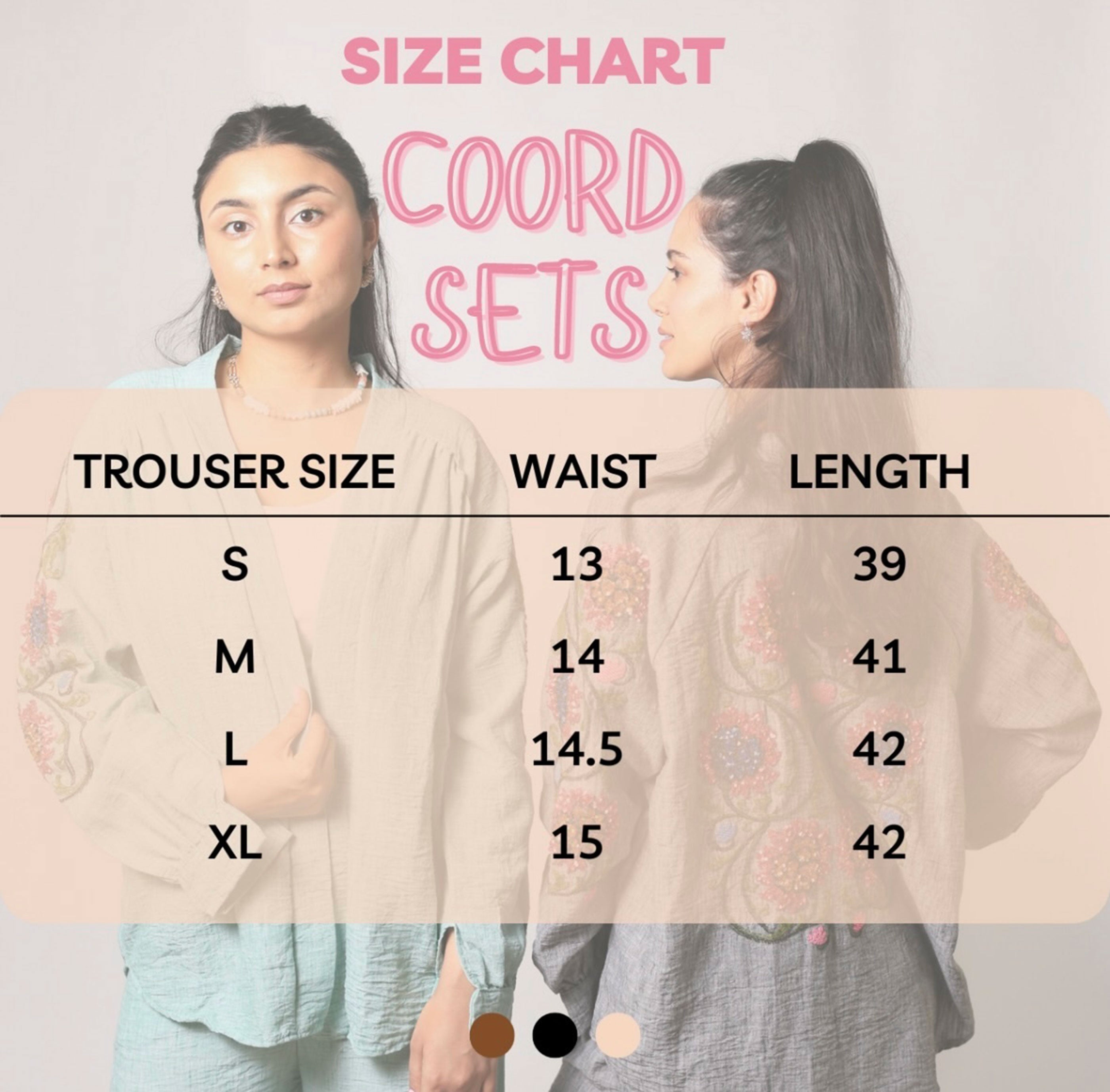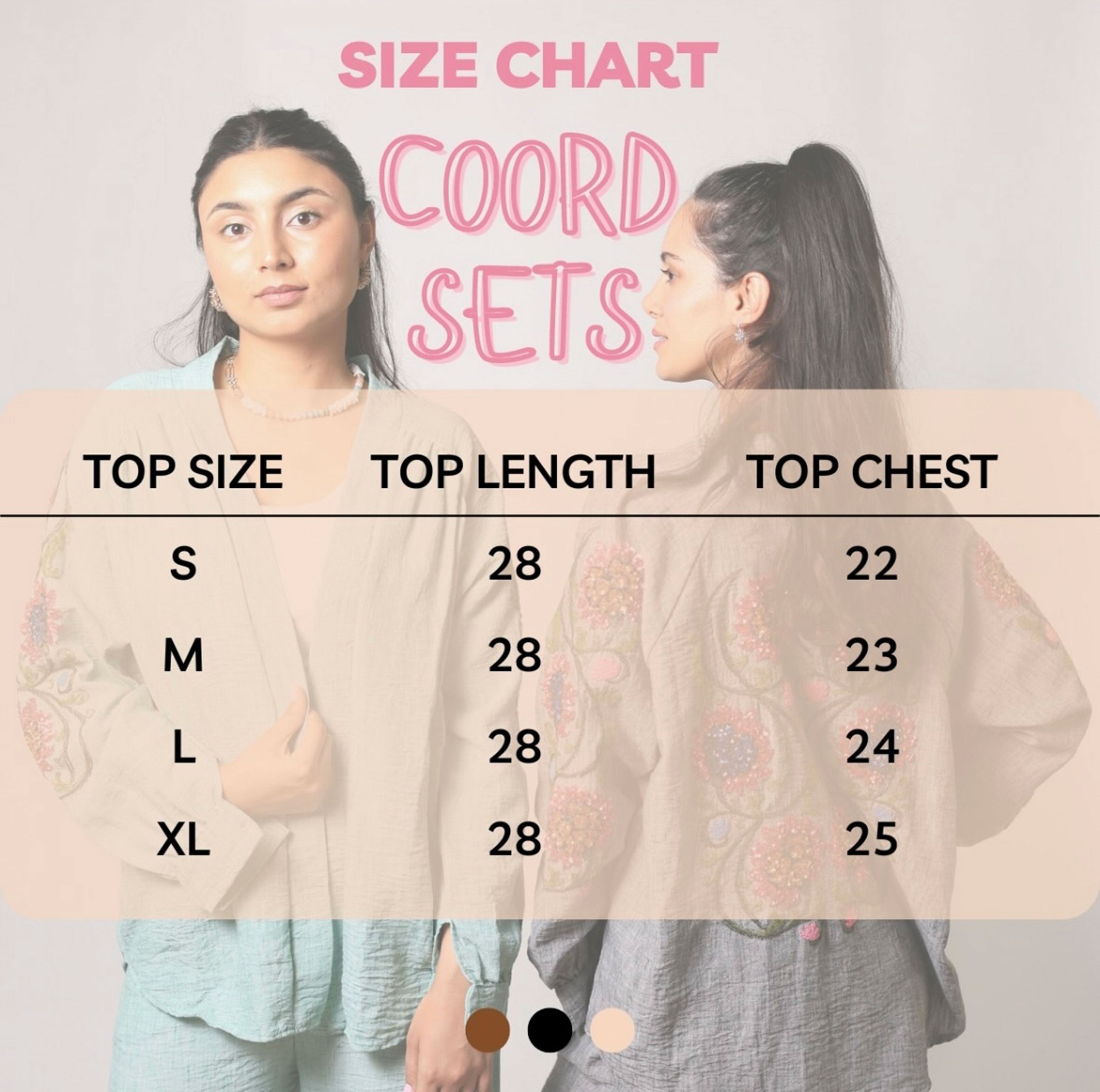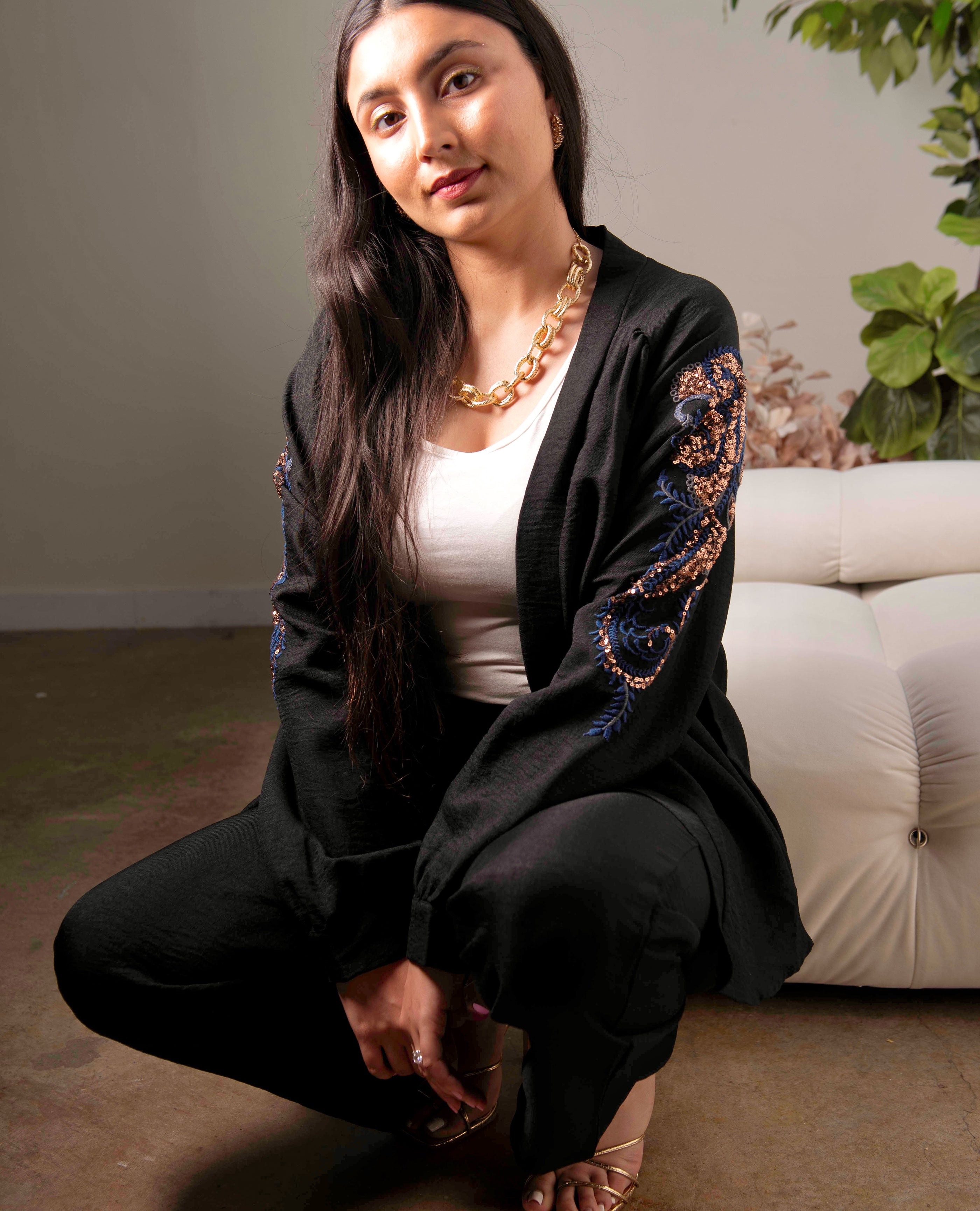 Our black Iris coord set is a true standout piece. The back features intricate embroidery that adds a touch of luxury, blending the shimmer of sequins with finely detailed stitching.