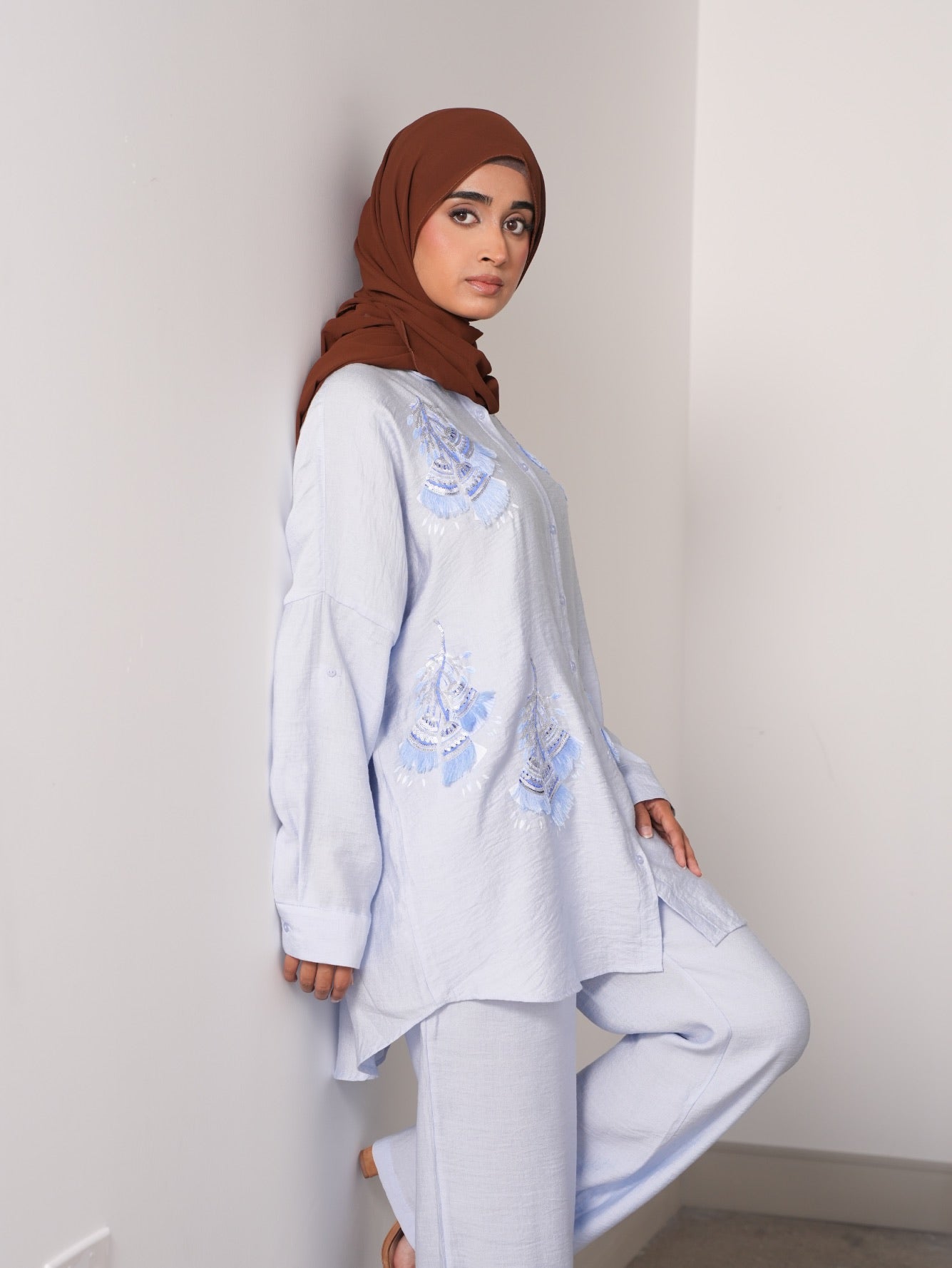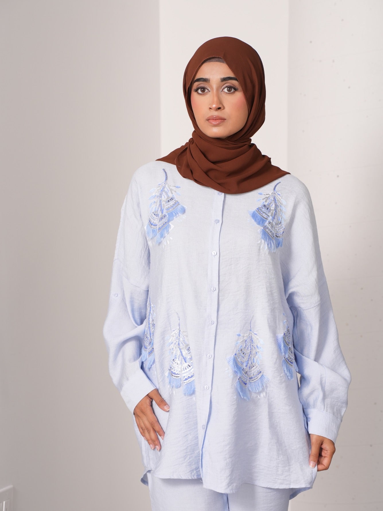 The soft, airy fabric drapes effortlessly, while delicate feather accents add a whimsical touch of movement and texture. With a coordinated silhouette that balances structure and softness, this set evokes the serenity of open skies and the boldness of high fashion. Whether you're stepping into a brunch, a rooftop soirée, or a glam photoshoot, this ensemble promises grace with a hint of drama.