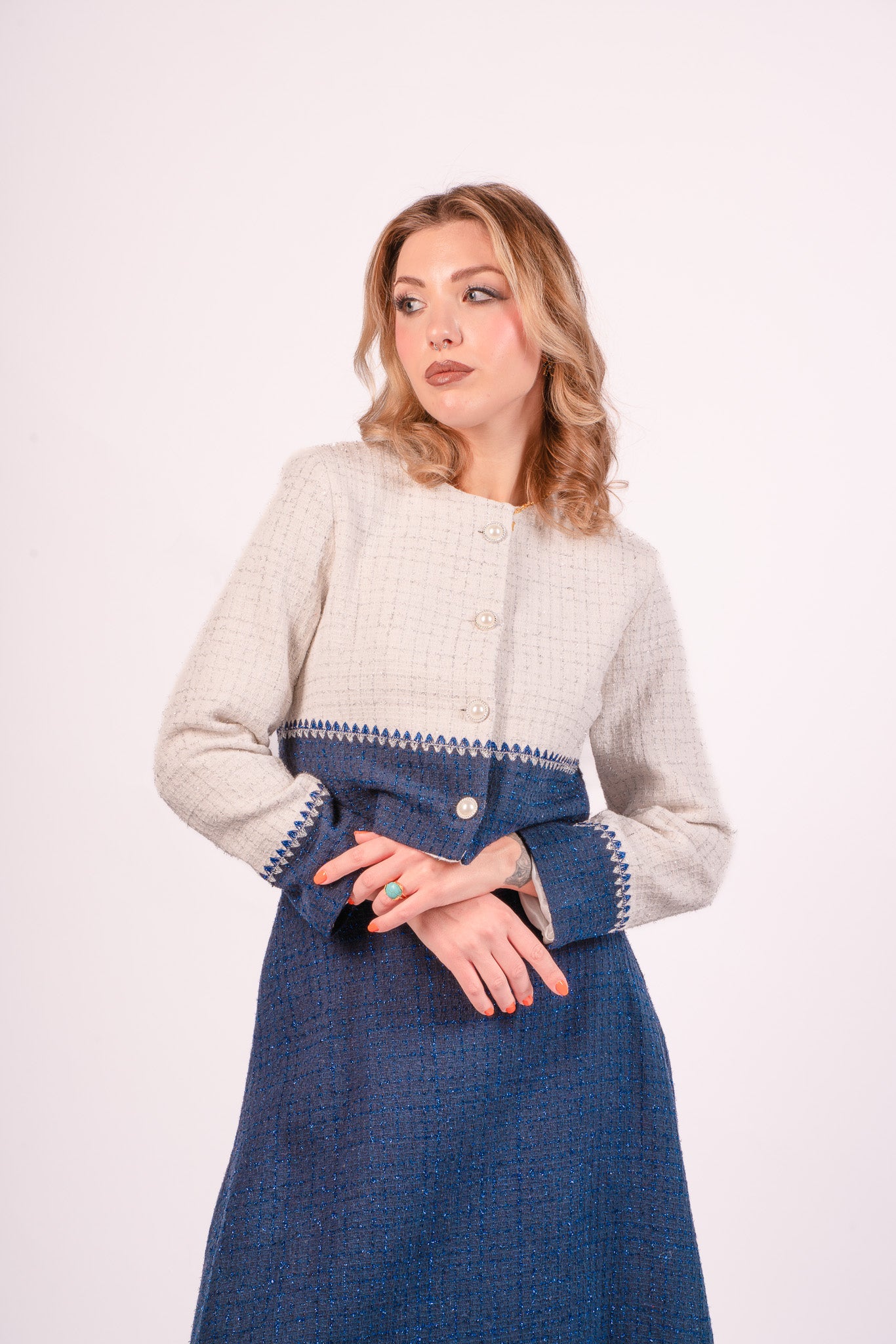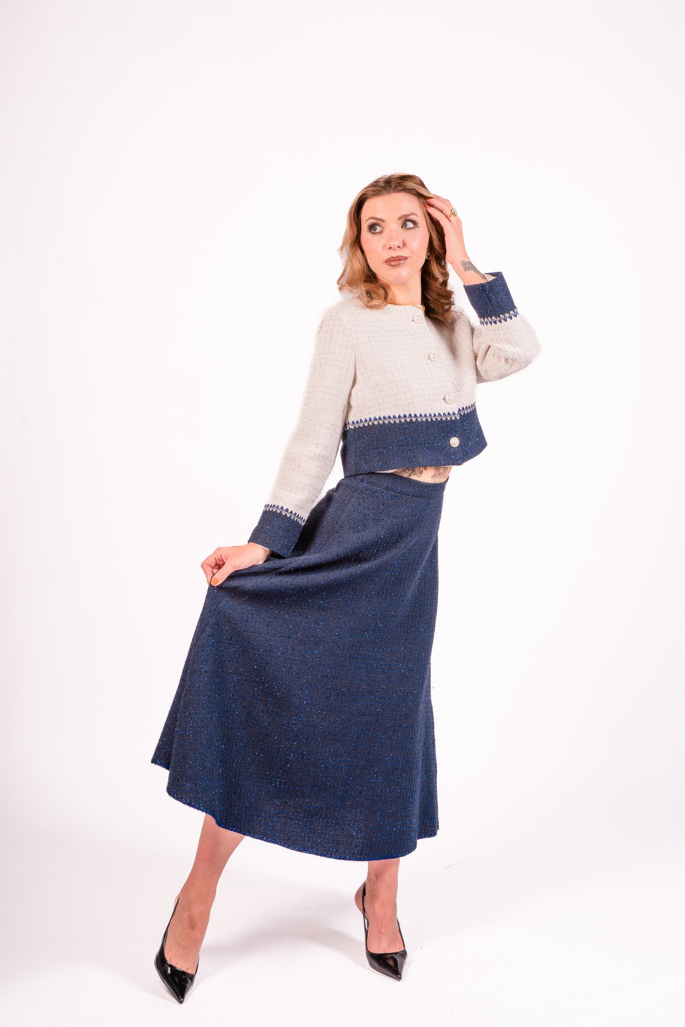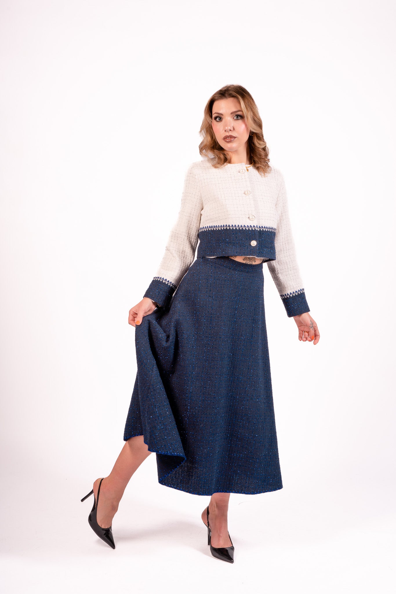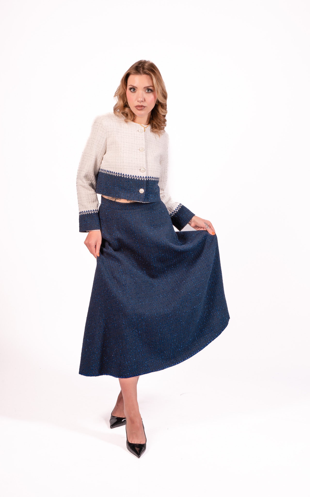 Step into effortless style with the Blue Whimsy Skirt. This vibrant ensemble features a long, deep blue skirt with a subtle textured pattern. The matching off-white jacket, adorned with a blue band around the waist and cuffs, adds a unique touch with a zigzag pattern where the two colors meet. The jacket's round neckline and front button closure enhance the elegance of the set. Perfect for various occasions, this set combines style and comfort seamlessly.