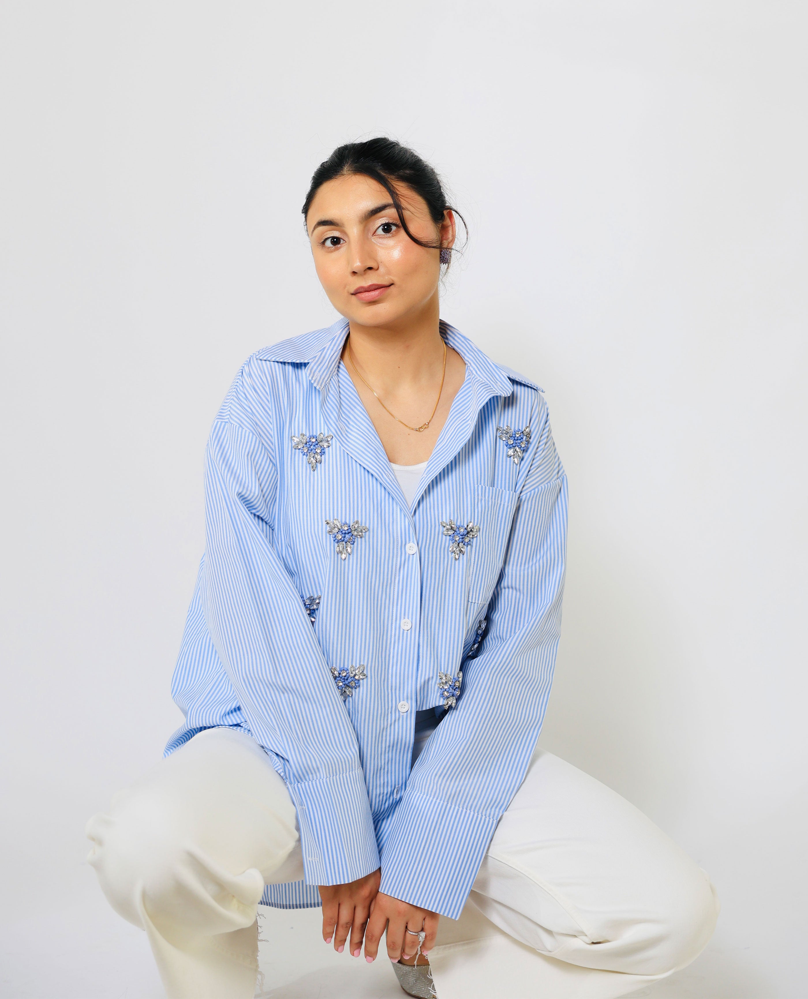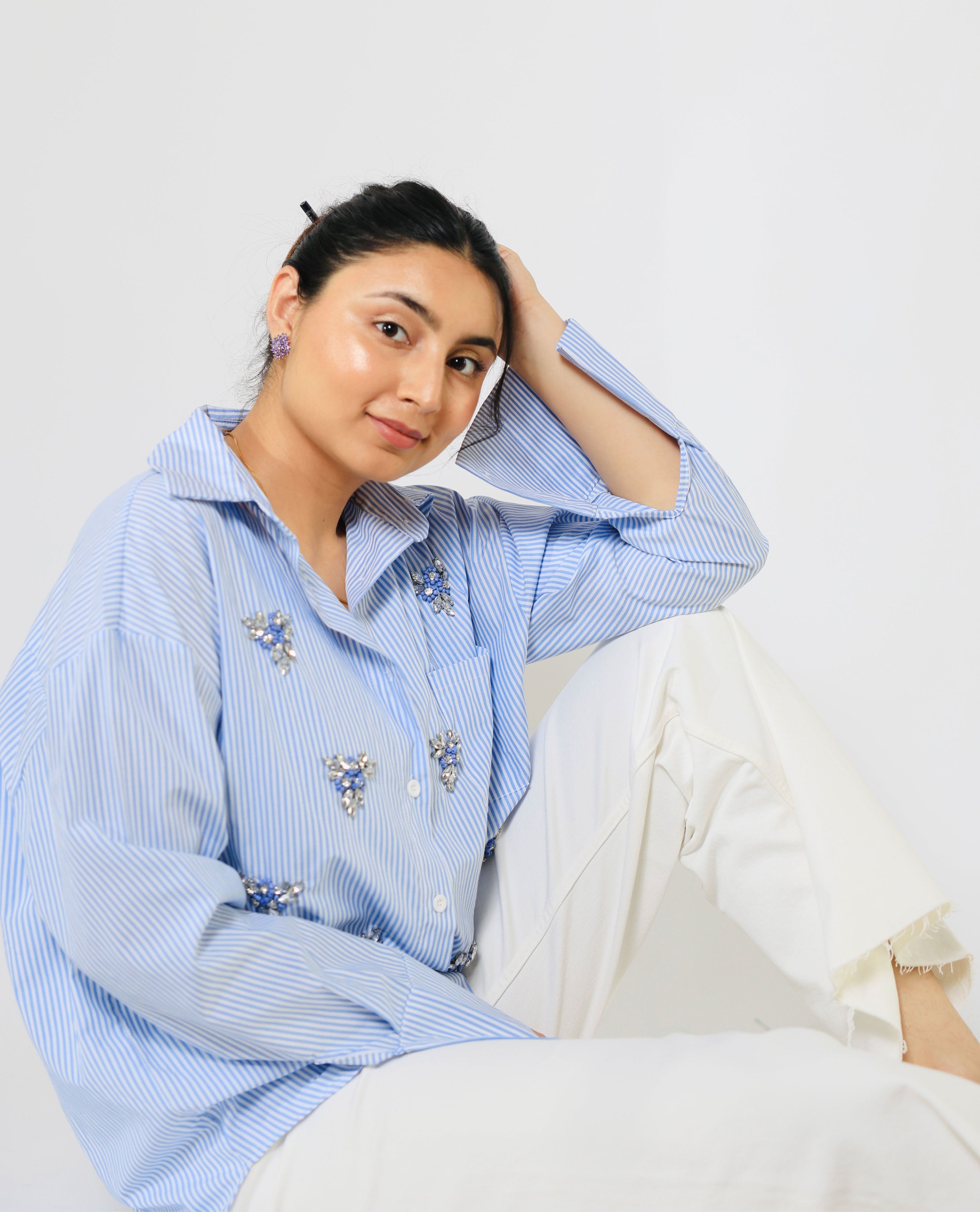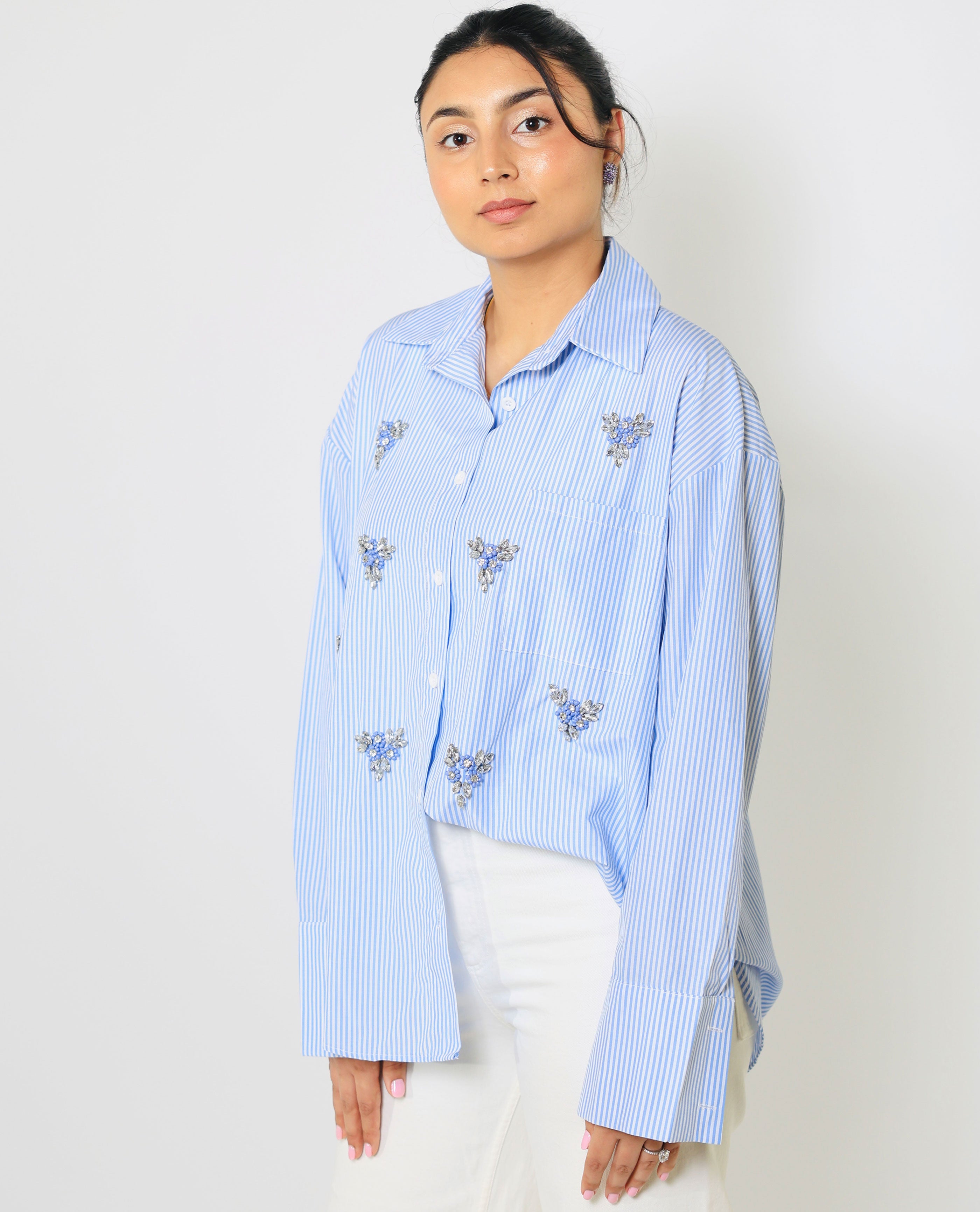 Elevate your wardrobe with this sophisticated Bluebell dress shirt, adorned with exquisite silver and blue embellishments.