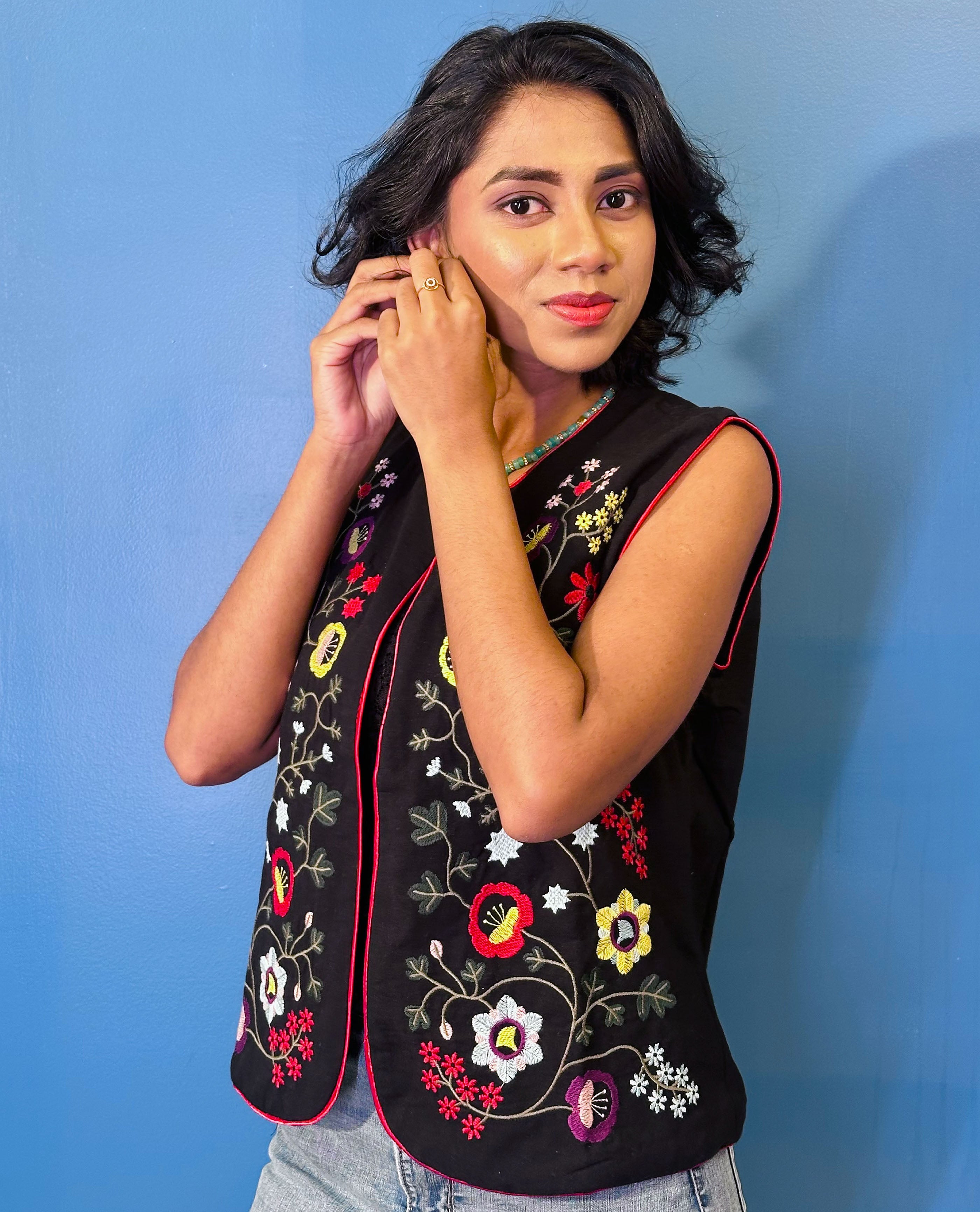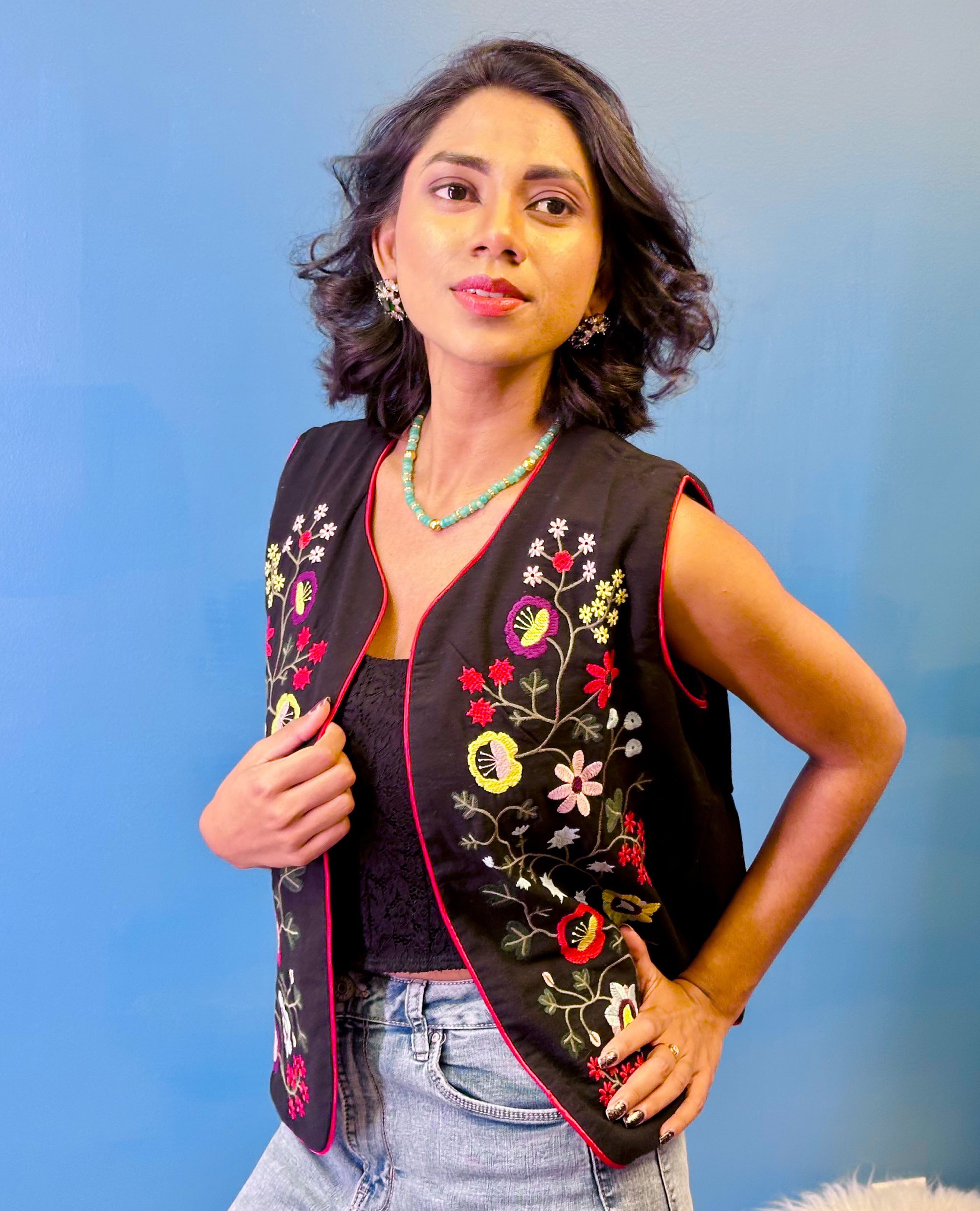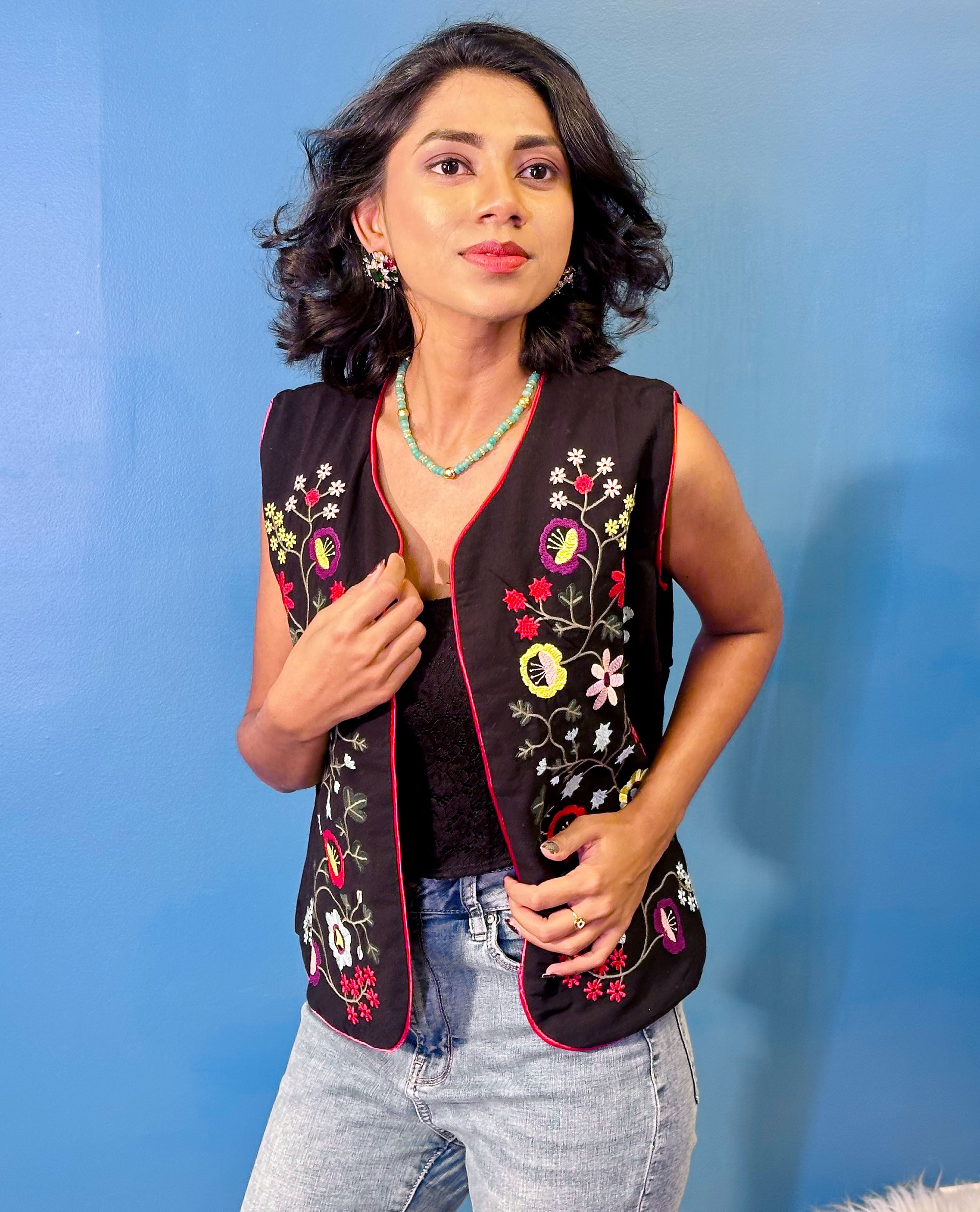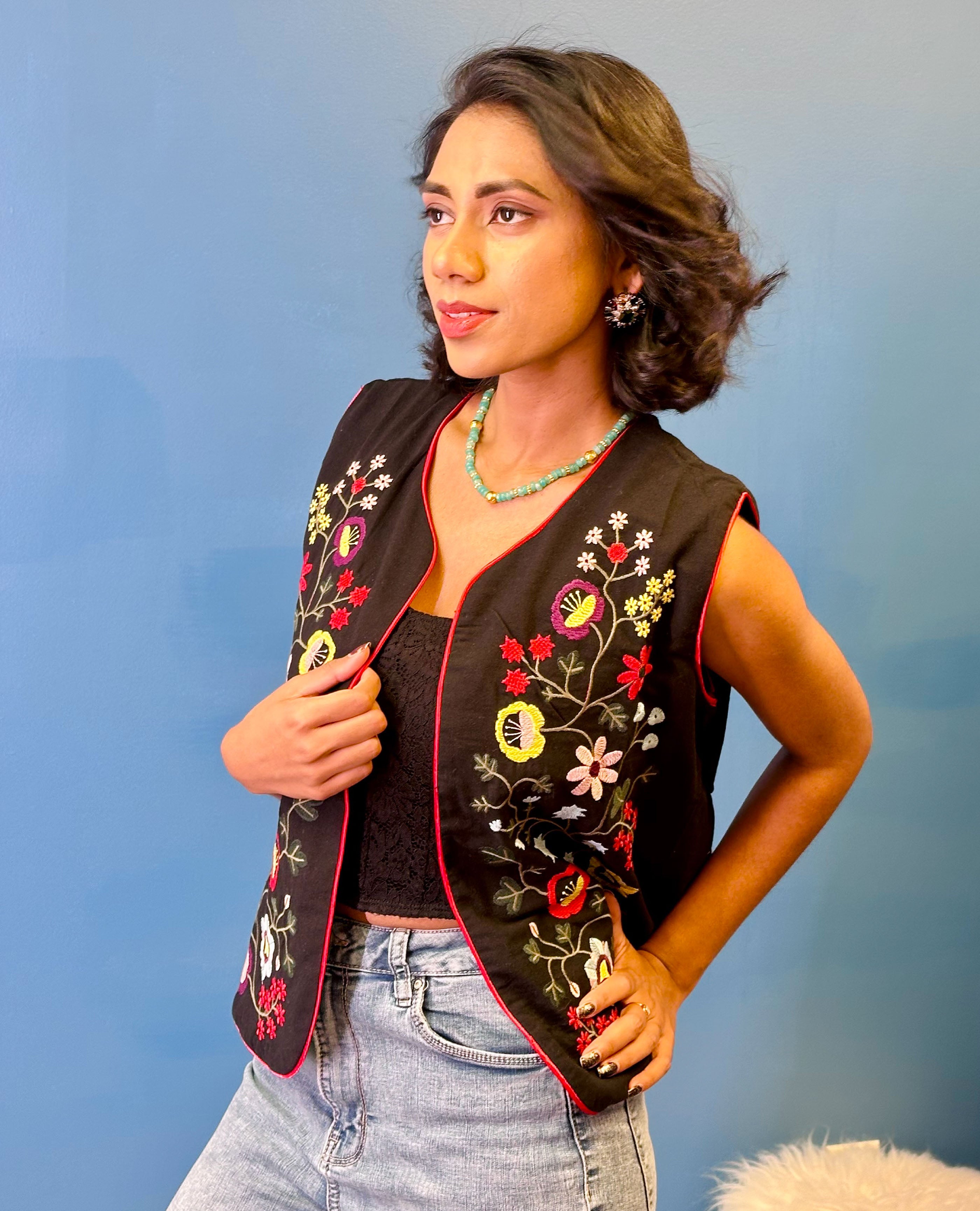 This striking black vest features intricate floral embroidery, adding a touch of vibrant charm to a classic silhouette. The sleeveless design makes it a versatile piece for layering and showcasing your unique style.