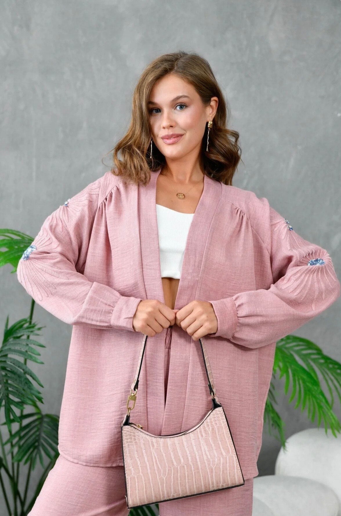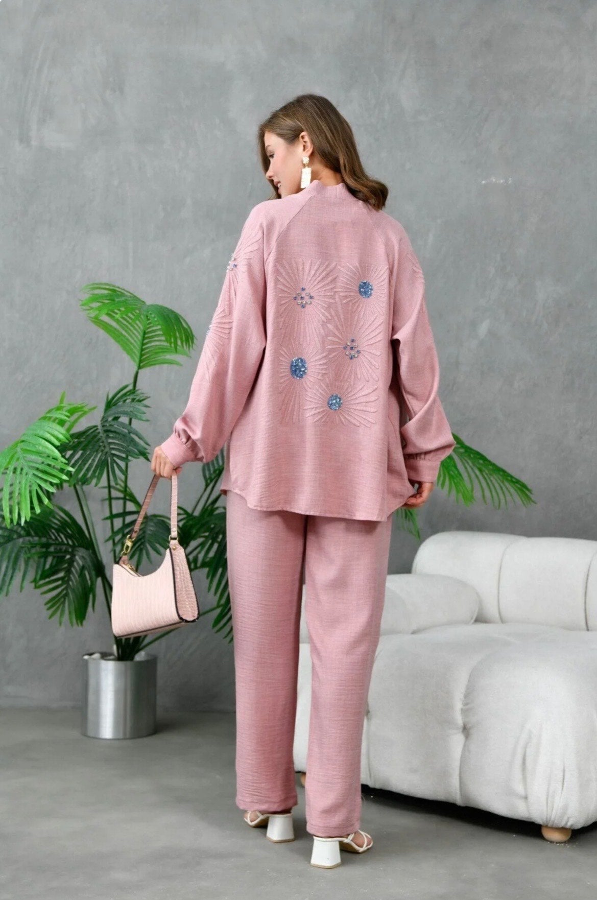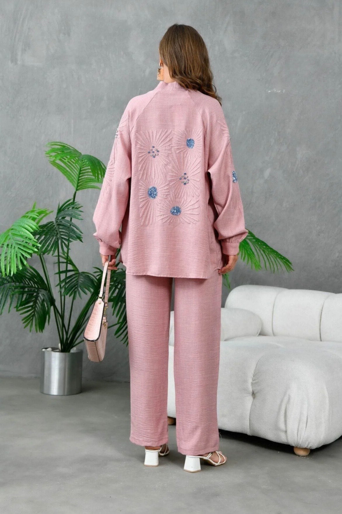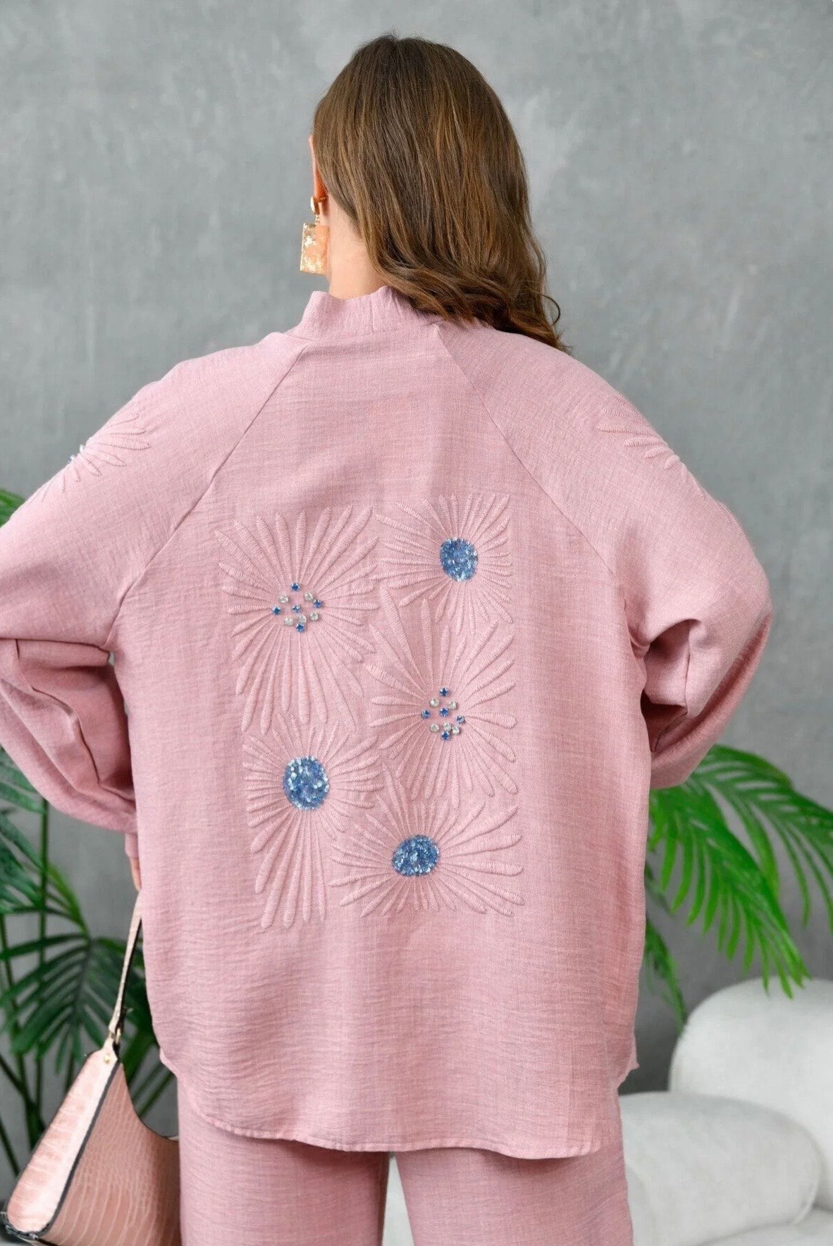 Step into softness with Blush Bloom, a two-piece coord set in a delicate pink hue. The open-front cardigan drapes effortlessly over the matching wide-leg trousers, offering a relaxed yet refined silhouette. Blue and white floral embroidery blooms across the back and sleeves, adding a touch of artistry to this everyday essential. Lightweight, breathable, and beautifully finished — perfect for brunches, strolls, or serene evenings.