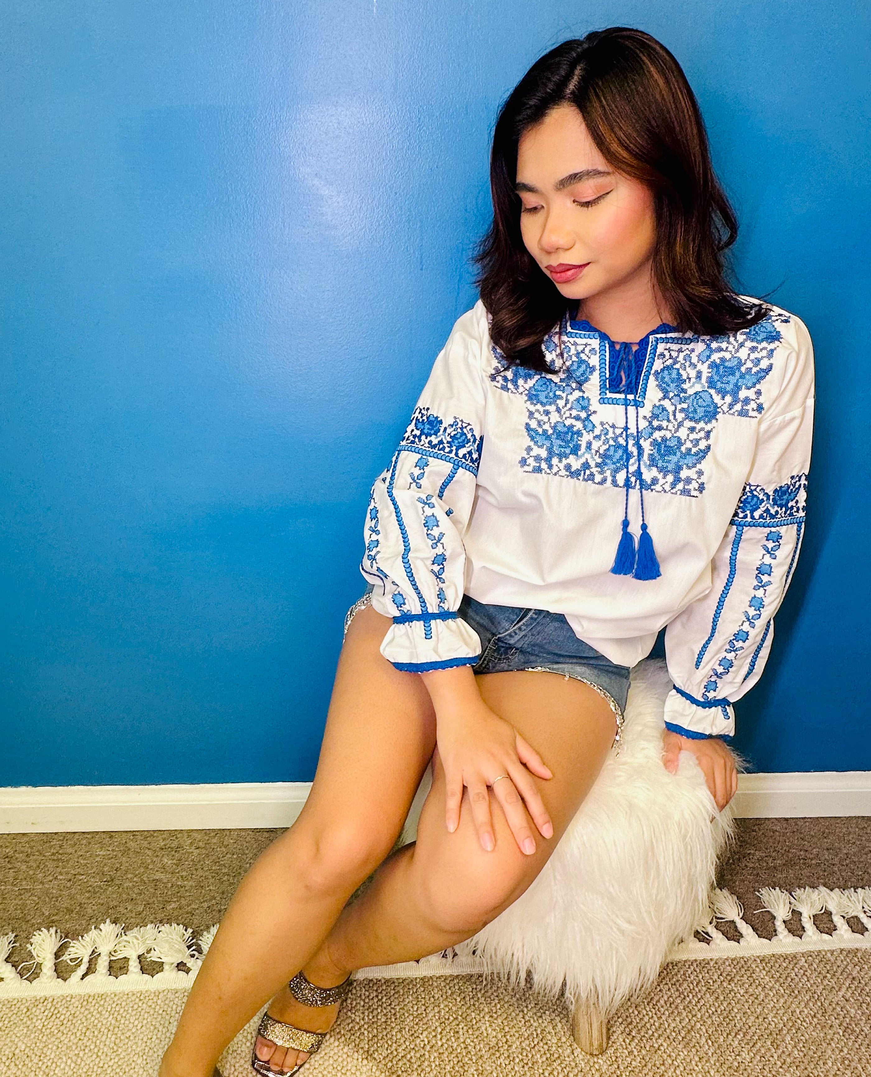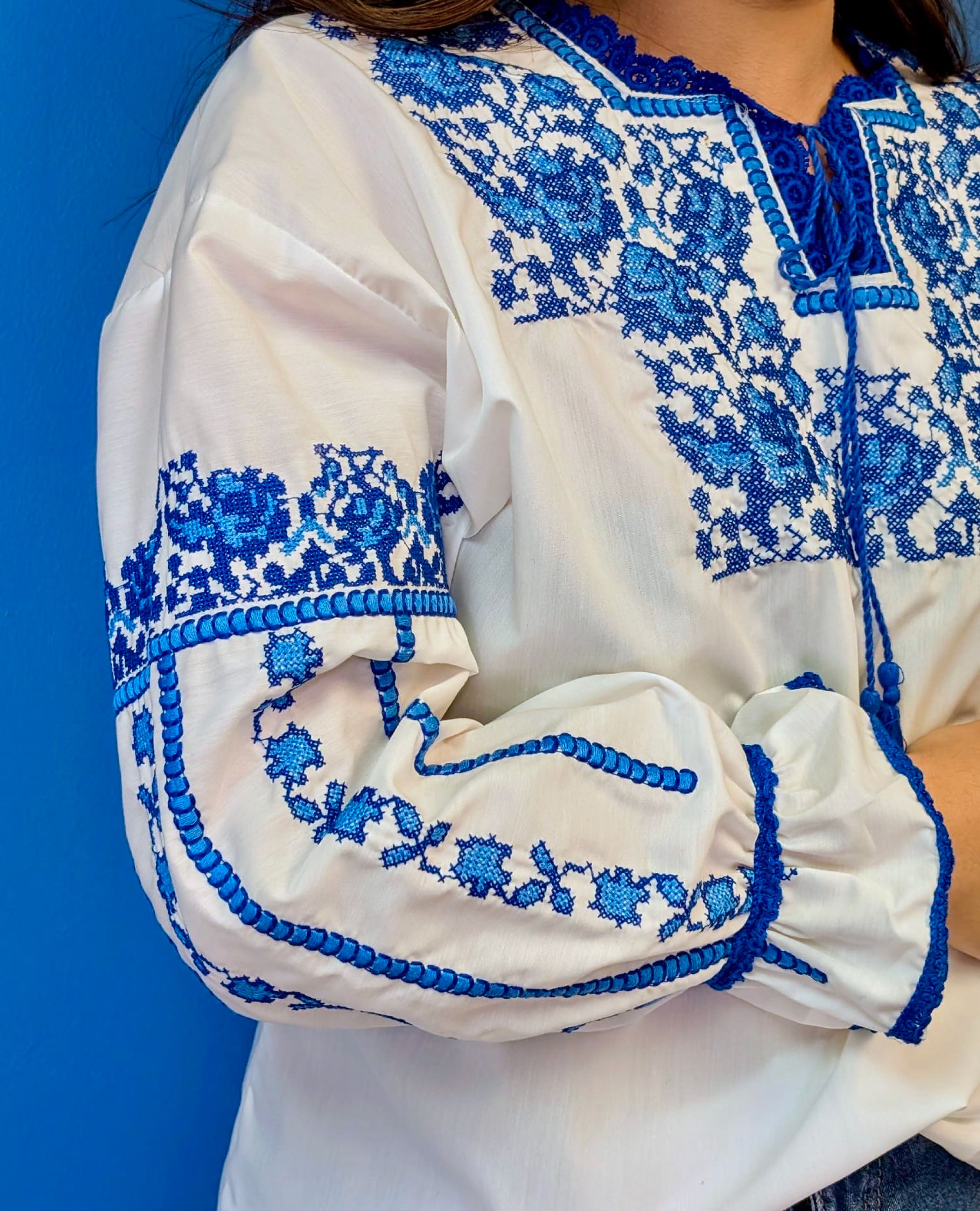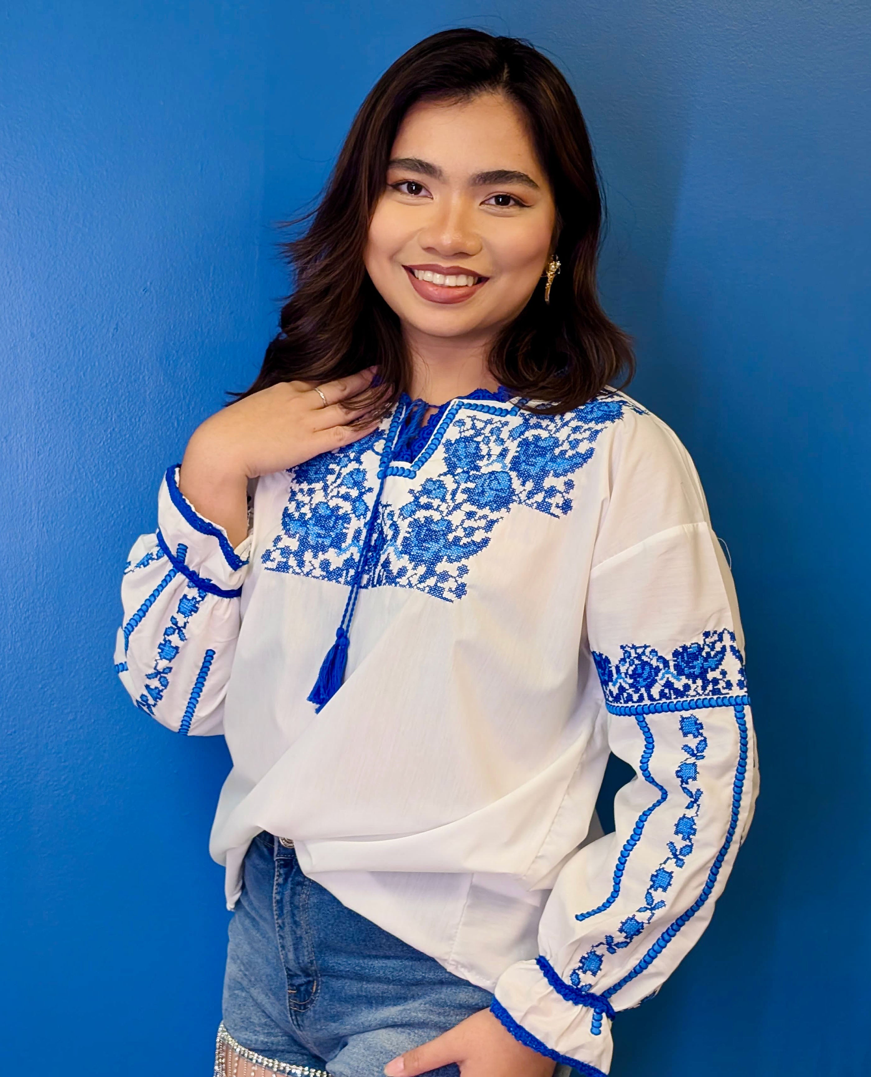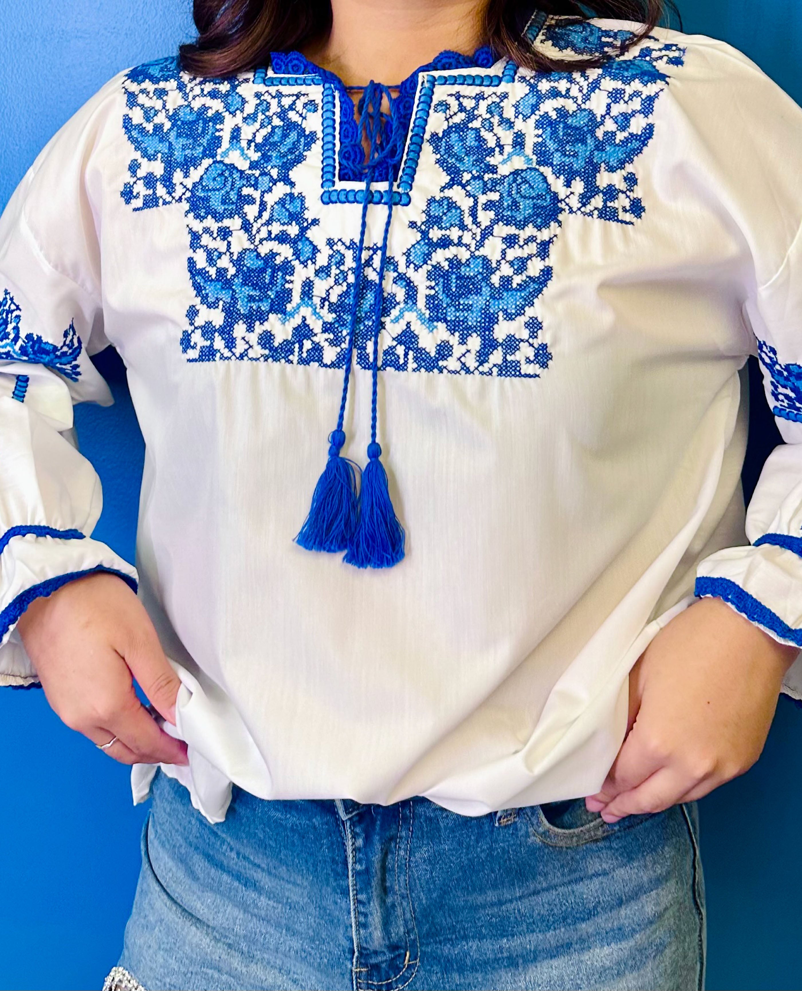 This charming shirt features a crisp white base adorned with delicate blue embroidery, creating a serene and sophisticated look. The shirt showcases intricate blue embroidery that gracefully decorates the front and sleeves, adding a touch of artisanal beauty. “Breezy Blue” with your favorite jeans, skirts, or shorts for a fresh and stylish look. Whether you’re heading to a brunch, a day out, or a casual evening event, this shirt adds a touch of effortless elegance to your wardrobe.