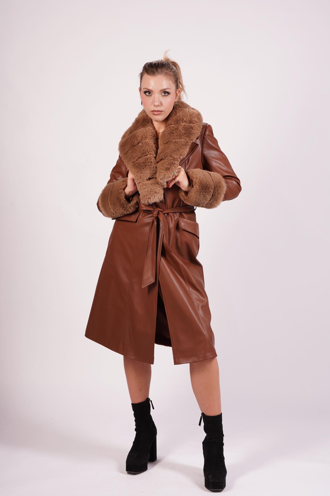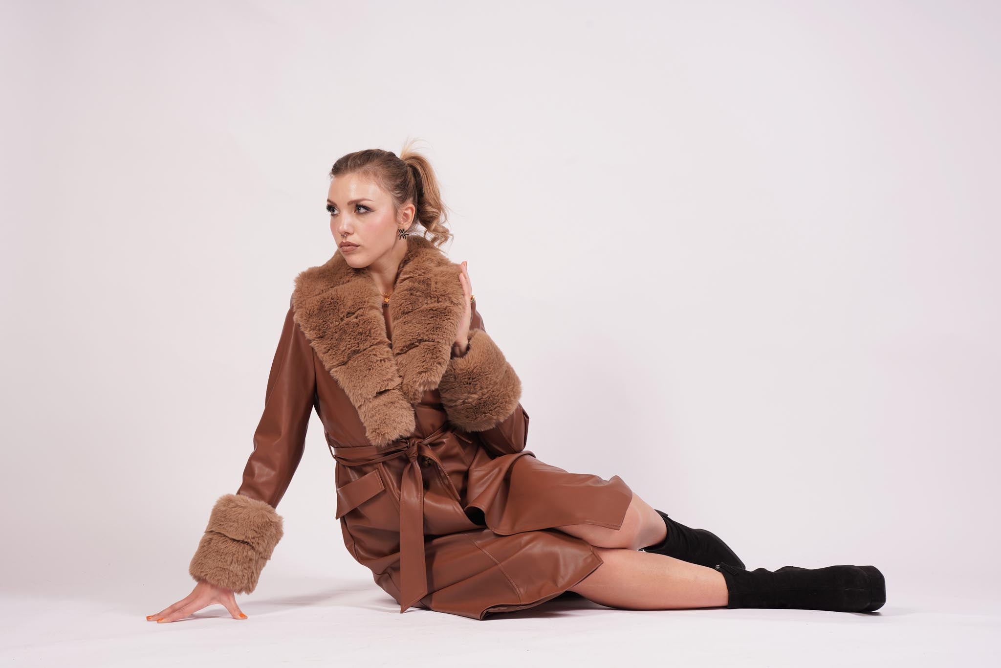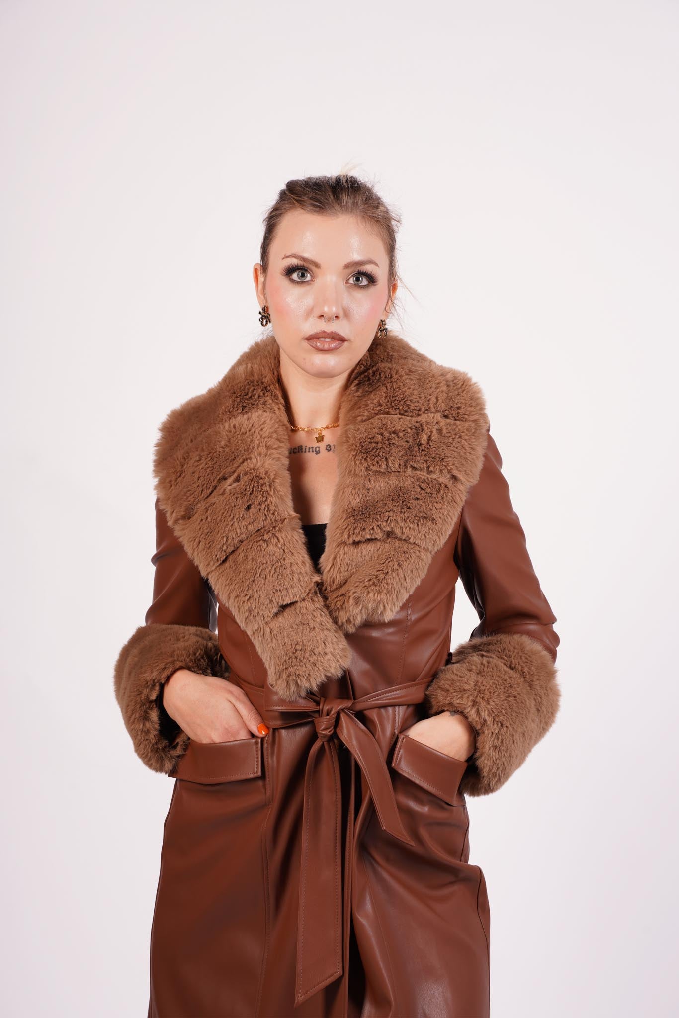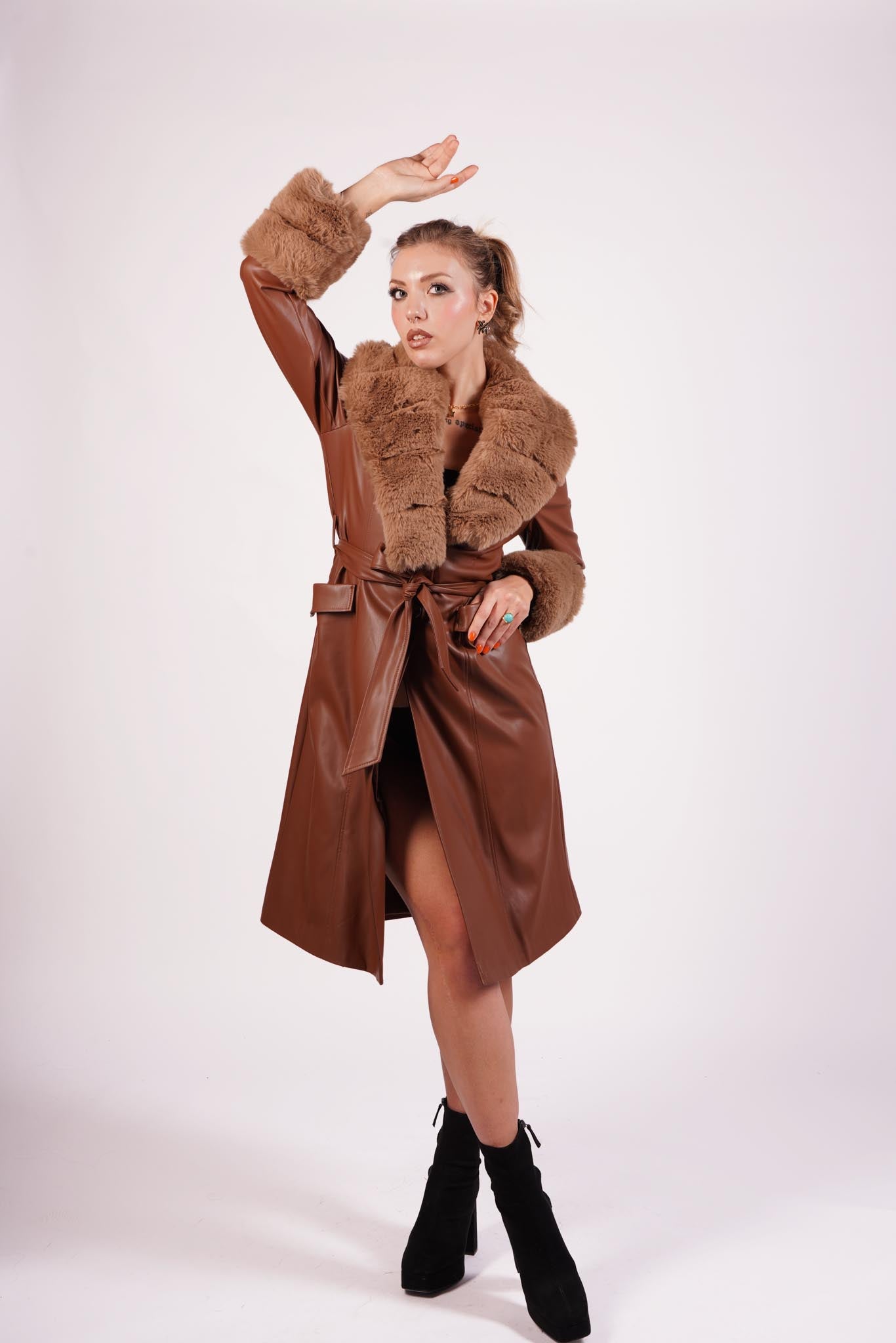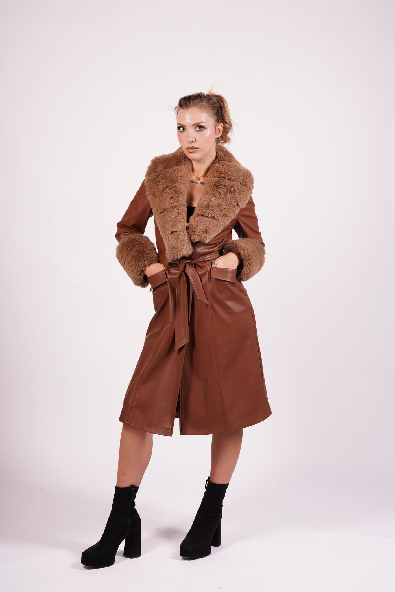 Make a bold fashion statement with the Brown Rebel Coat. This stunning coat features a rich brown leather-like material, complemented by a plush fur collar and fur cuffs. The coat has a belt tied around the waist, creating a fitted silhouette that falls just below the knees. Perfect for adding a touch of luxury to any outfit, this coat effortlessly combines style and sophistication.