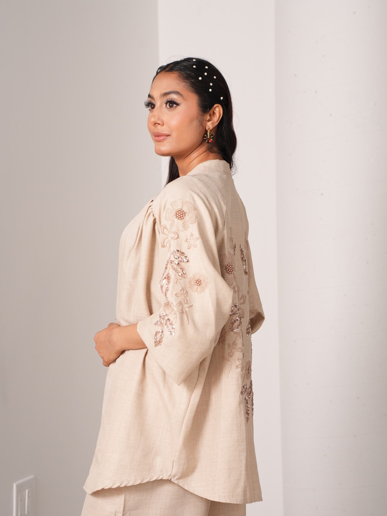 Embrace understated luxury with this beige camomile coord set, where comfort meets quiet sophistication. Inspired by the gentle charm of camomile blossoms, the set features a breezy open-front cardigan layered over tailored pants. But the true charm lies in the back: delicate camomile-inspired embroidery intertwined with shimmering sequin work, creating a quiet statement that catches the light and the eye.