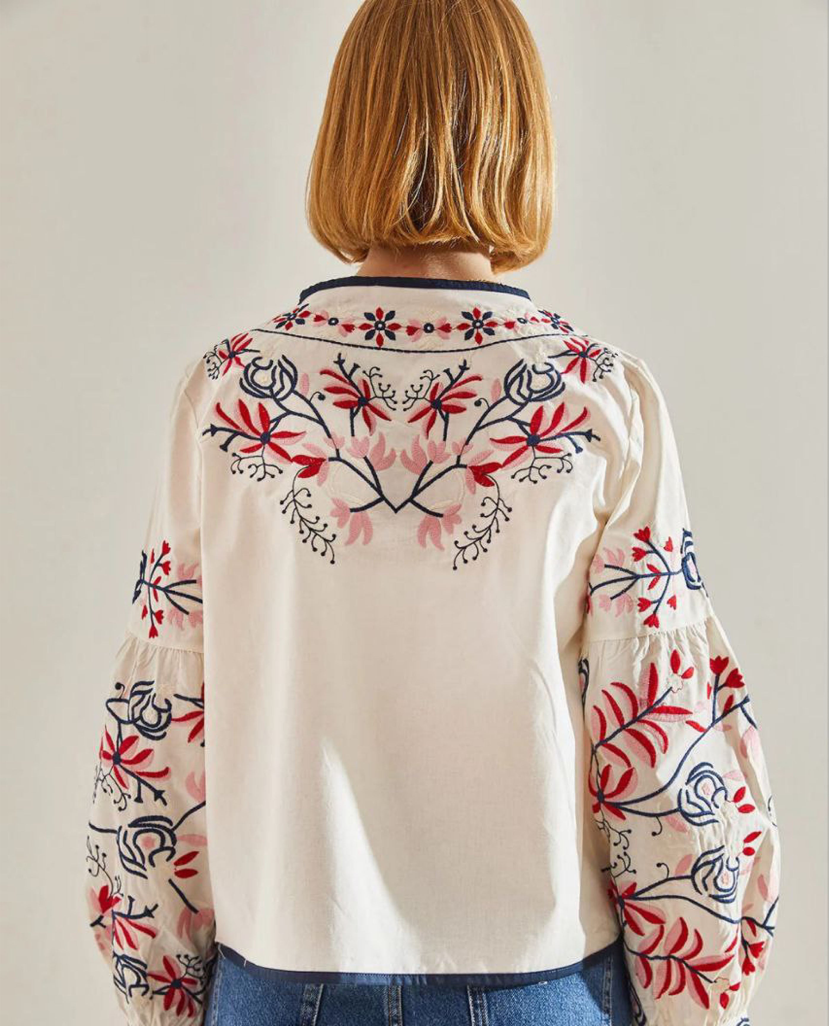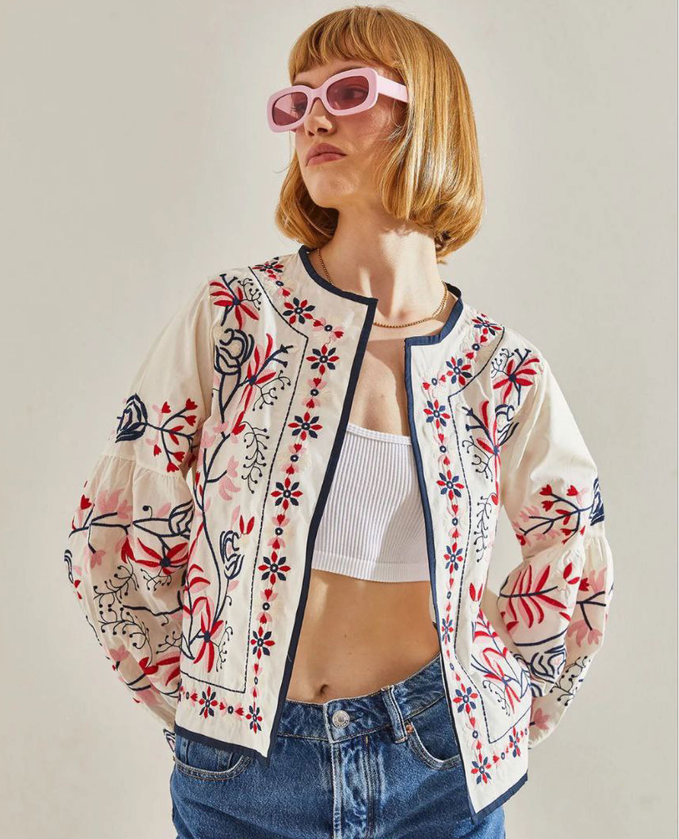 Infuse your wardrobe with a burst of color and charm with our “Cherry Berry” outerwear. This delightful off-white piece is adorned with vibrant multi-colored embroidery, creating a captivating and joyful look.