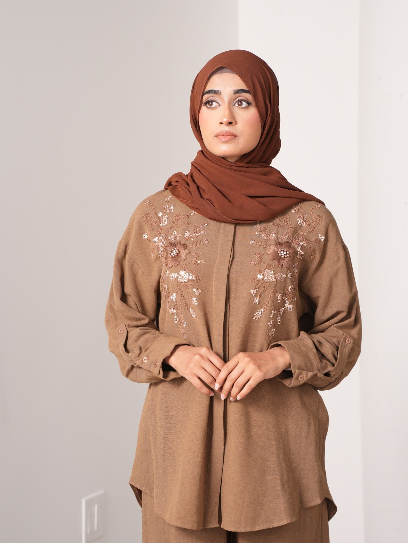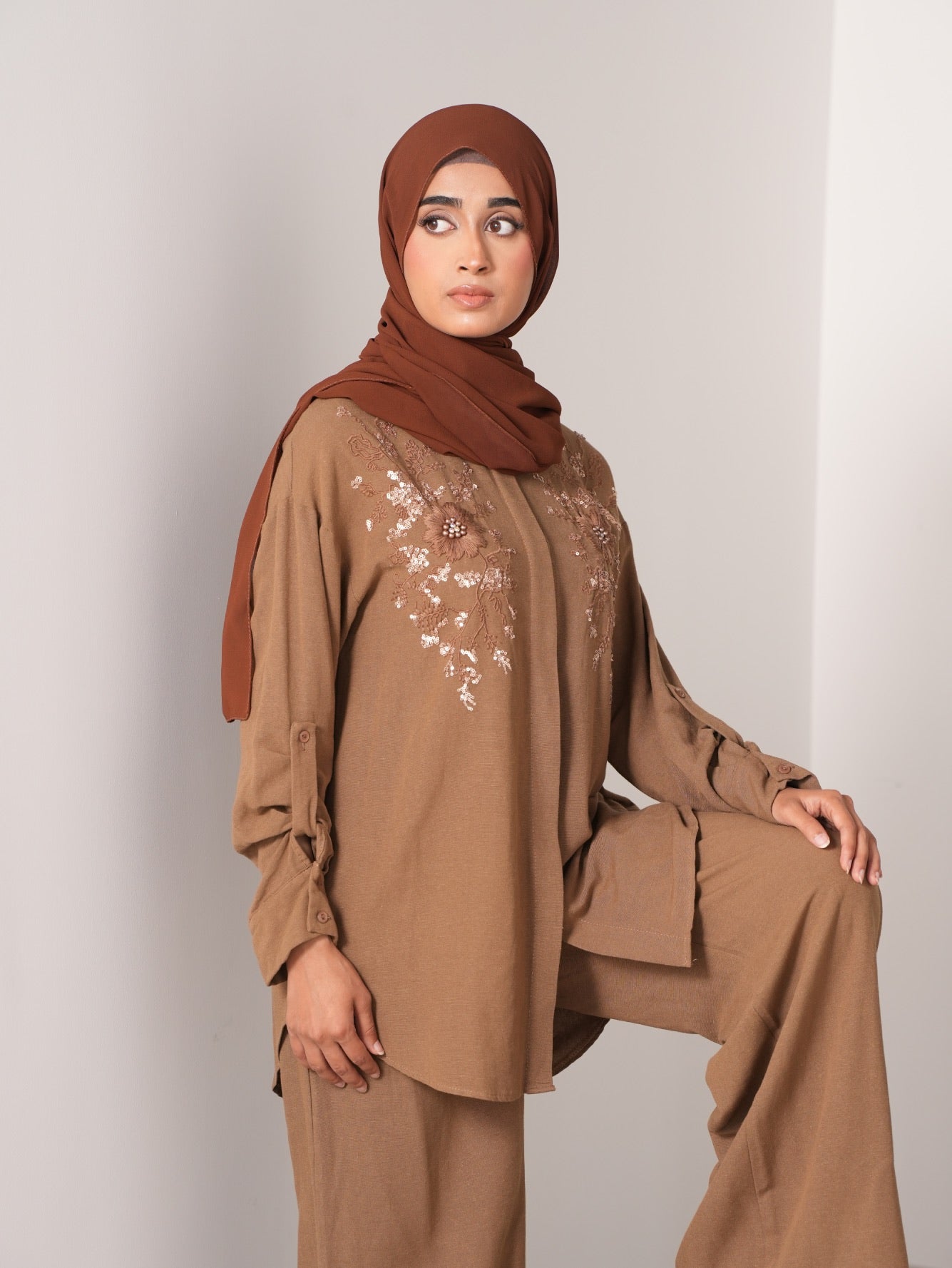 Step into effortless elegance with the Chestnut Flow Coord Set, a perfect blend of earthy warmth and subtle sparkle. Crafted in a rich chestnut hue, this two-piece ensemble features a delicately embroidered top with a soft shimmer of sequins that catch the light with every move. The matching pants offer comfort without compromising style, complete with a flattering elastic waistband and practical pockets for everyday ease.