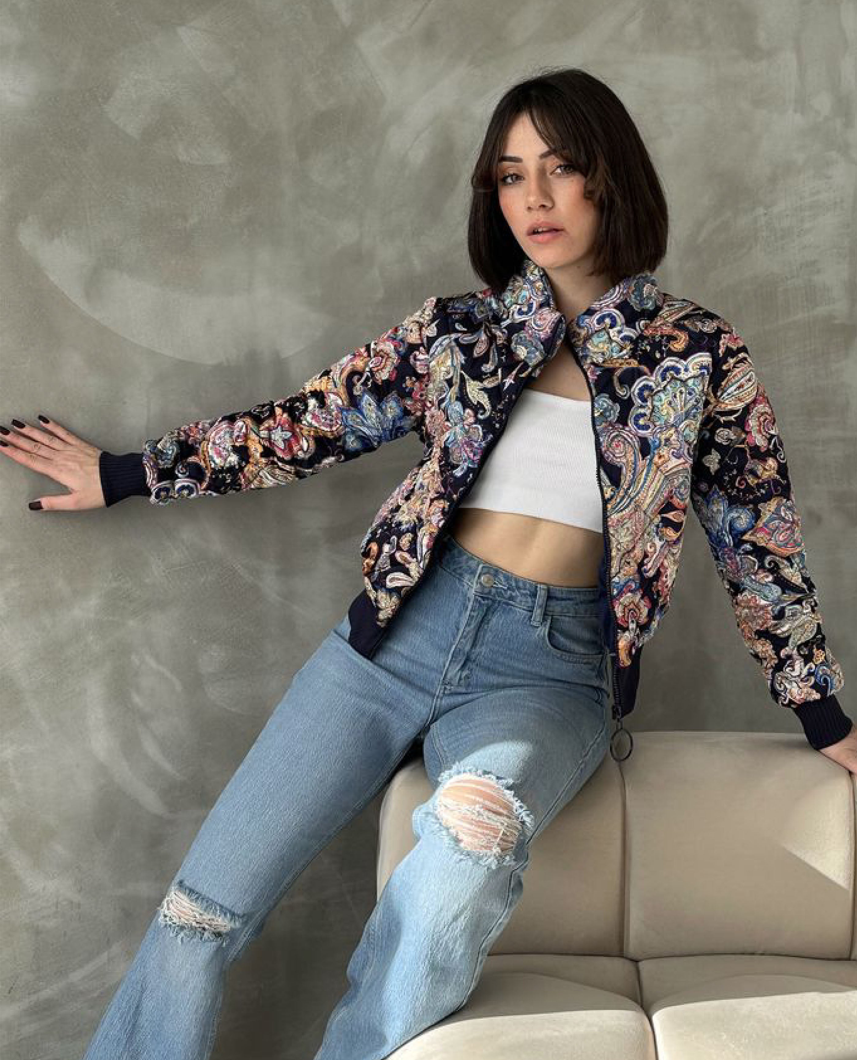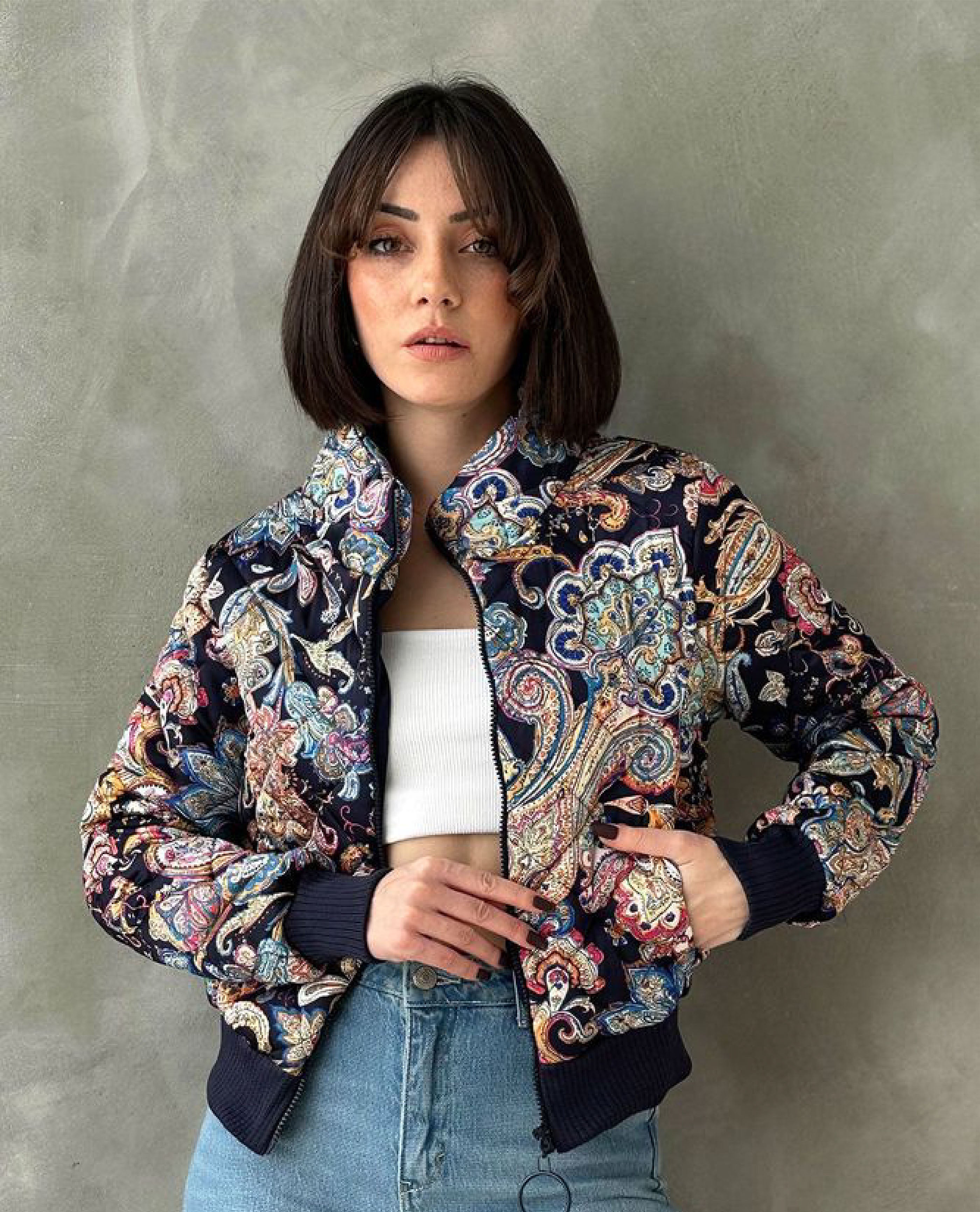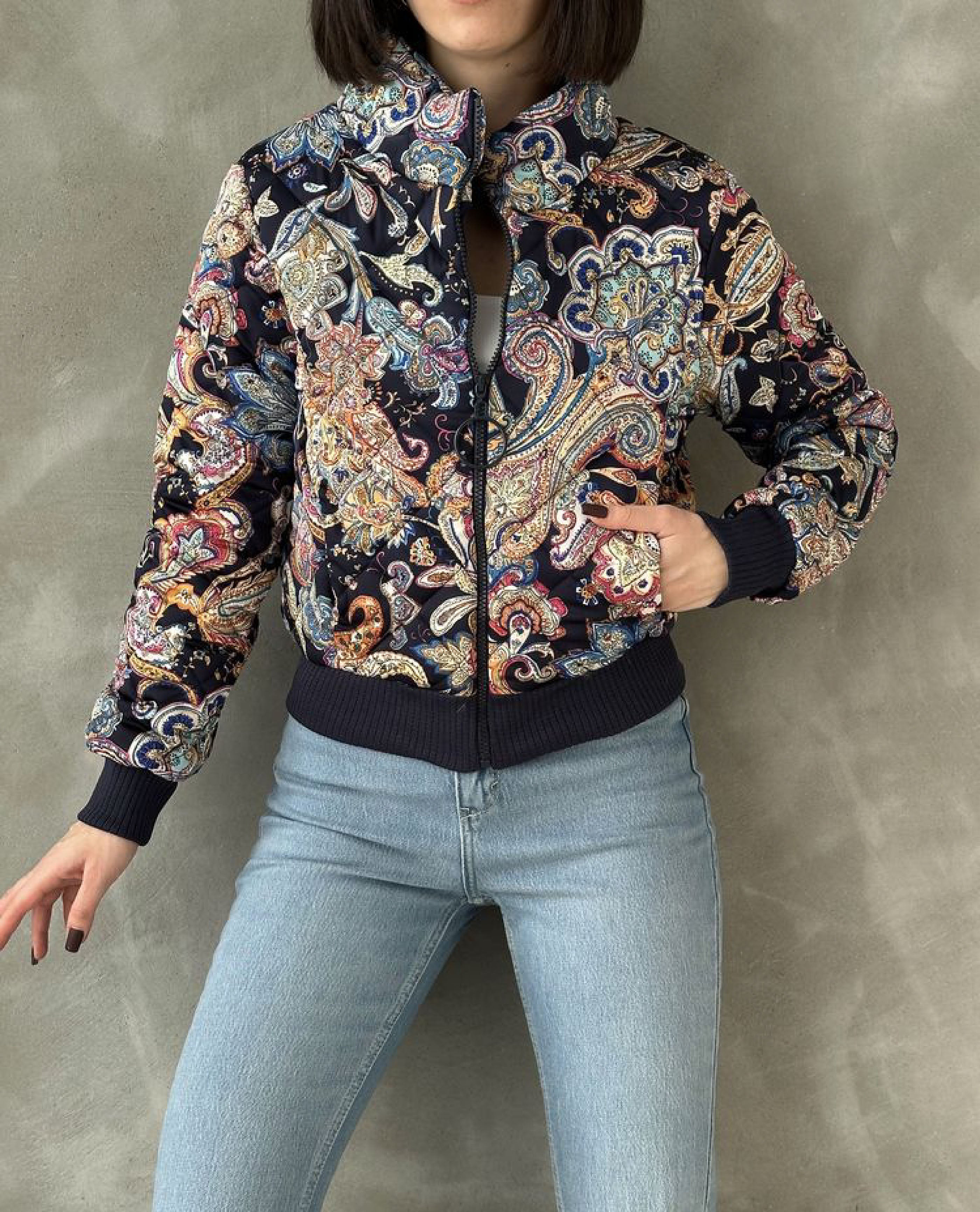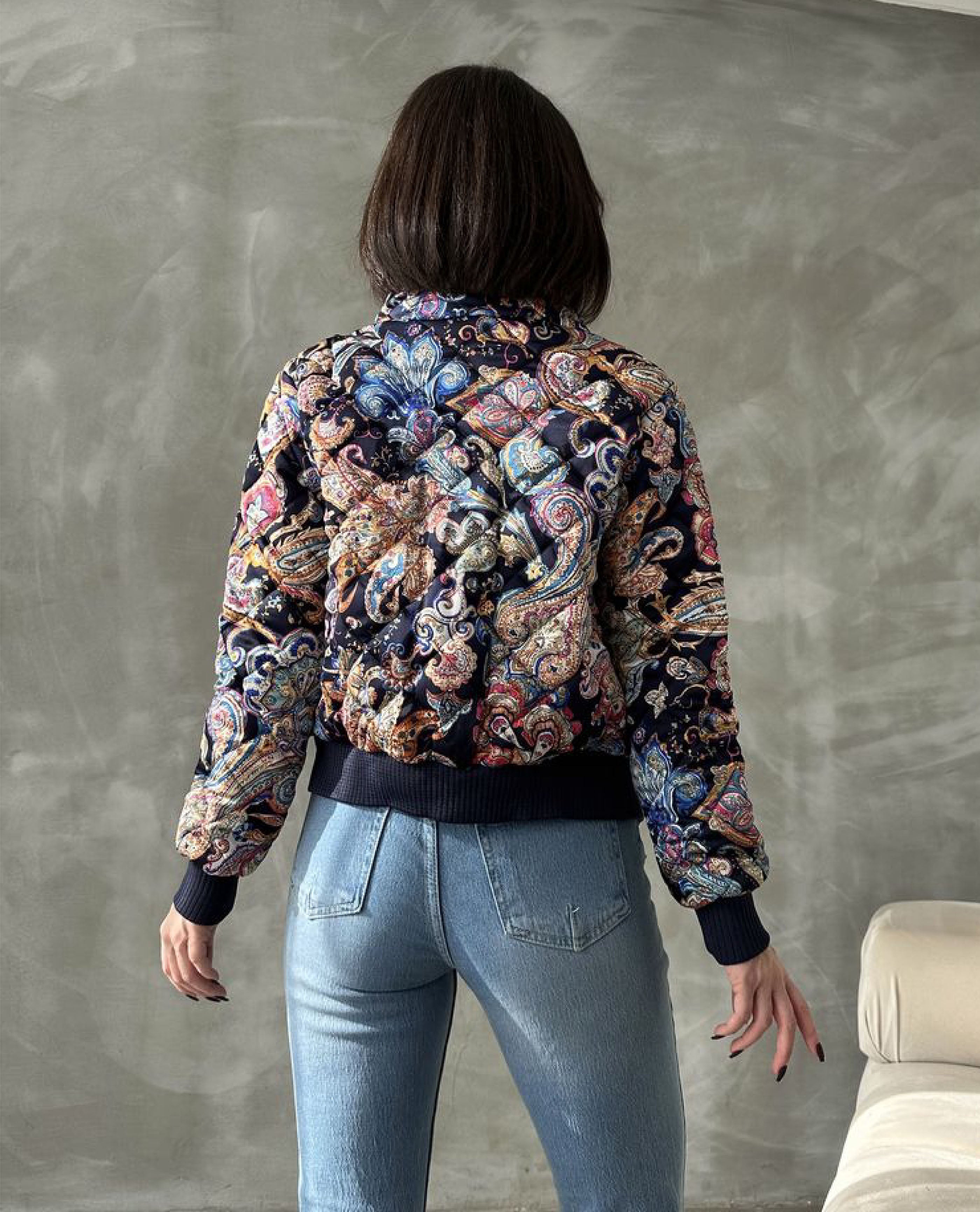 Step into sophistication with the Eclipse Charm Jacket. This stunning dark blue silk jacket, which can appear almost black, features intricate floral patterns that add a touch of elegance. Filled with polyester for warmth, this lightweight, short jacket is perfect for layering. The sleek zipper closure ensures a snug and stylish fit.