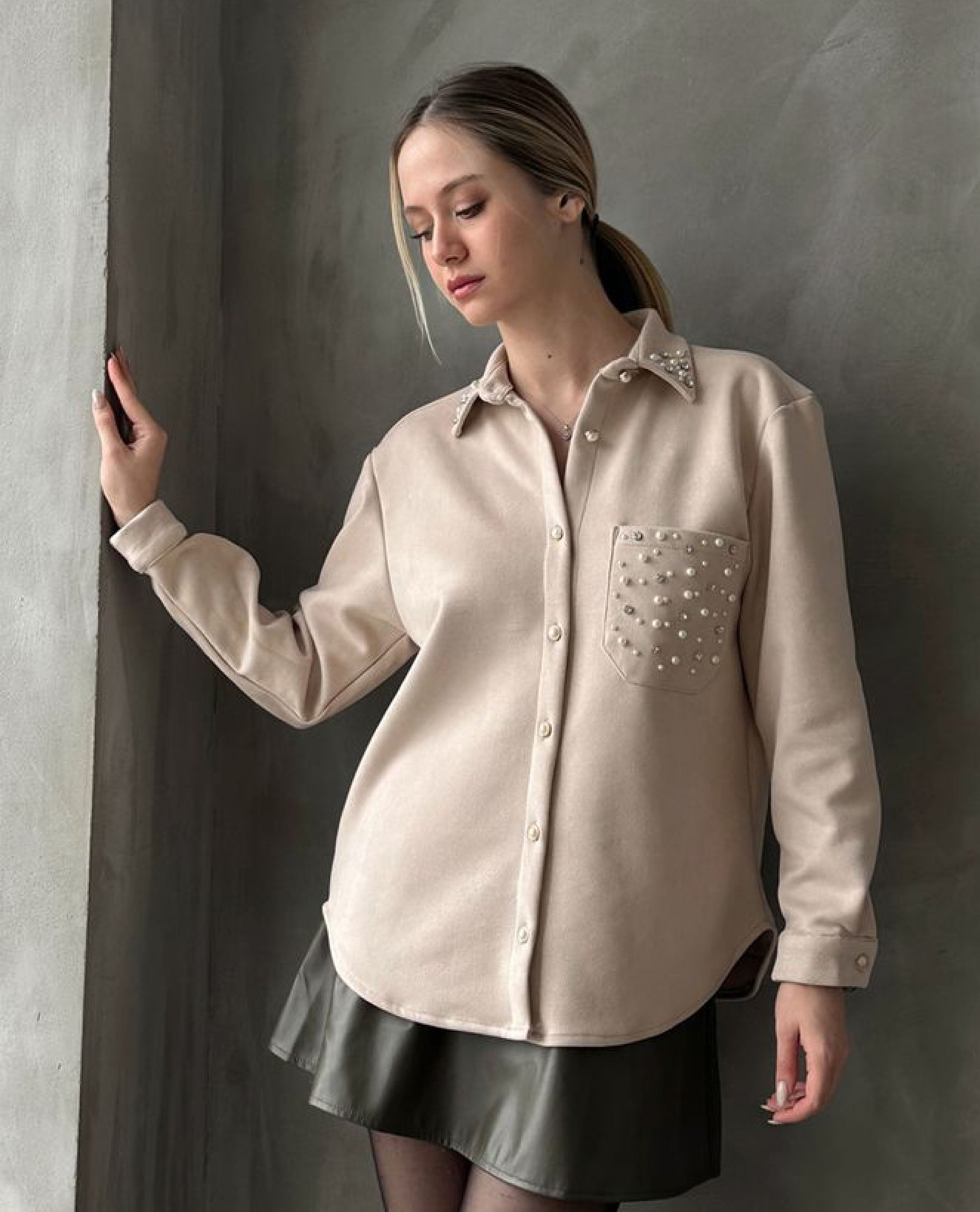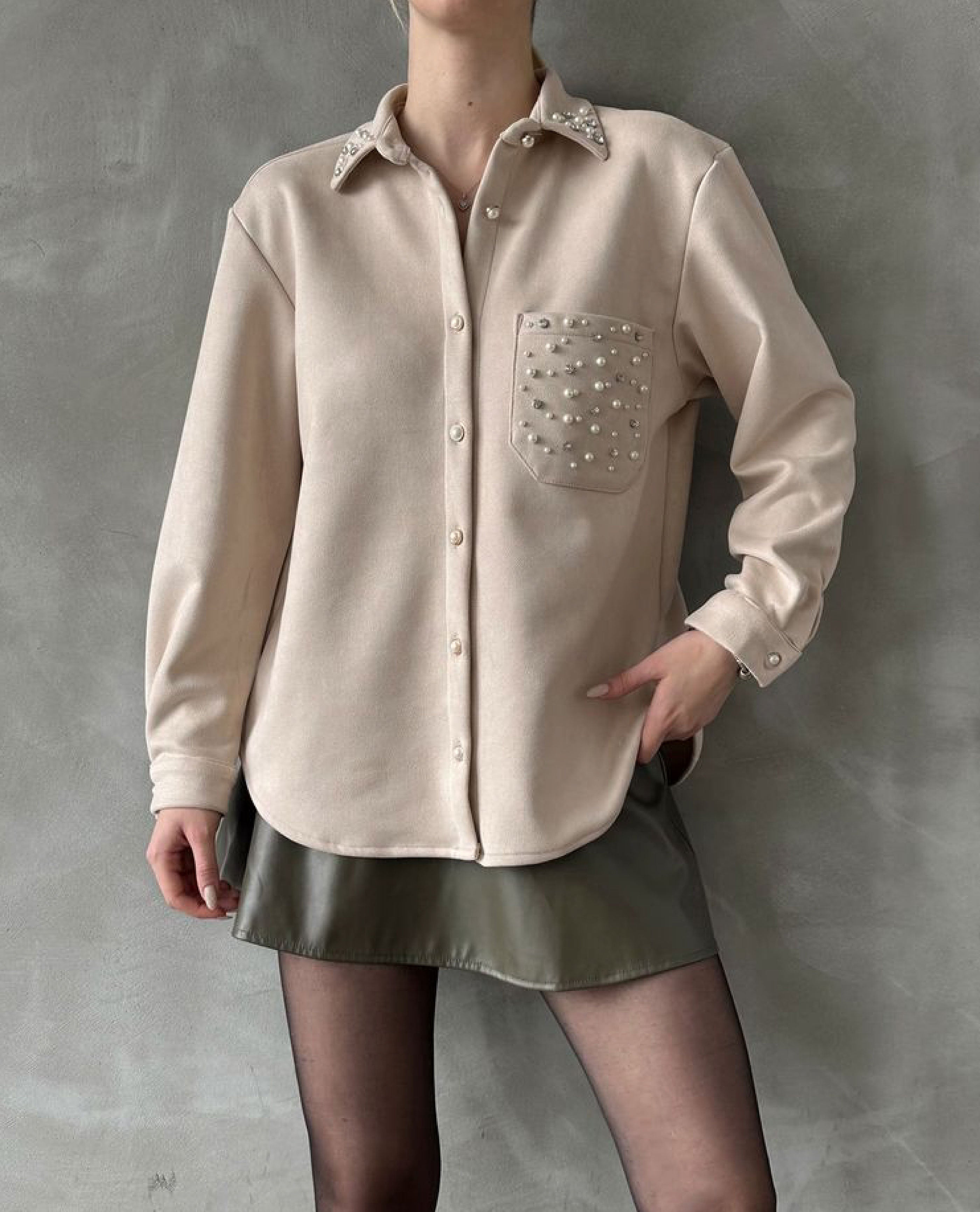Add a touch of elegance to your wardrobe with this stunning beige warm shirt, adorned with delicate pearl embellishments. The classic collar and cuffs, each featuring pearl buttons, elevate this piece to a new level of sophistication. Pair this versatile shirt with your favorite jeans or with a skirt for a more polished ensemble.