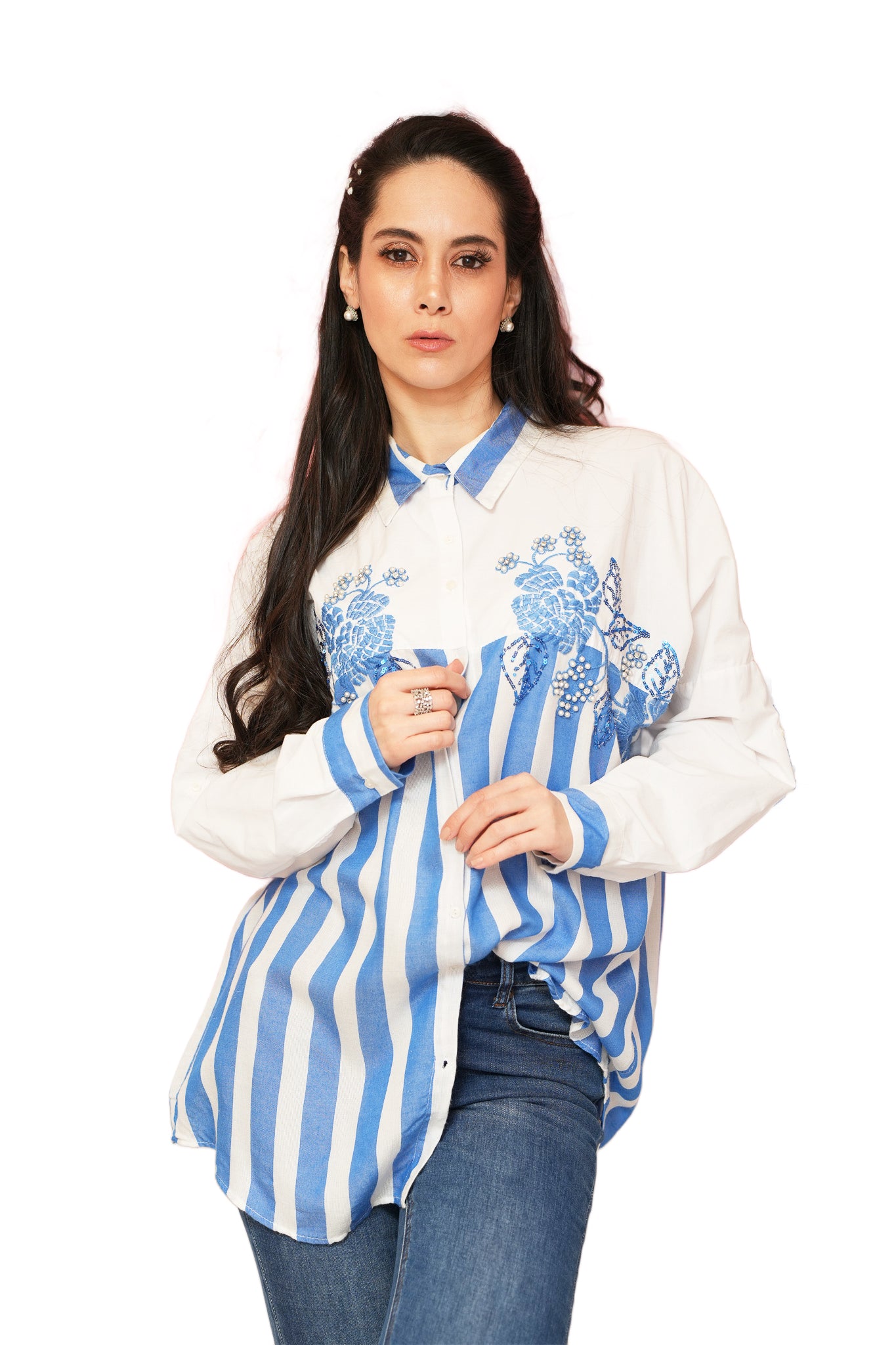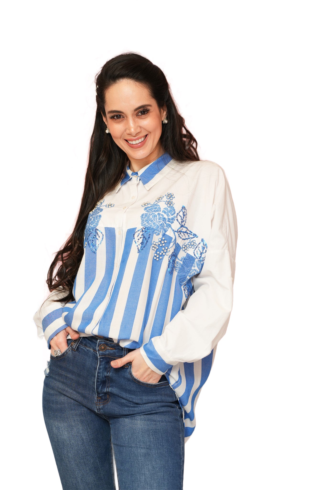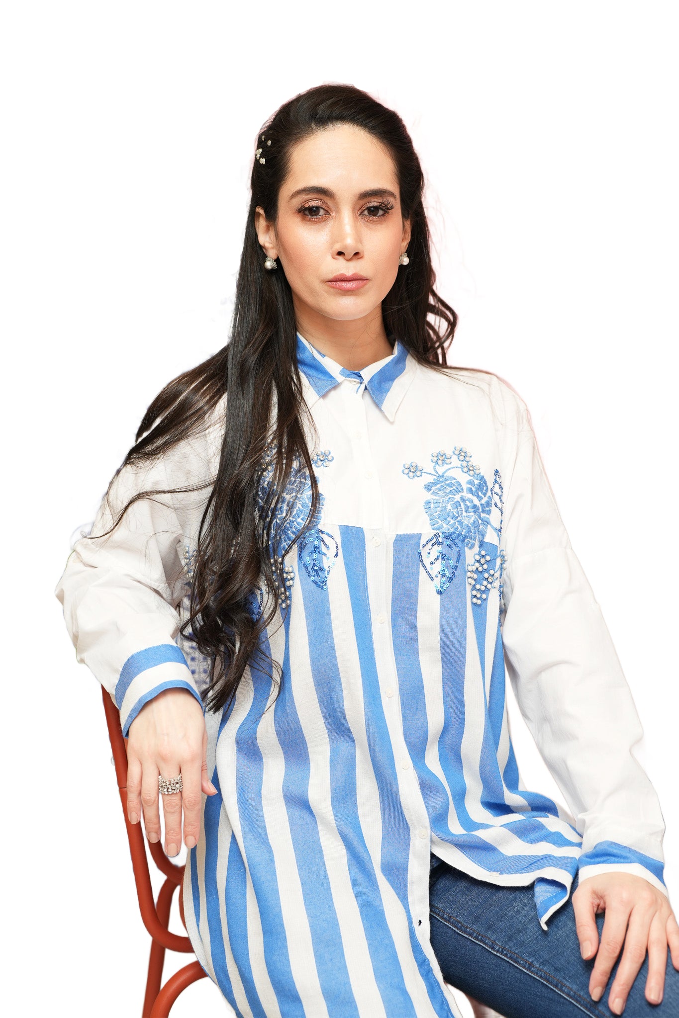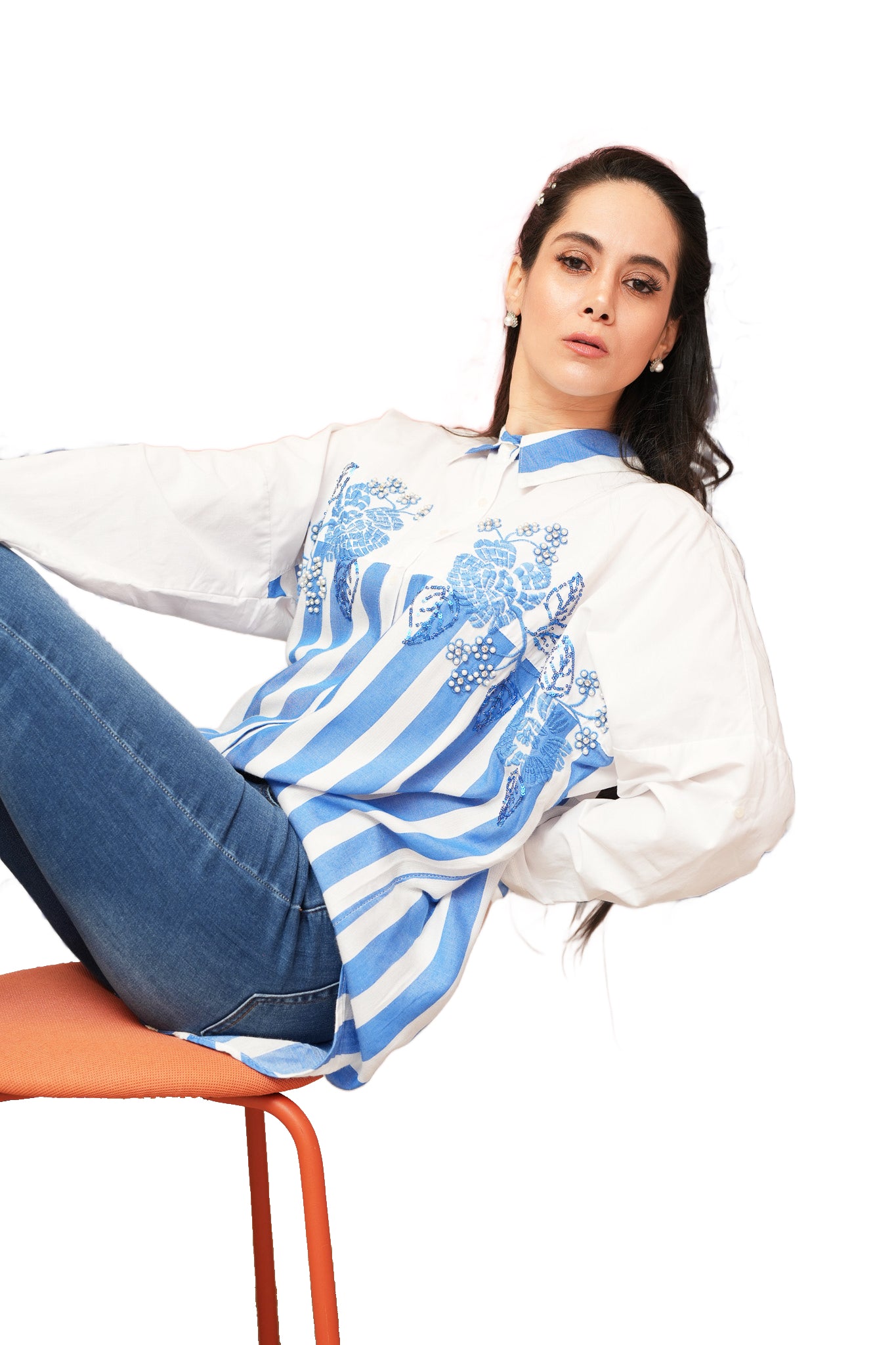 The Indigo Bloom Shirt is a beautifully crafted piece that blends timeless stripes with elegant embroidery. This white and blue striped button-up shirt features intricate blue floral embroidery across the upper chest and shoulders, adding a touch of artistry and sophistication. The classic collar and button-down design provide a polished look, while the lightweight fabric ensures all-day comfort. Perfect for casual outings or semi-formal occasions, this shirt effortlessly combines style and versatility.