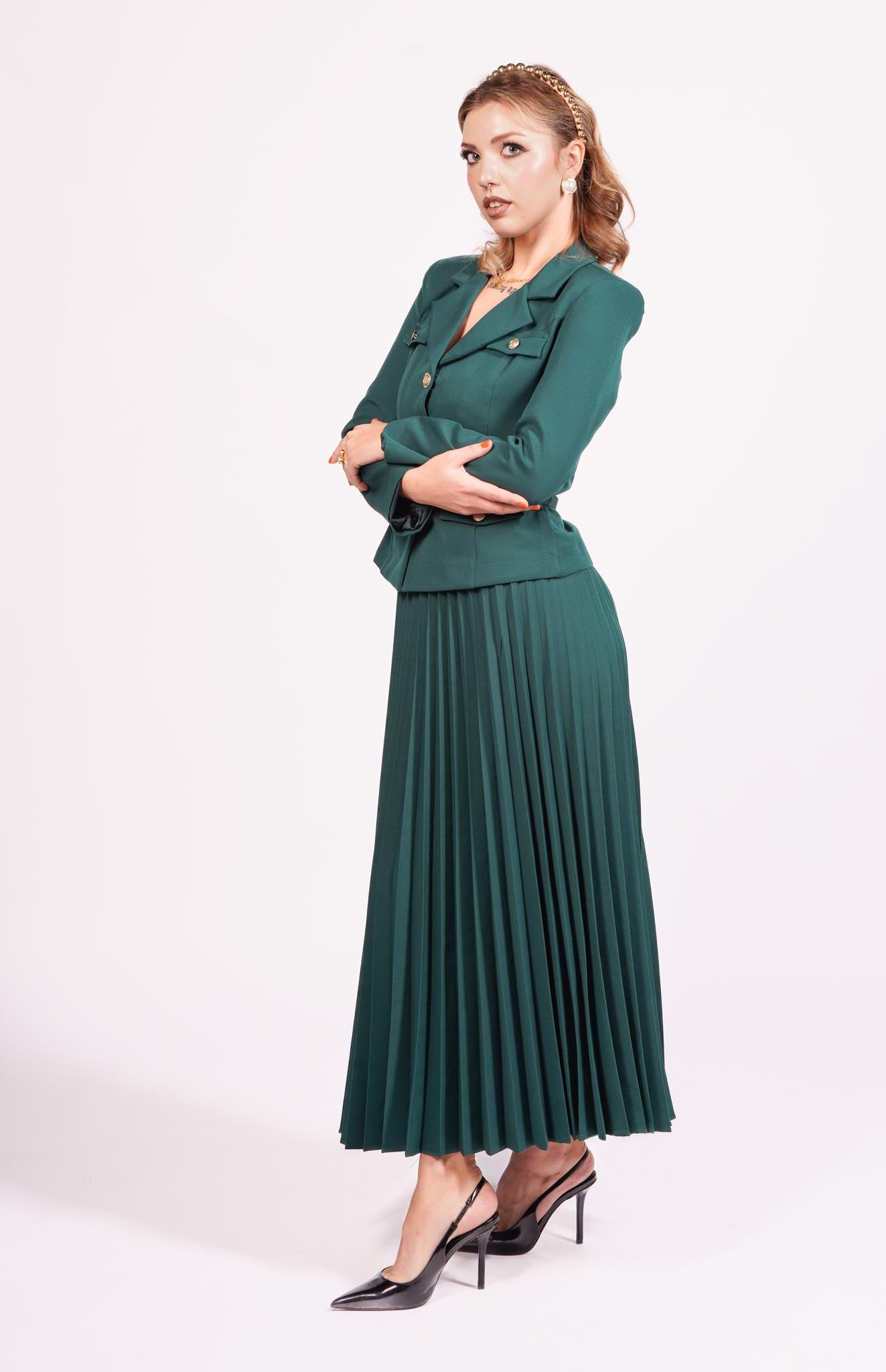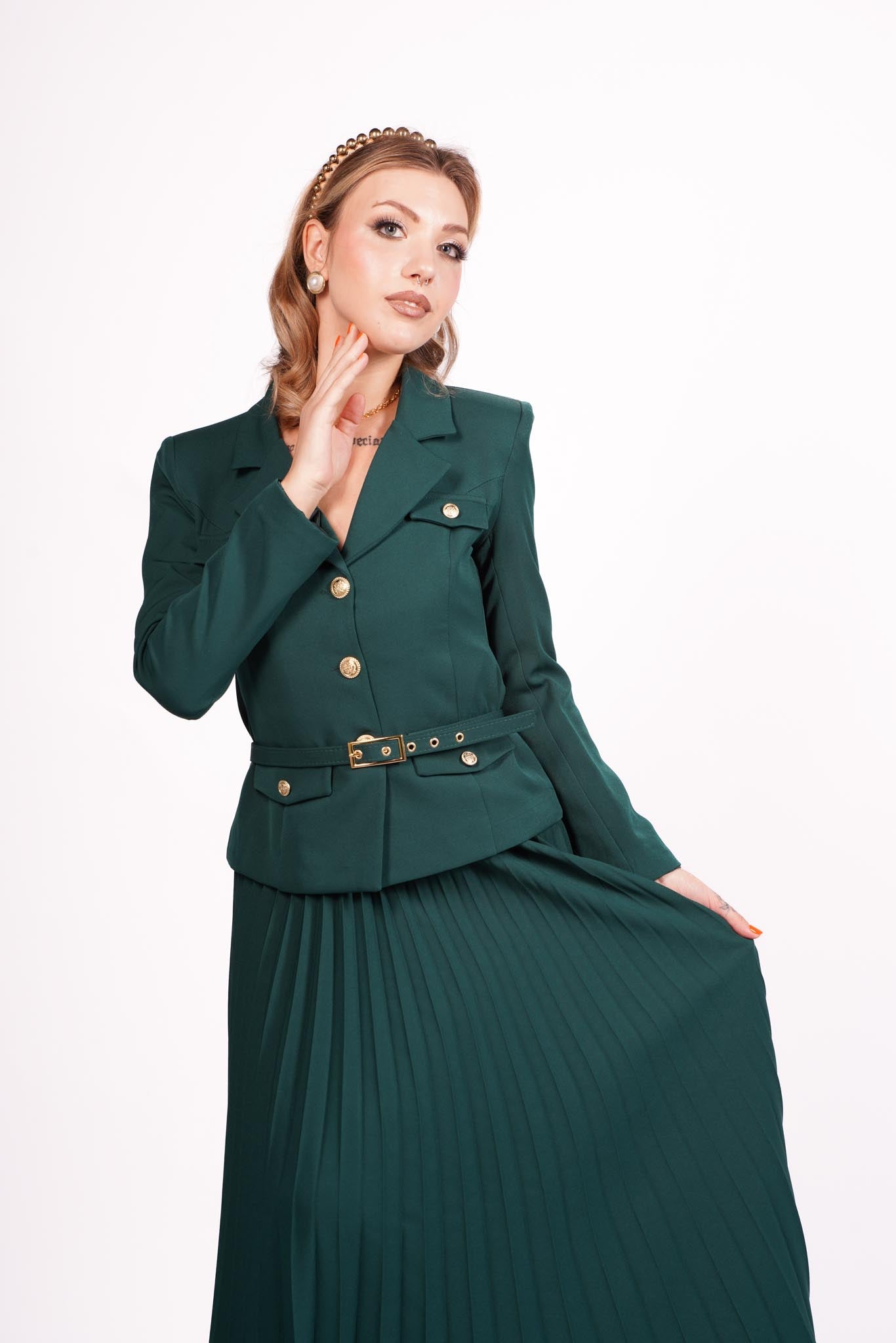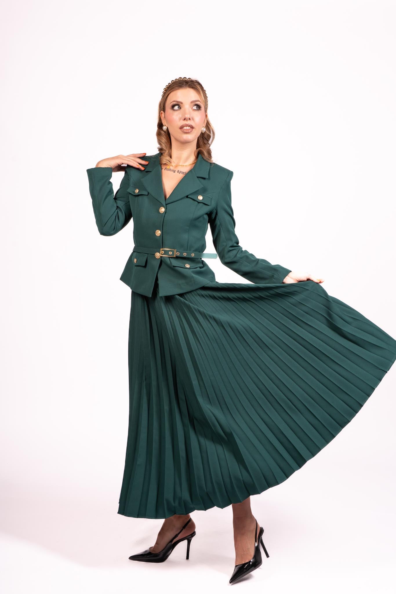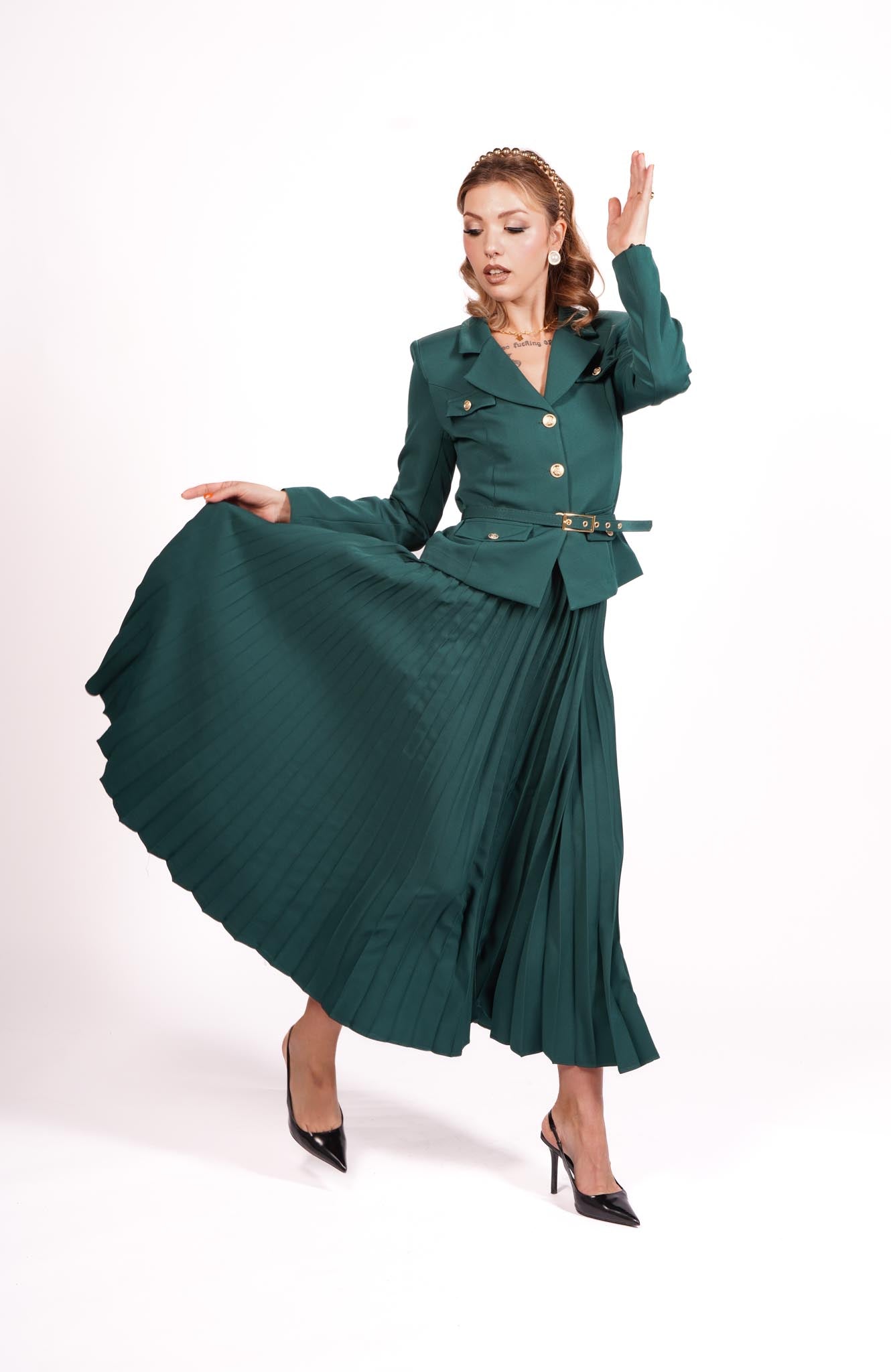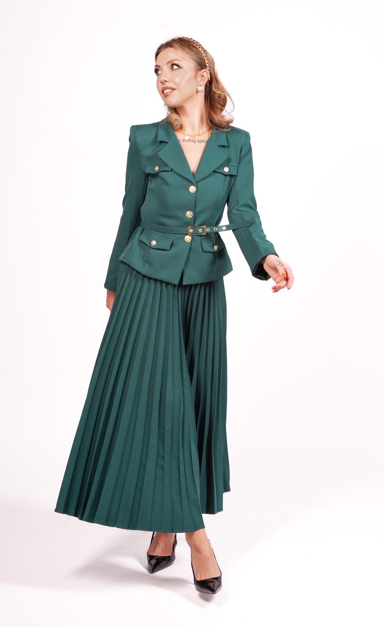 Step out in sophisticated style with the Jade Royale Skirt Set. This elegant ensemble features a long-sleeved blazer with gold buttons and a matching pleated skirt in a beautiful jade green hue. The blazer has a belted waist, adding a structured and polished look, while the pleated skirt offers a graceful flow. Perfect for both professional settings and stylish occasions, this set is designed to make a statement.