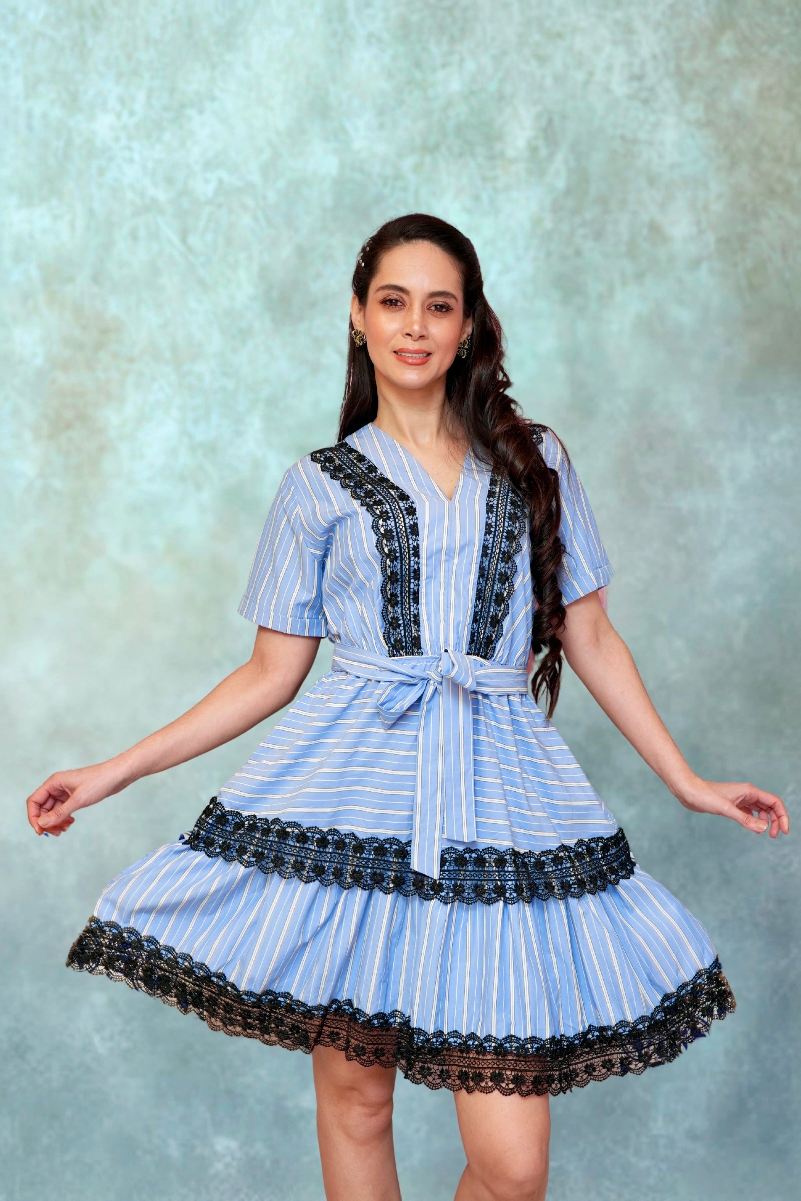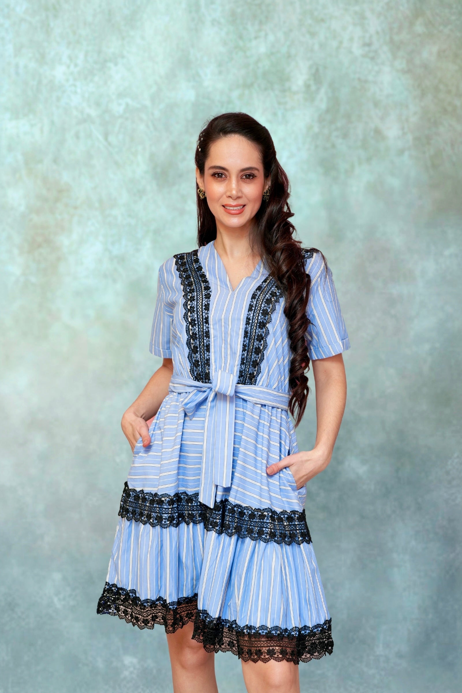 dreamy blend of charm and chic, Lace bloom is your go-to summer statement. With candy blue pinstripes and intricate black lace trims, this dress adds a playful yet polished edge to your wardrobe. The flowy silhouette, belted waist, and flared hem make it perfect for everything from brunches to breezy strolls.