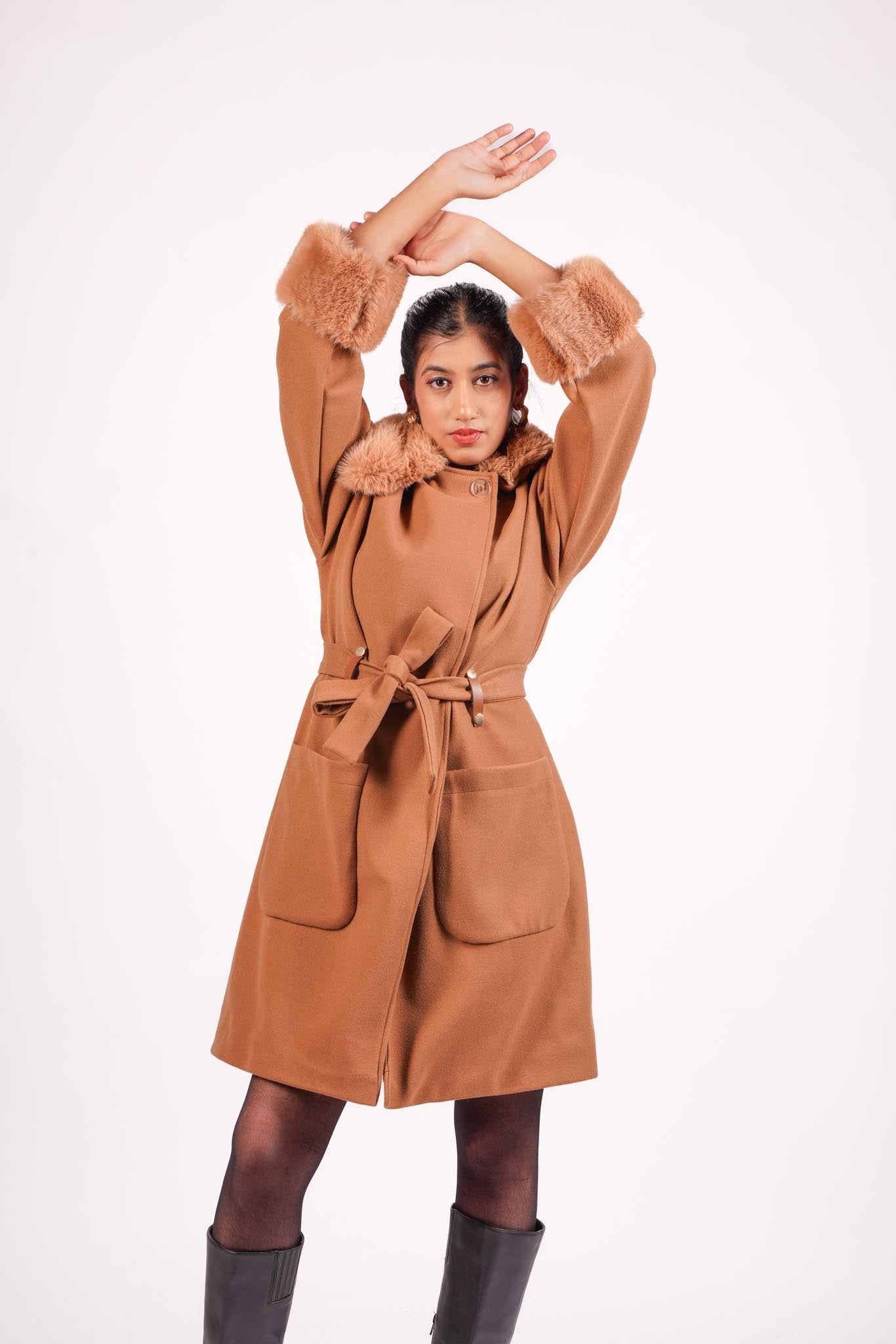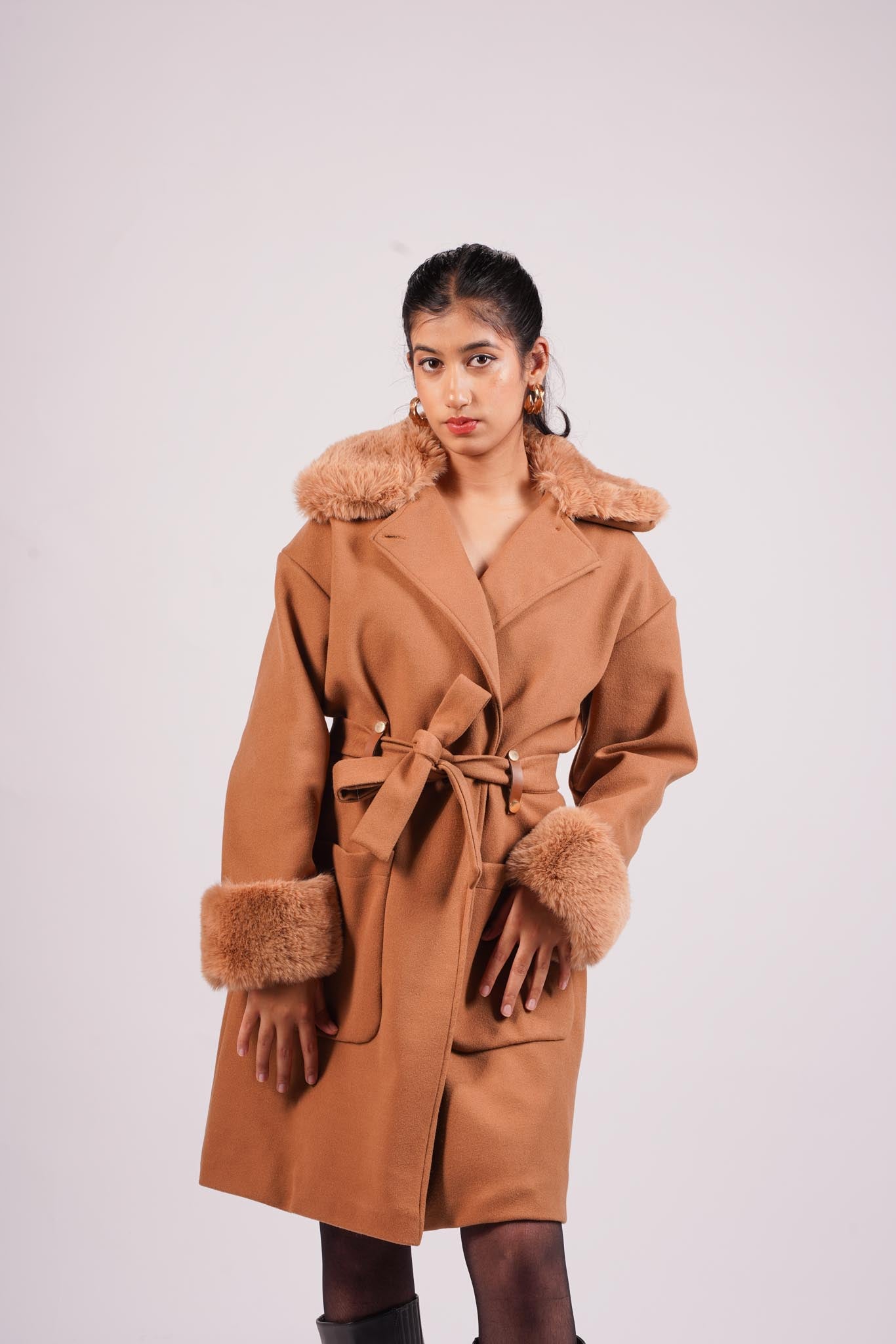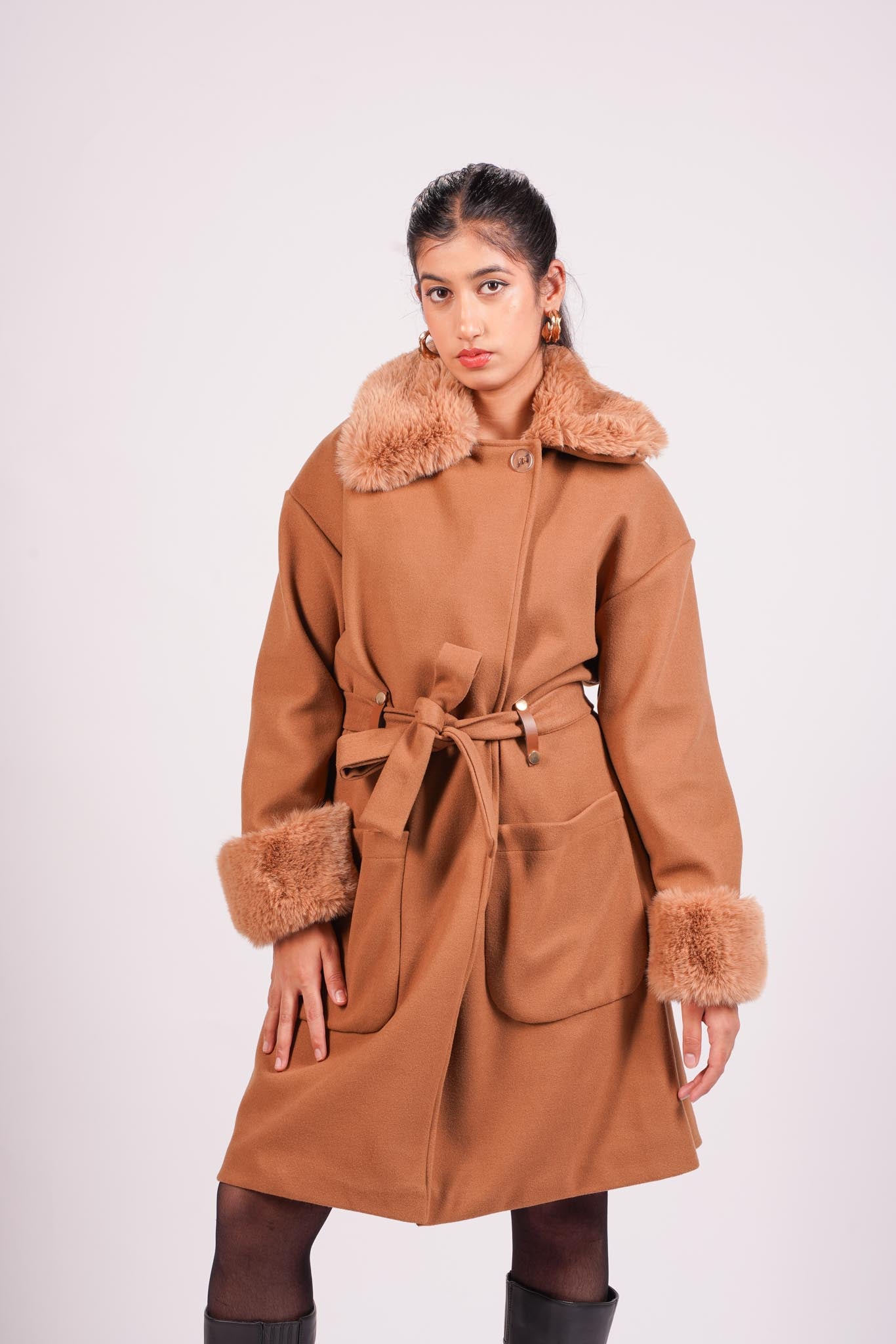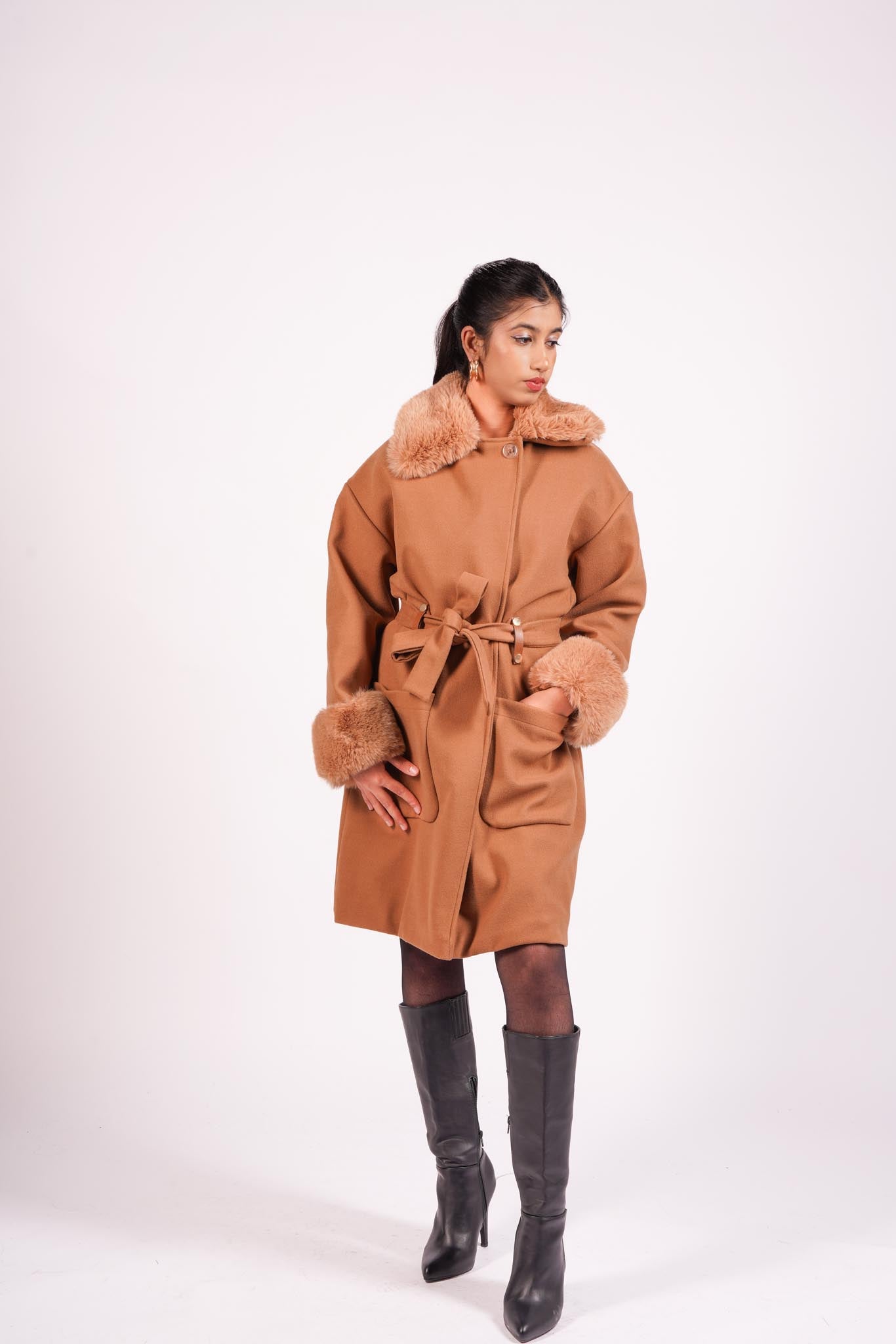 Embrace luxury and warmth with the Mocha Luxe Coat. This sophisticated coat features a rich mocha color and is adorned with a high collar trimmed with fur and fur-trimmed cuffs. The belted waist ensures a flattering fit, while the large front pockets add both style and functionality. Perfect for cold weather, this coat combines elegance and comfort seamlessly.