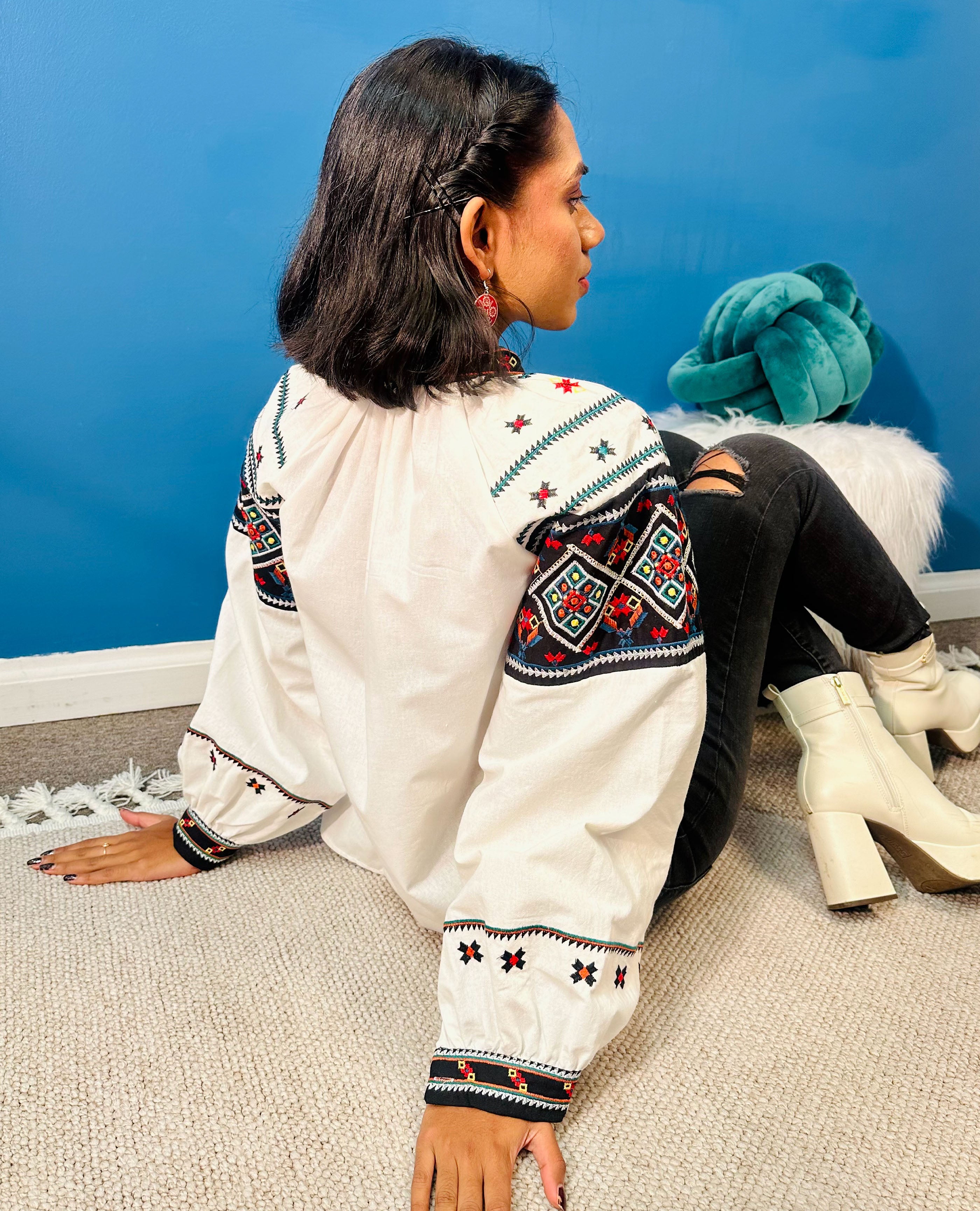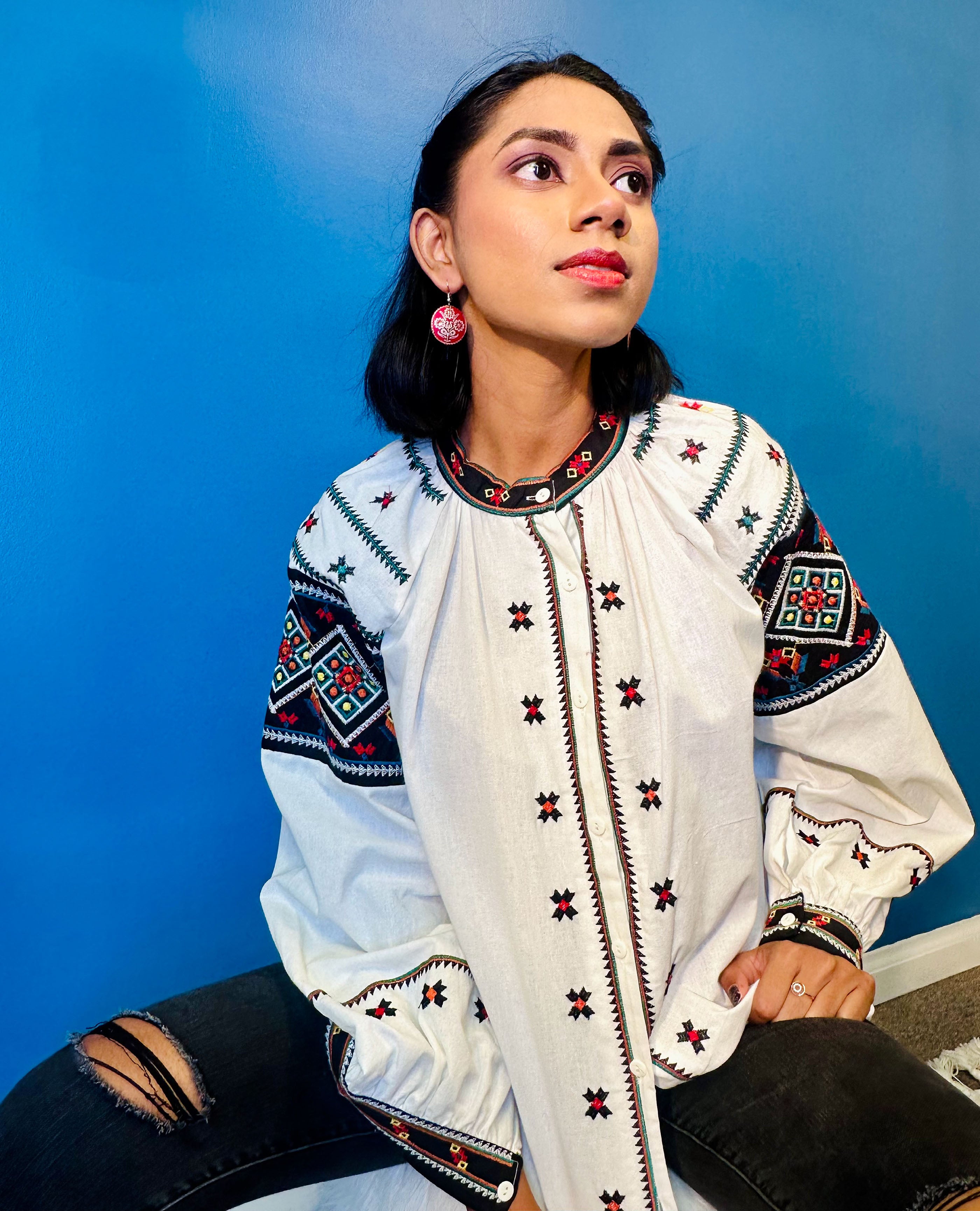 This enchanting piece features a loose fit and puffy sleeves, offering both comfort and style. The delicate embroidery on the sleeves adds a touch of elegance, making it a standout addition to your wardrobe.