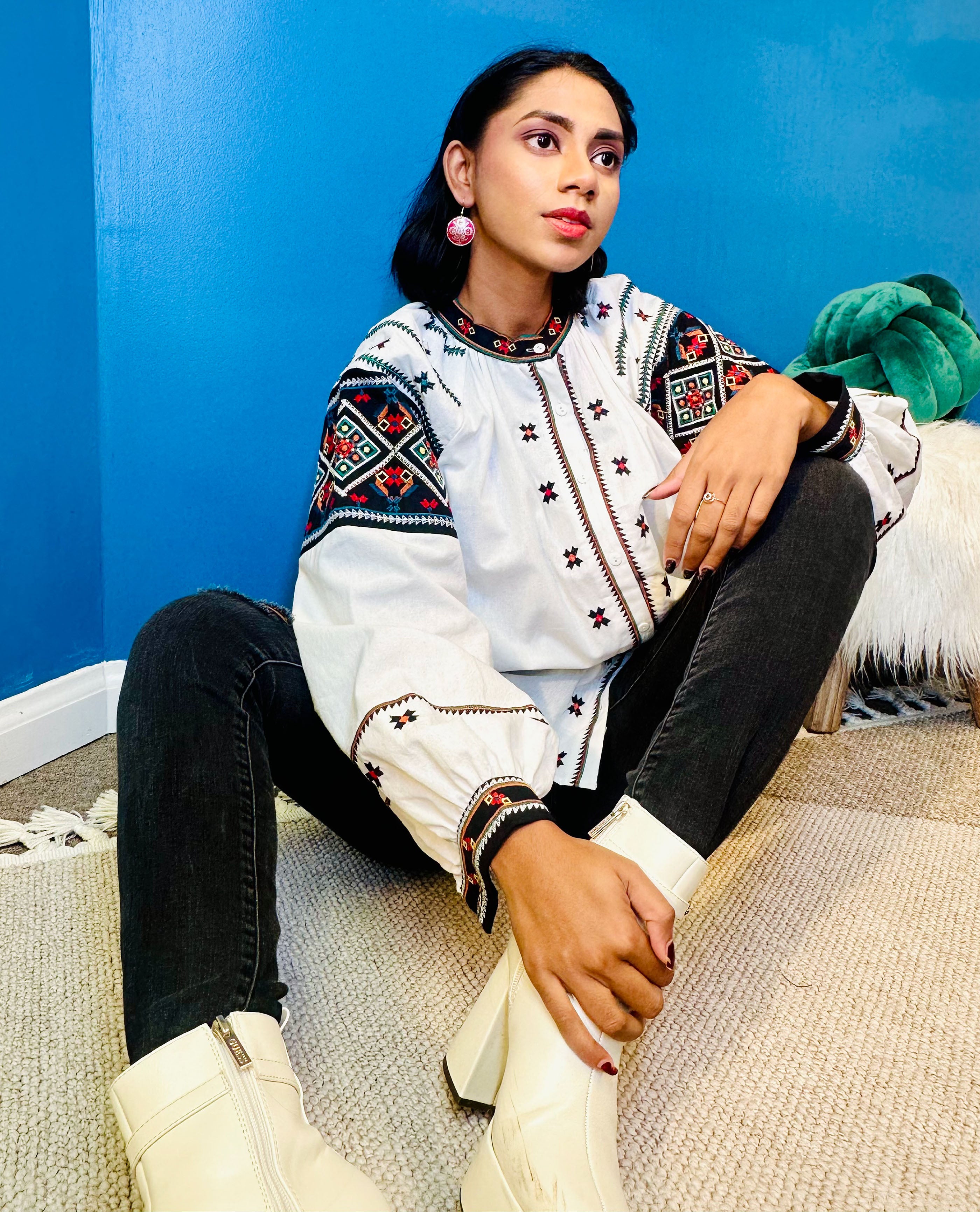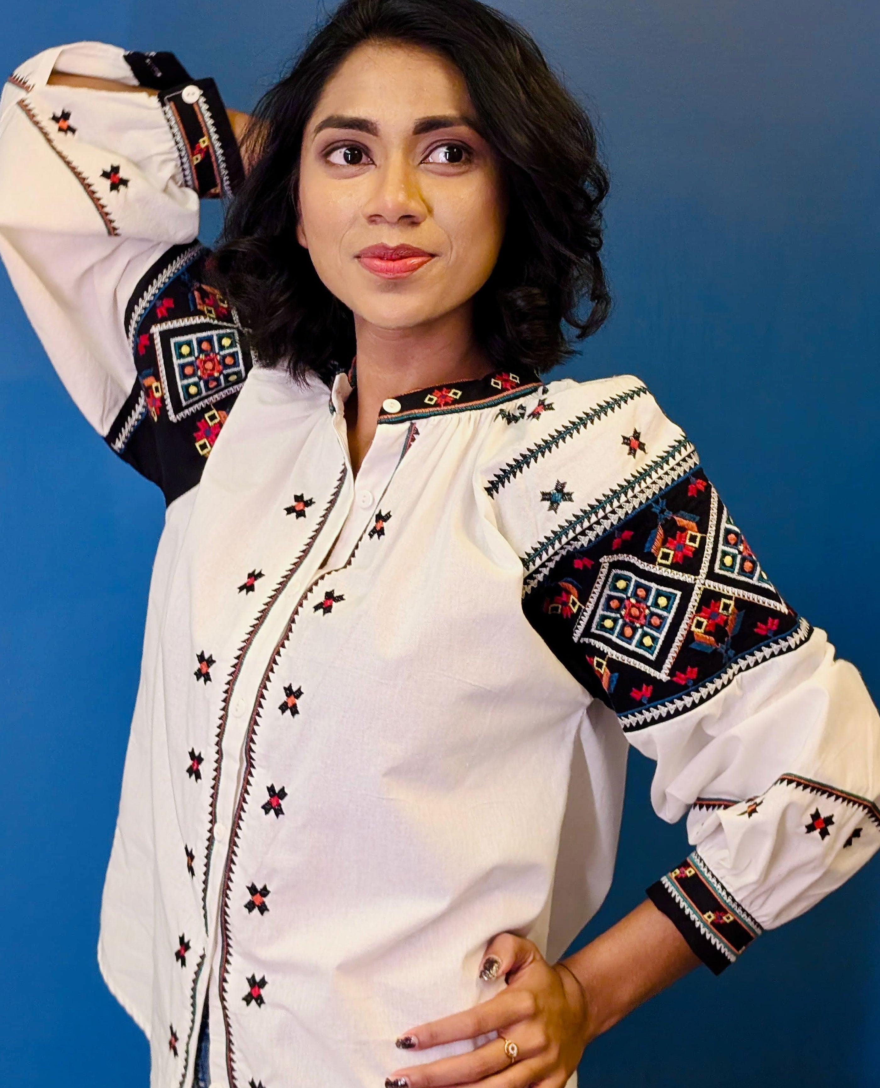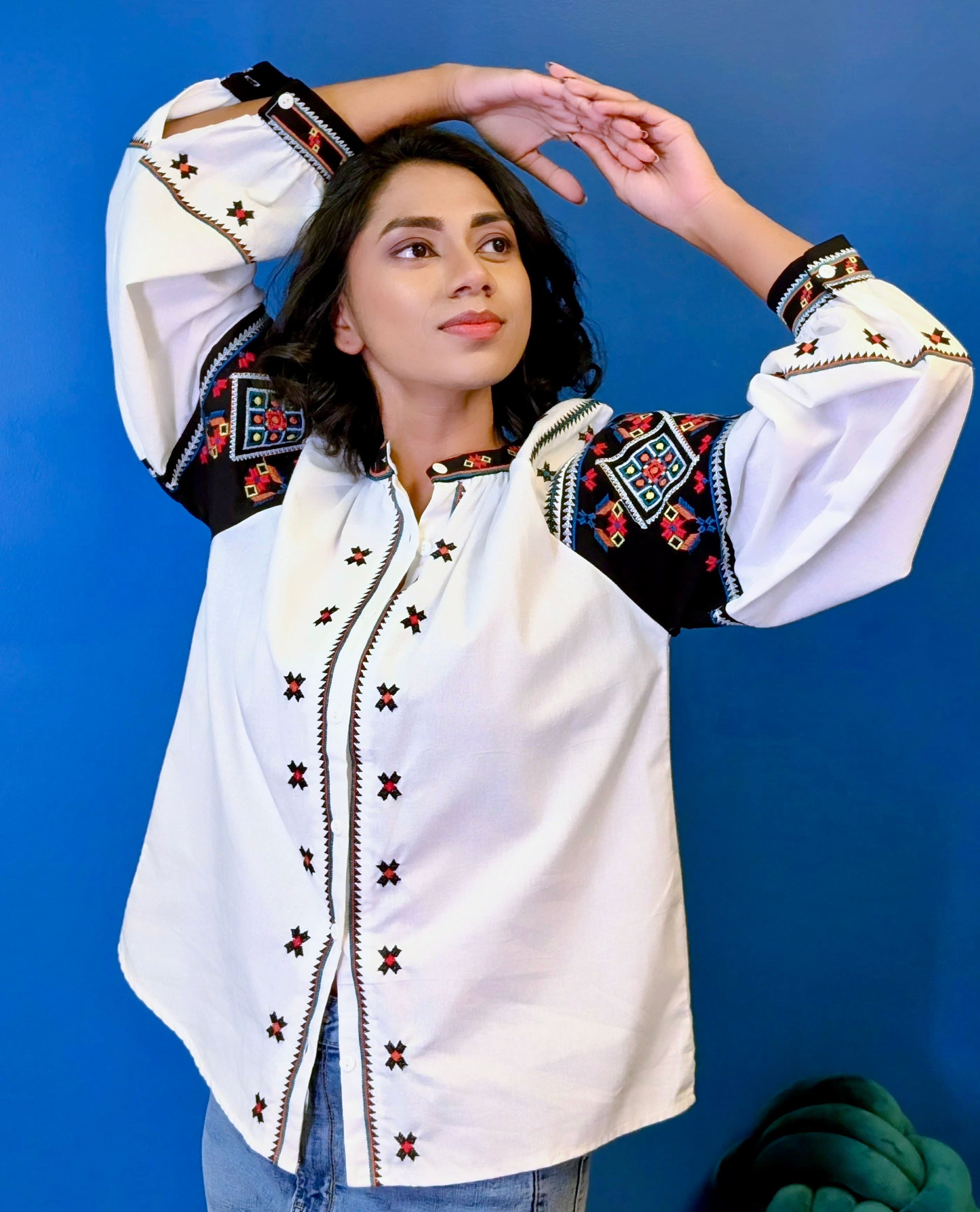 Design: The “Moonlight Meadow” shirt boasts a relaxed, loose fit with voluminous puffy sleeves that are beautifully embroidered. The intricate floral patterns on the sleeves create a stunning contrast against the solid base, adding a whimsical and sophisticated touch.
