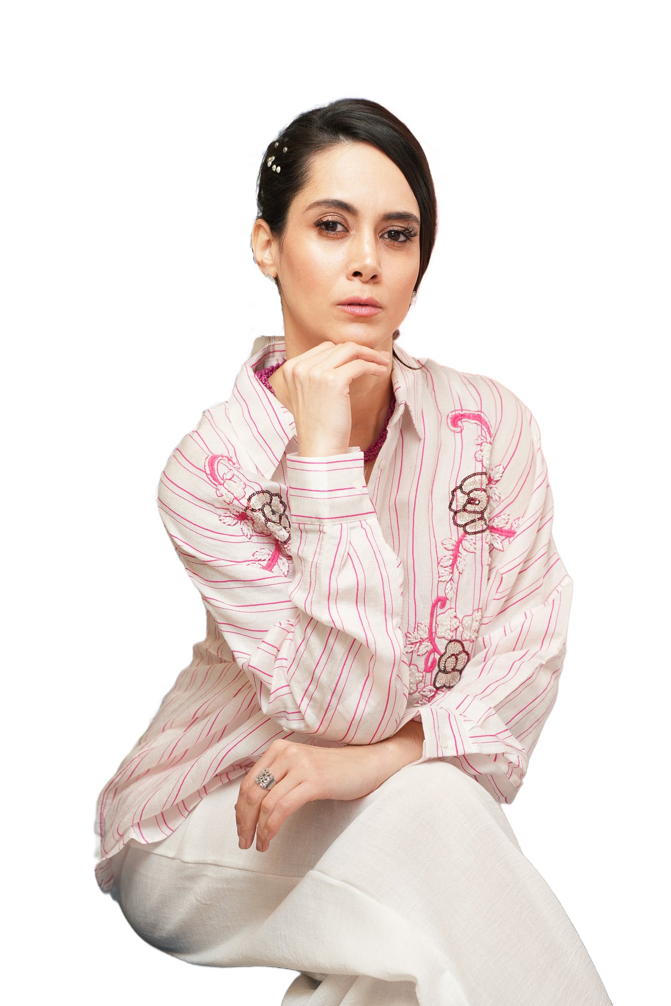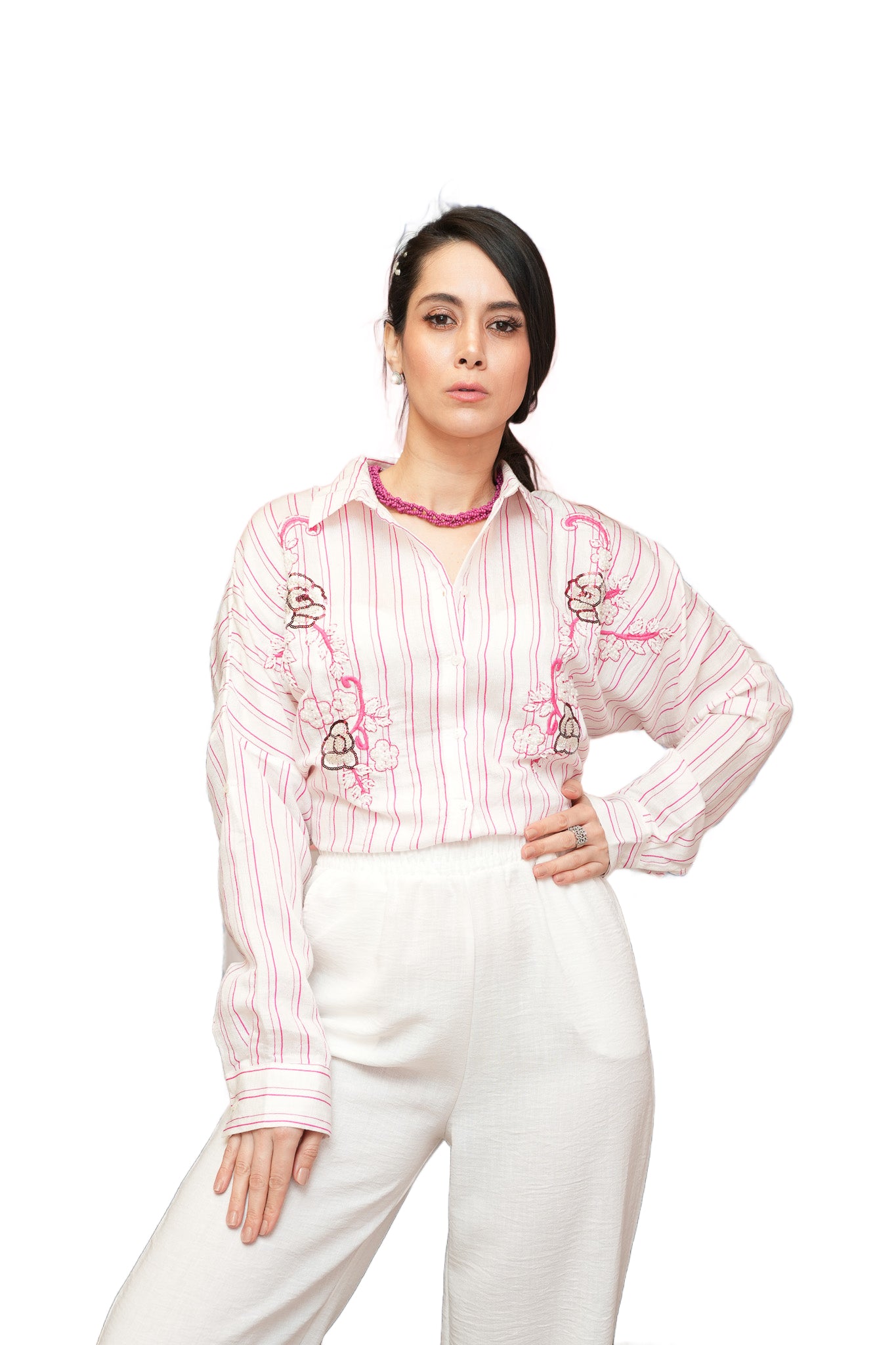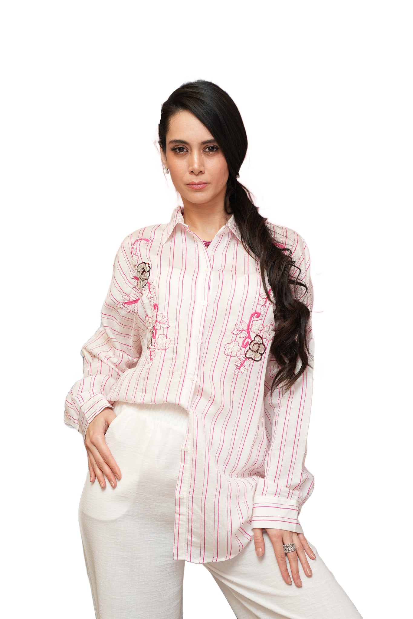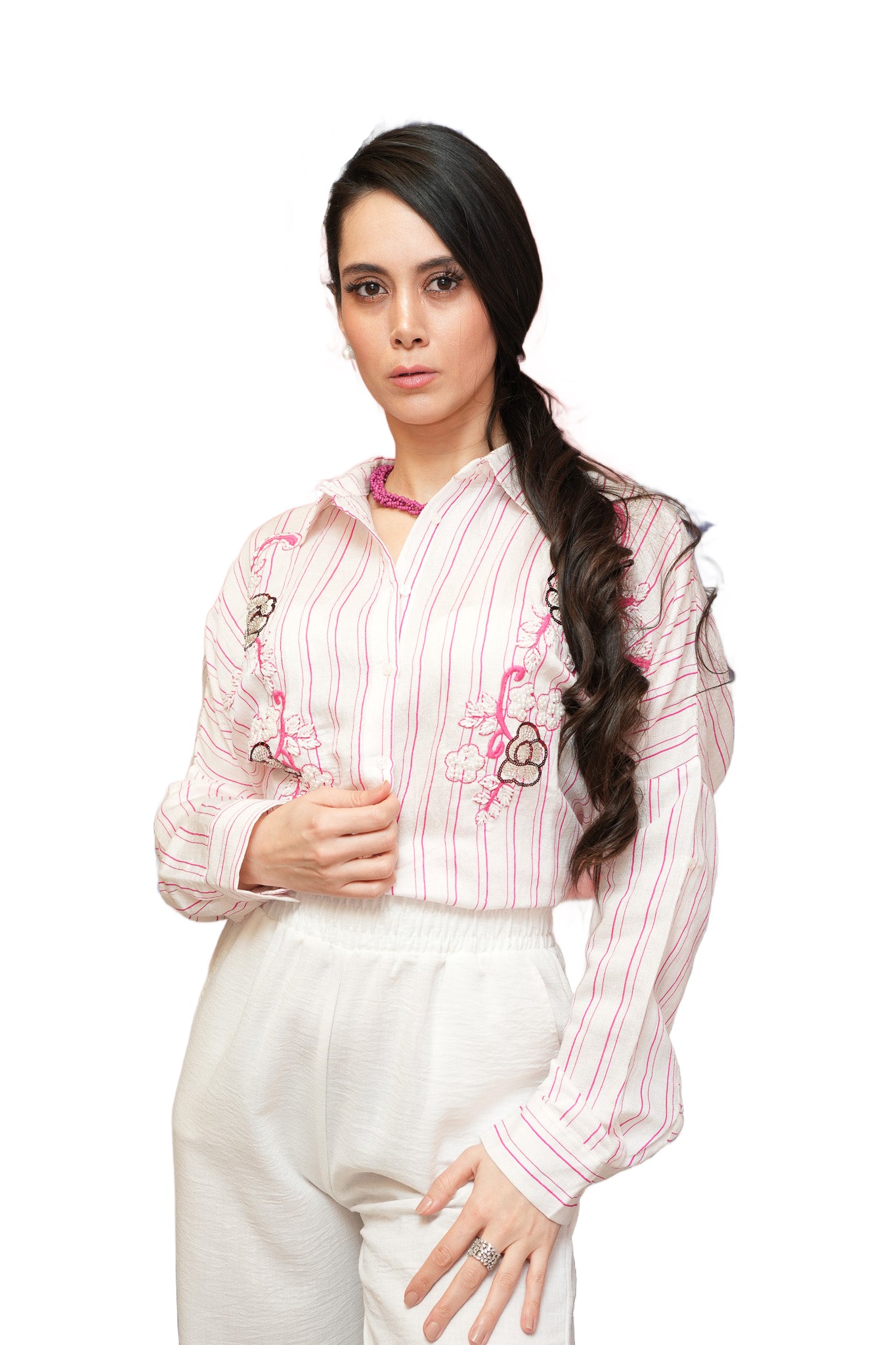 The Scarlet Bloom Shirt is a captivating blend of classic stripes and elegant embroidery, designed to add a bold yet refined touch to your wardrobe. This white shirt, adorned with vertical red stripes, features intricate floral embroidery in shades of red, white, and black across the chest, creating a stunning visual contrast. The button-down front and collared neckline lend it a timeless appeal, while the lightweight fabric ensures comfort. Perfect for casual outings, stylish brunches, or semi-formal occasions, this shirt is a versatile addition to your collection.