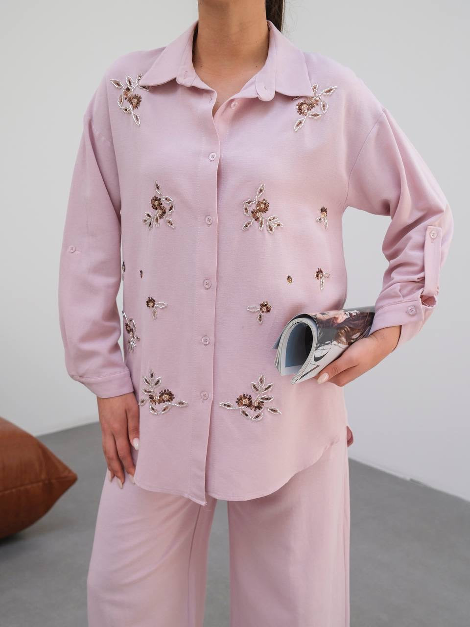 Soft structure meets subtle charm in Pink Stone, a light pink coord set designed for effortless elegance. The button-up shirt features delicate floral stonework across the front, paired with wide-leg trousers for a relaxed yet polished silhouette. Finished with rolled sleeves and breathable fabric, it’s perfect for workdays, brunches, or serene afternoons.
