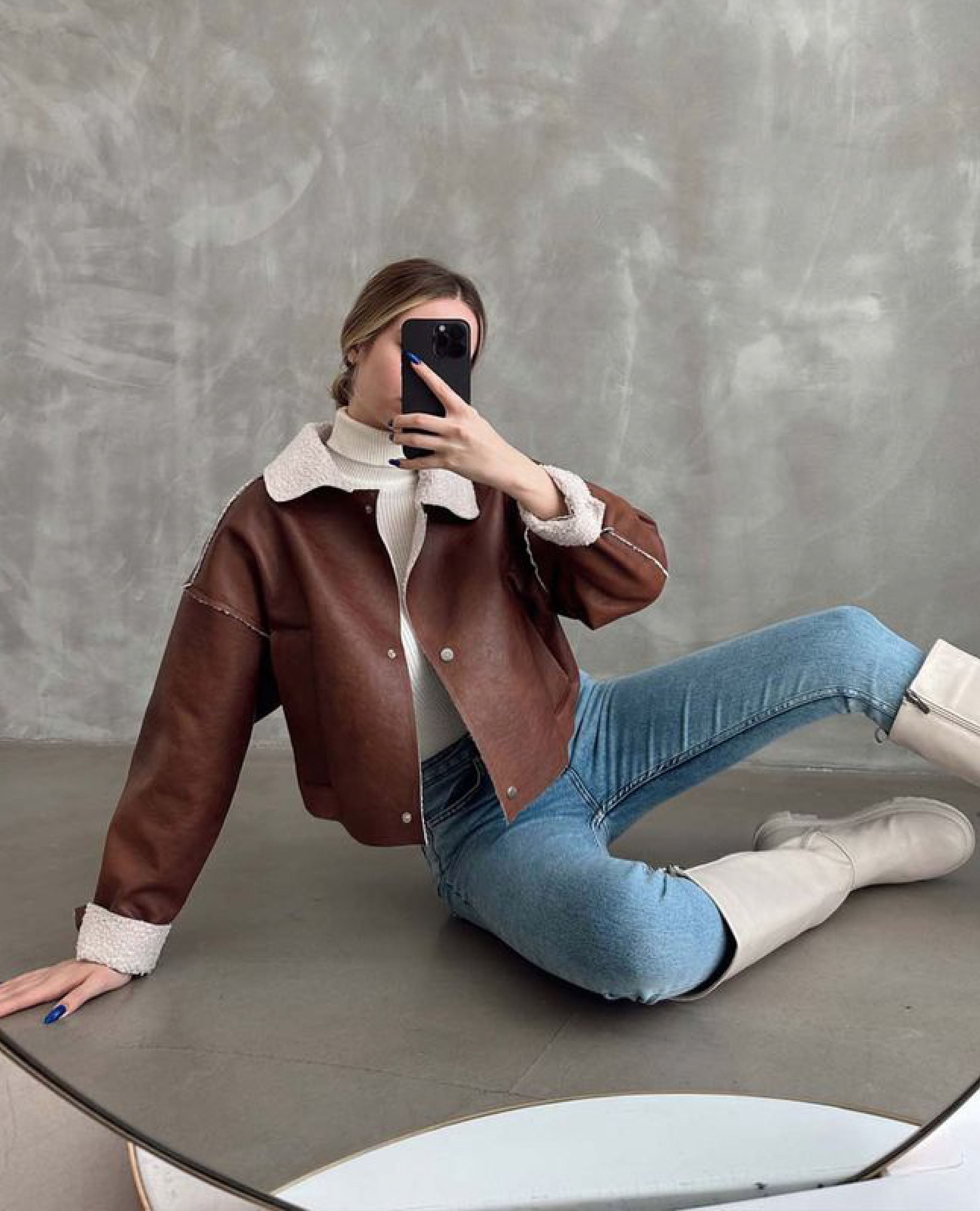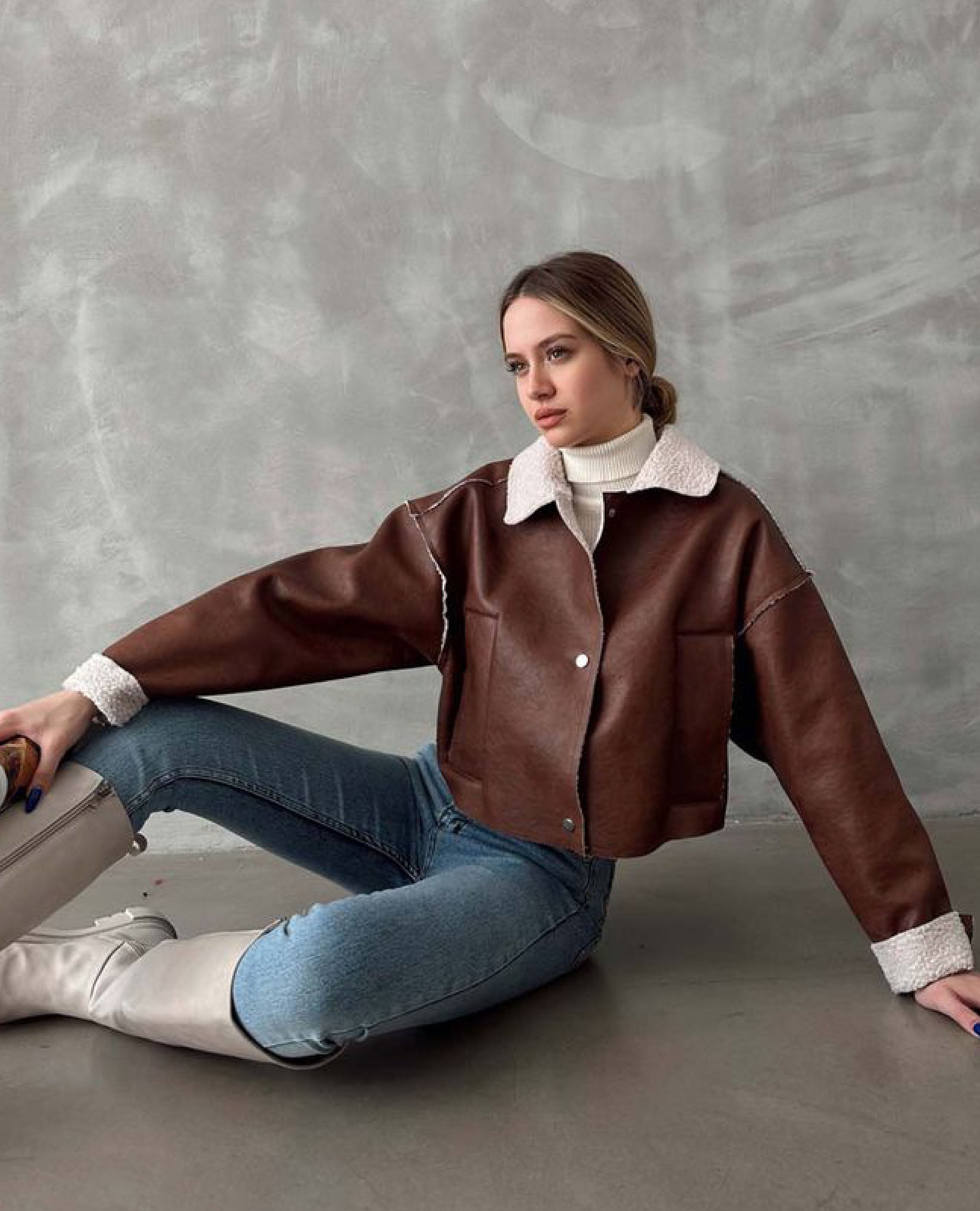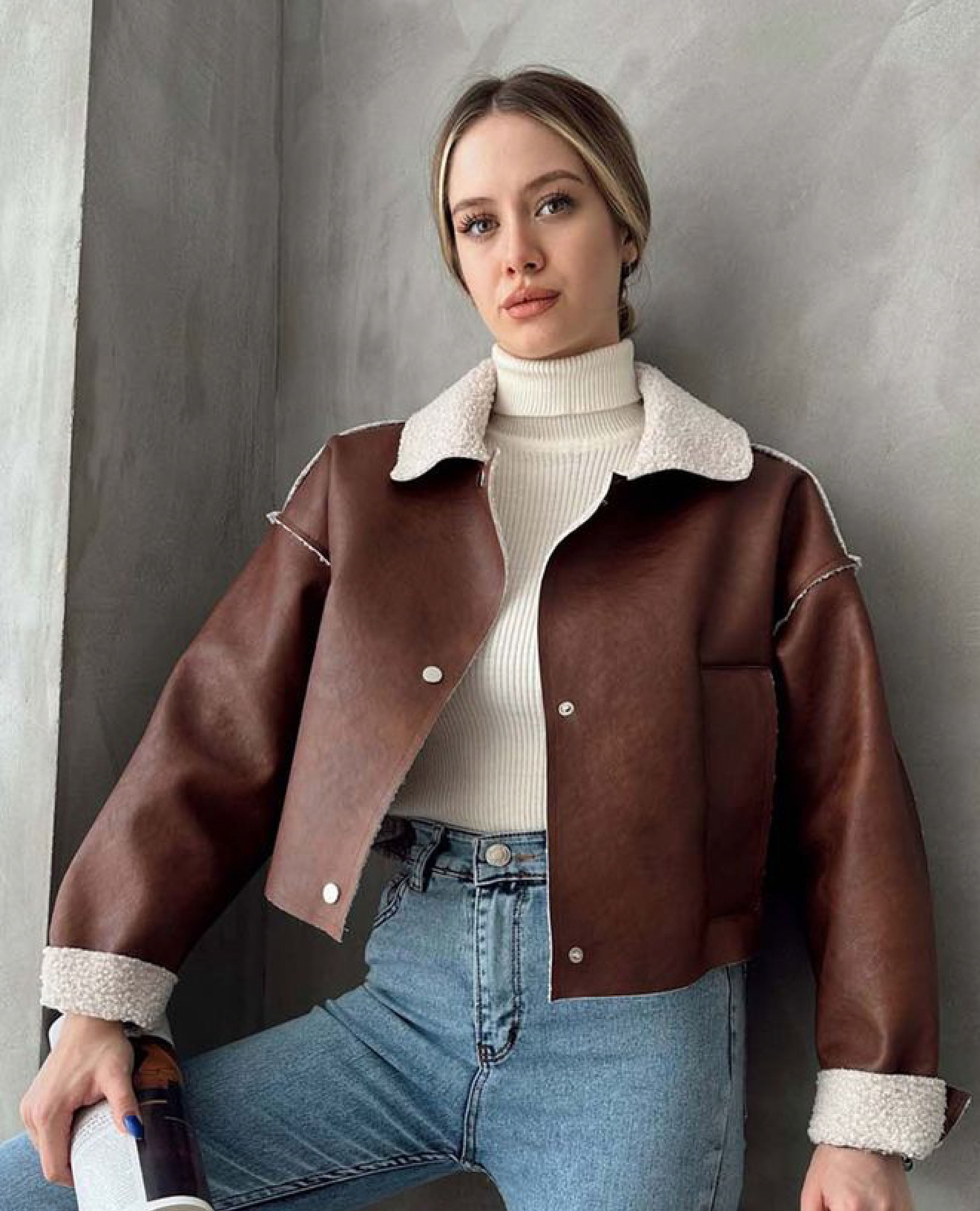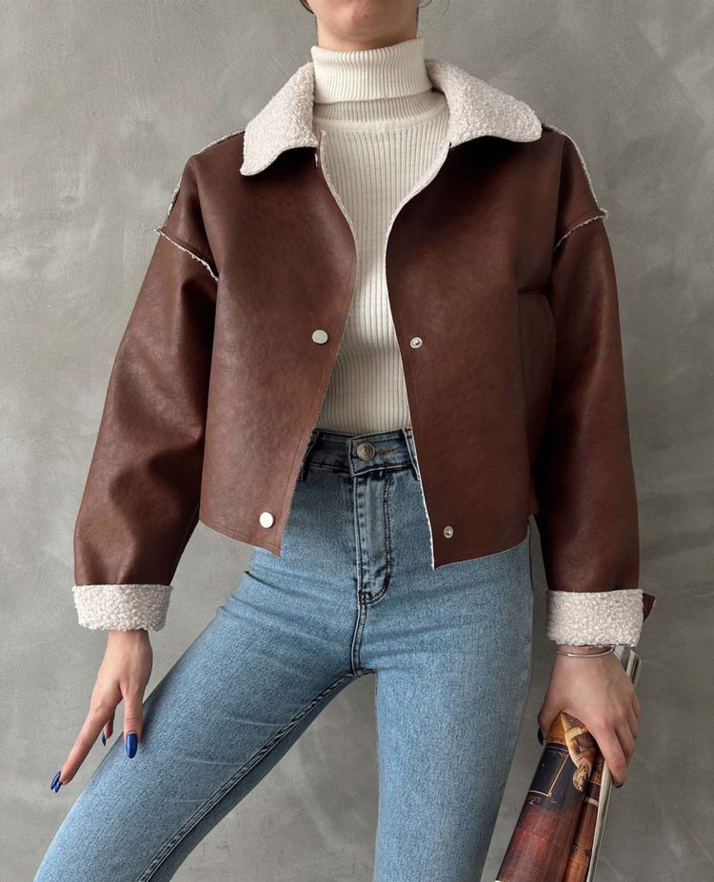 Embrace the cozy vibes of autumn with the Pumpkin Spice Leatherette Jacket. Crafted from luxurious leatherette, this jacket offers a soft, velvety feel that is both stylish and comfortable. The cream fur lining and accents add a touch of warmth and elegance, making it the perfect choice for cooler days.