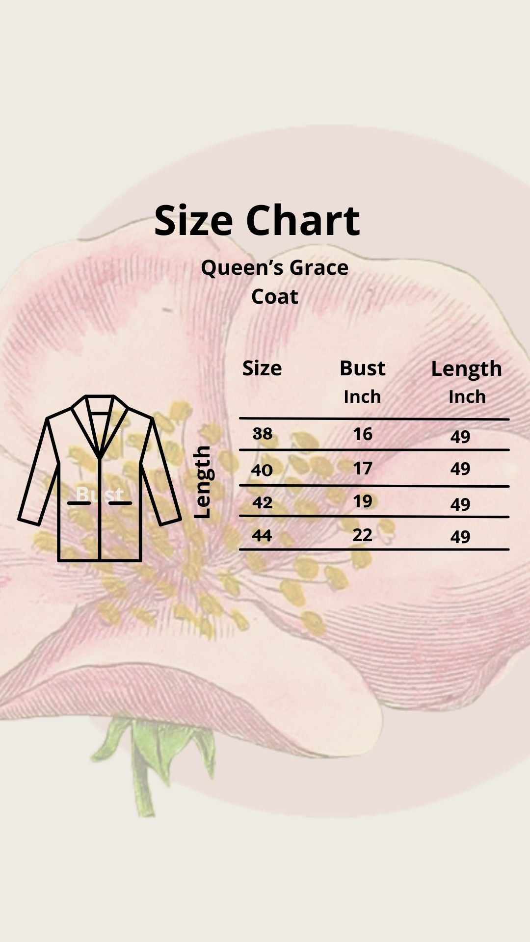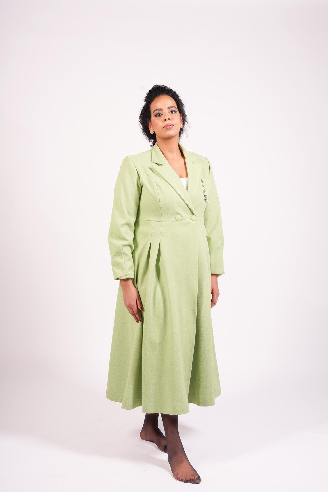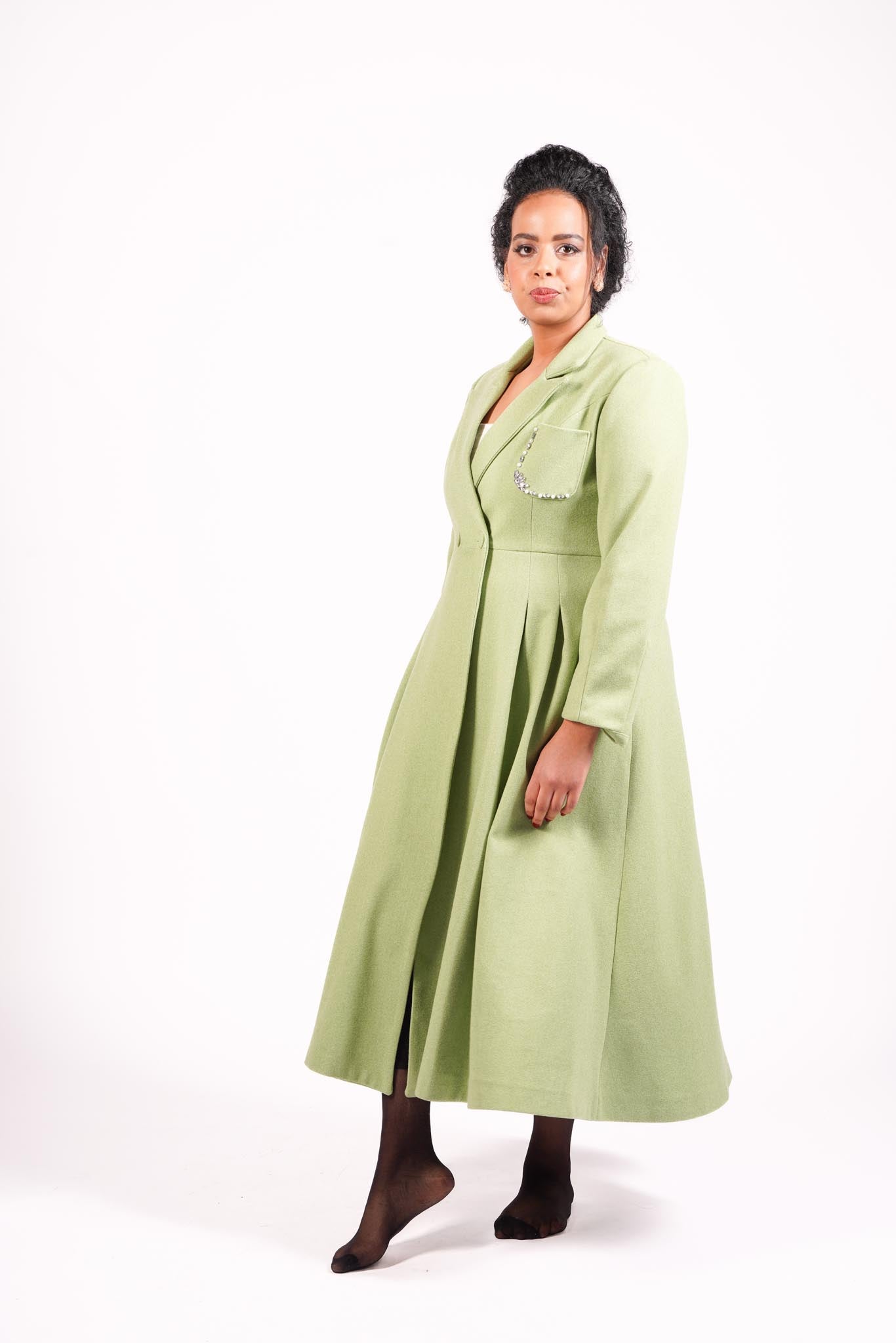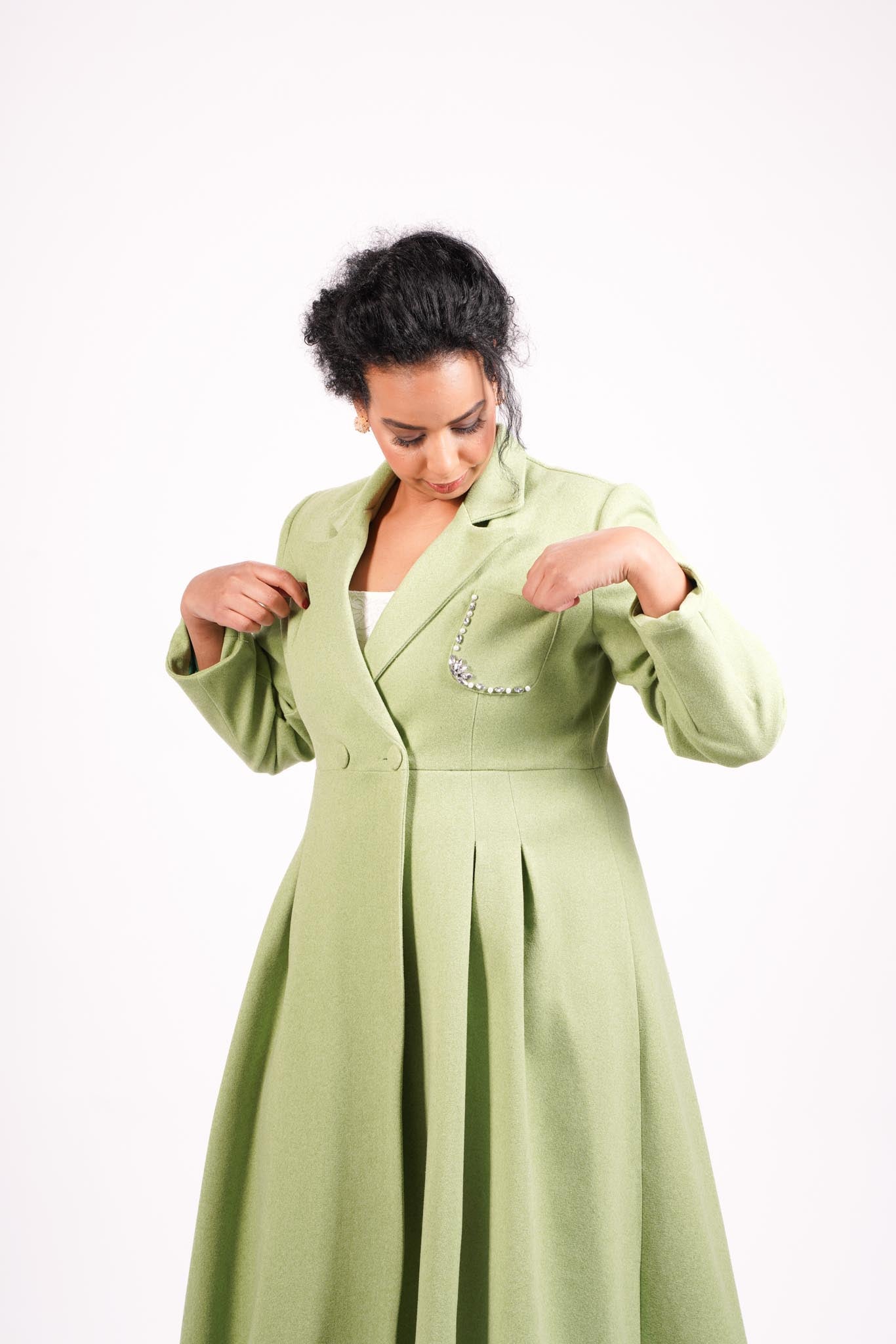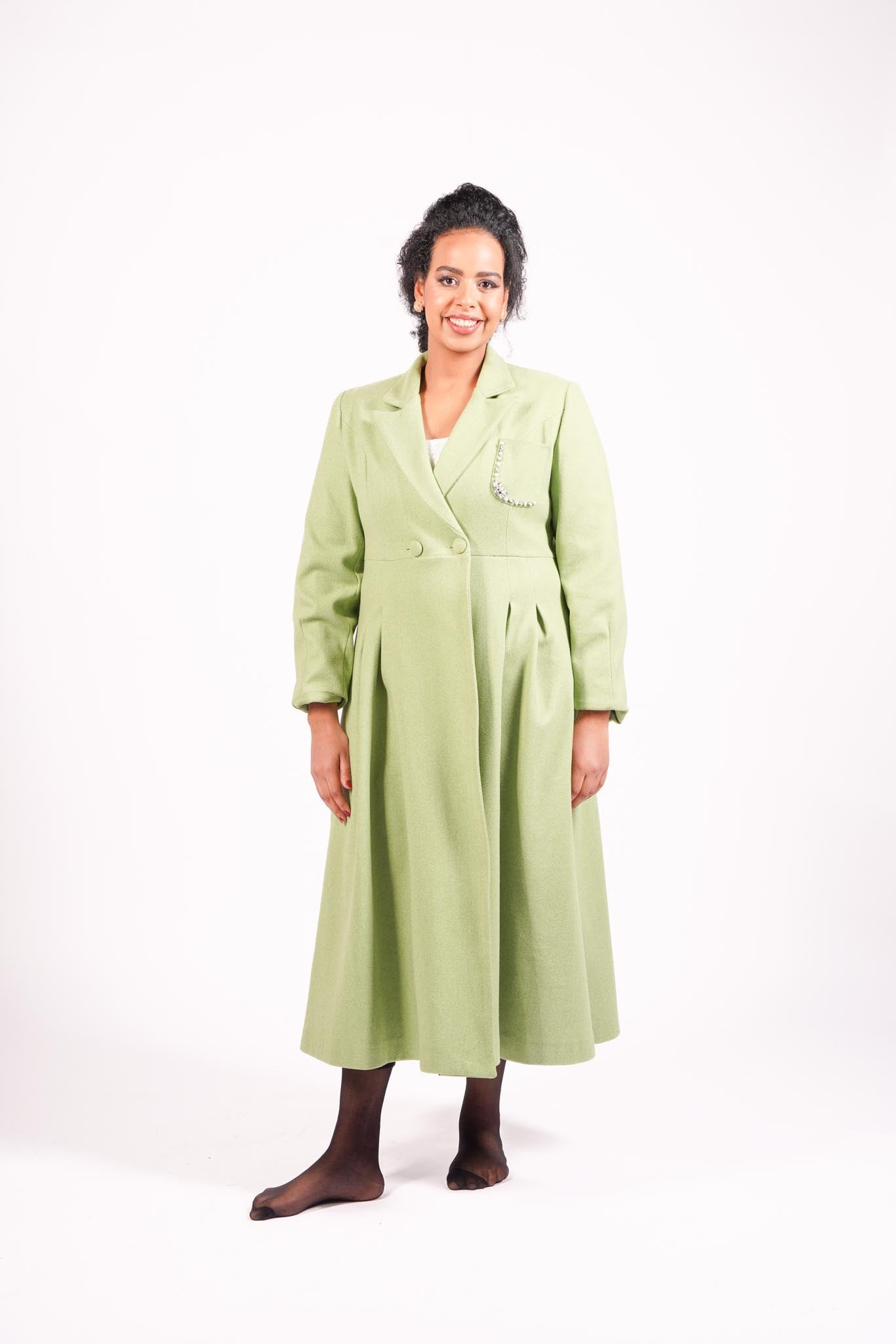 Step out in timeless elegance with the Queen's Grace Coat. This light green coat features a fitted bodice with a notched collar and long sleeves. The single-breasted front is adorned with buttons, and the left chest pocket is enhanced with a decorative chain of small, shiny embellishments. The pleated skirt flares out to the ankles, adding a vintage-inspired touch to this sophisticated piece. Perfect for any formal occasion, this coat exudes grace and style.
