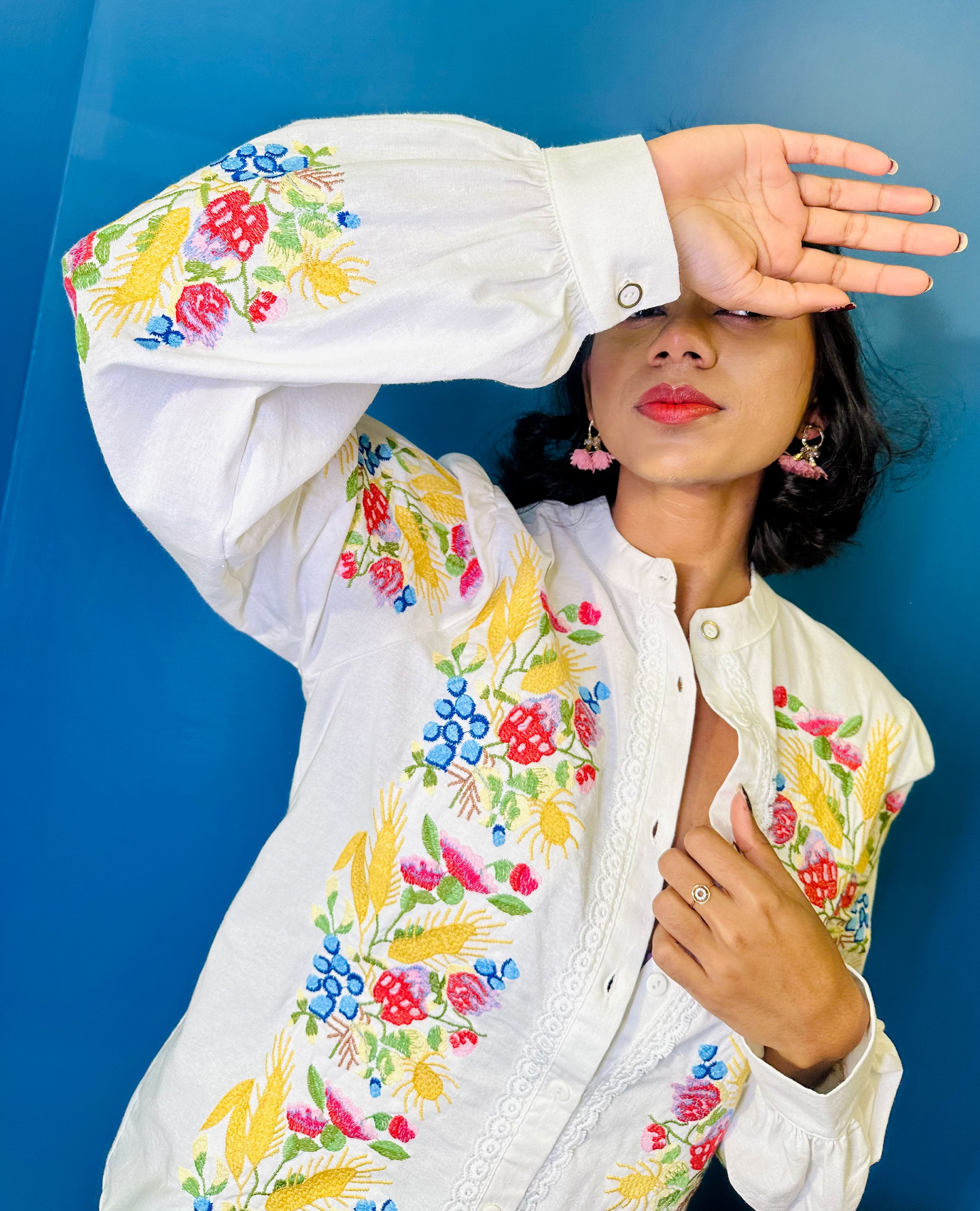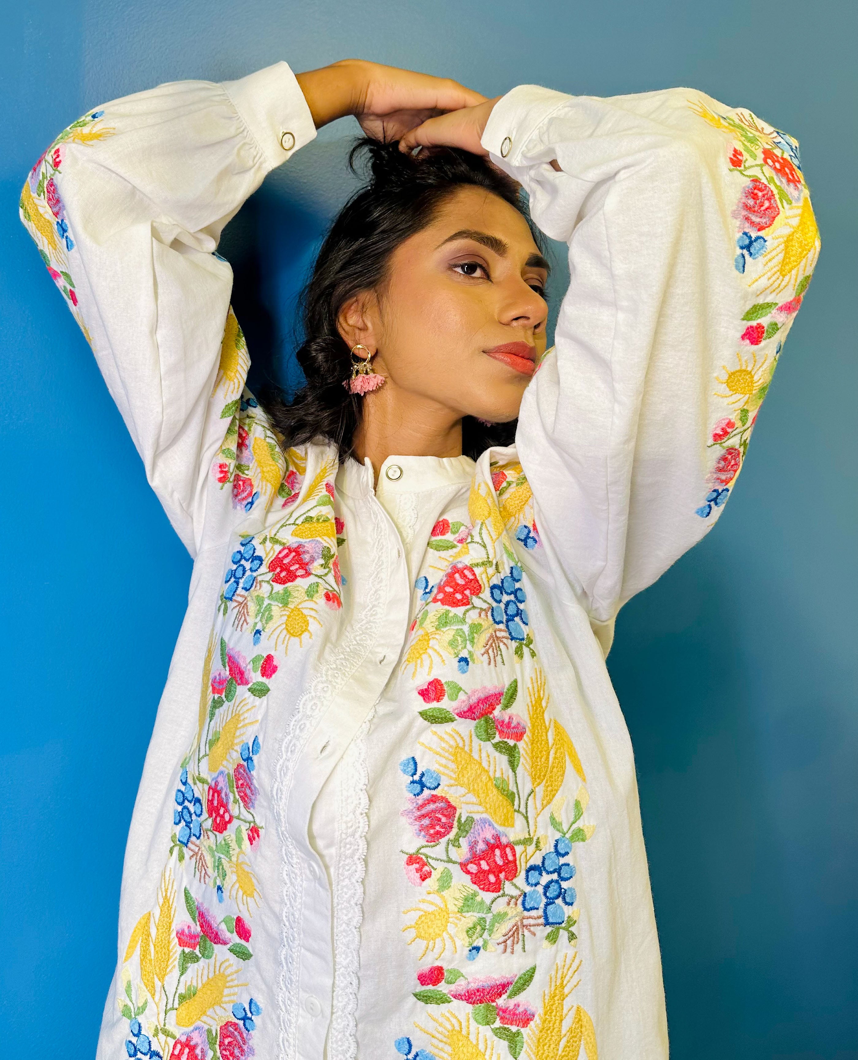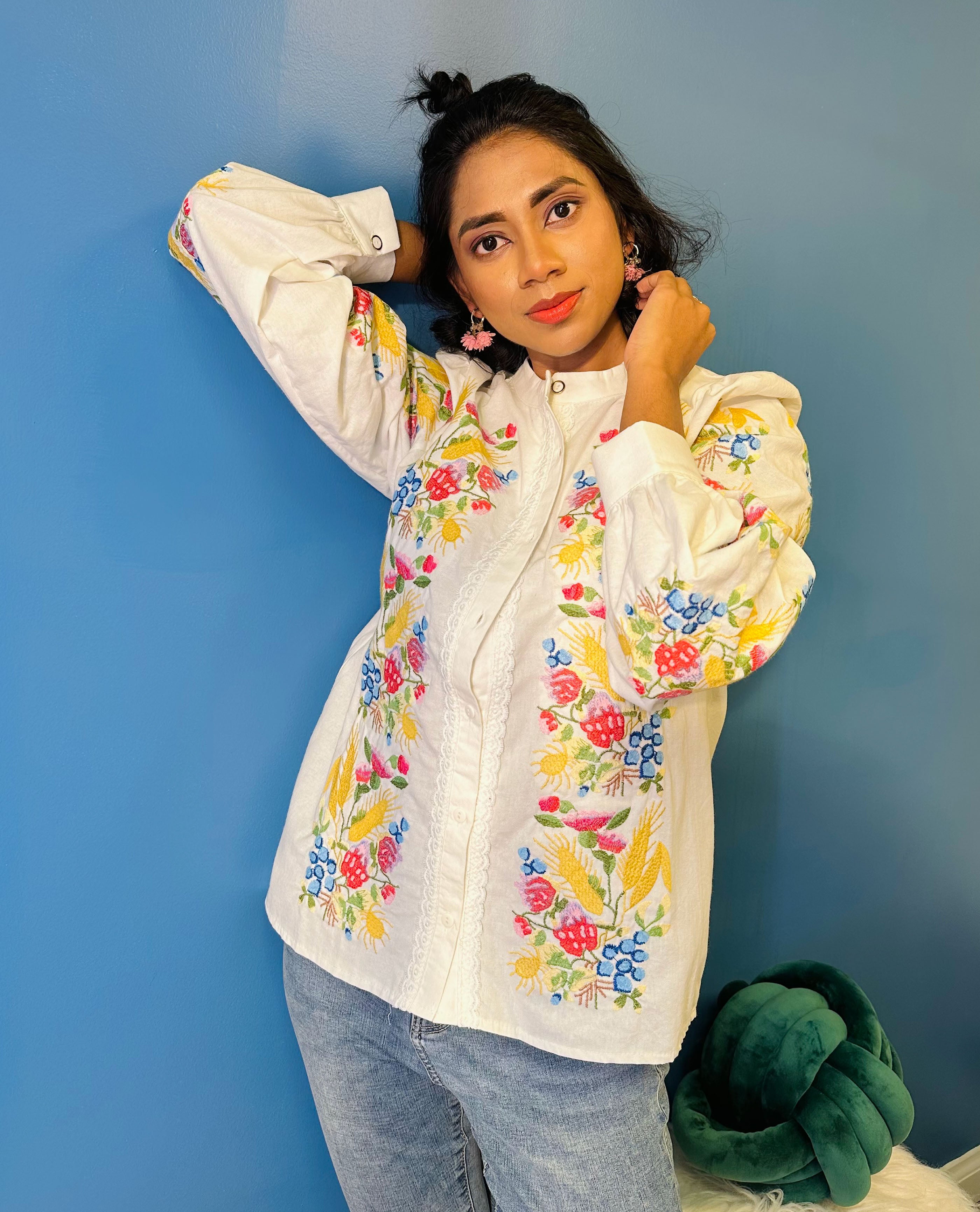 Design: The shirt features a classic button-down front and fully embroidered sleeves, adding a touch of elegance and sophistication. The multi-colored embroidery creates a harmonious and eye-catching look, making it versatile for both casual and semi-formal occasions.