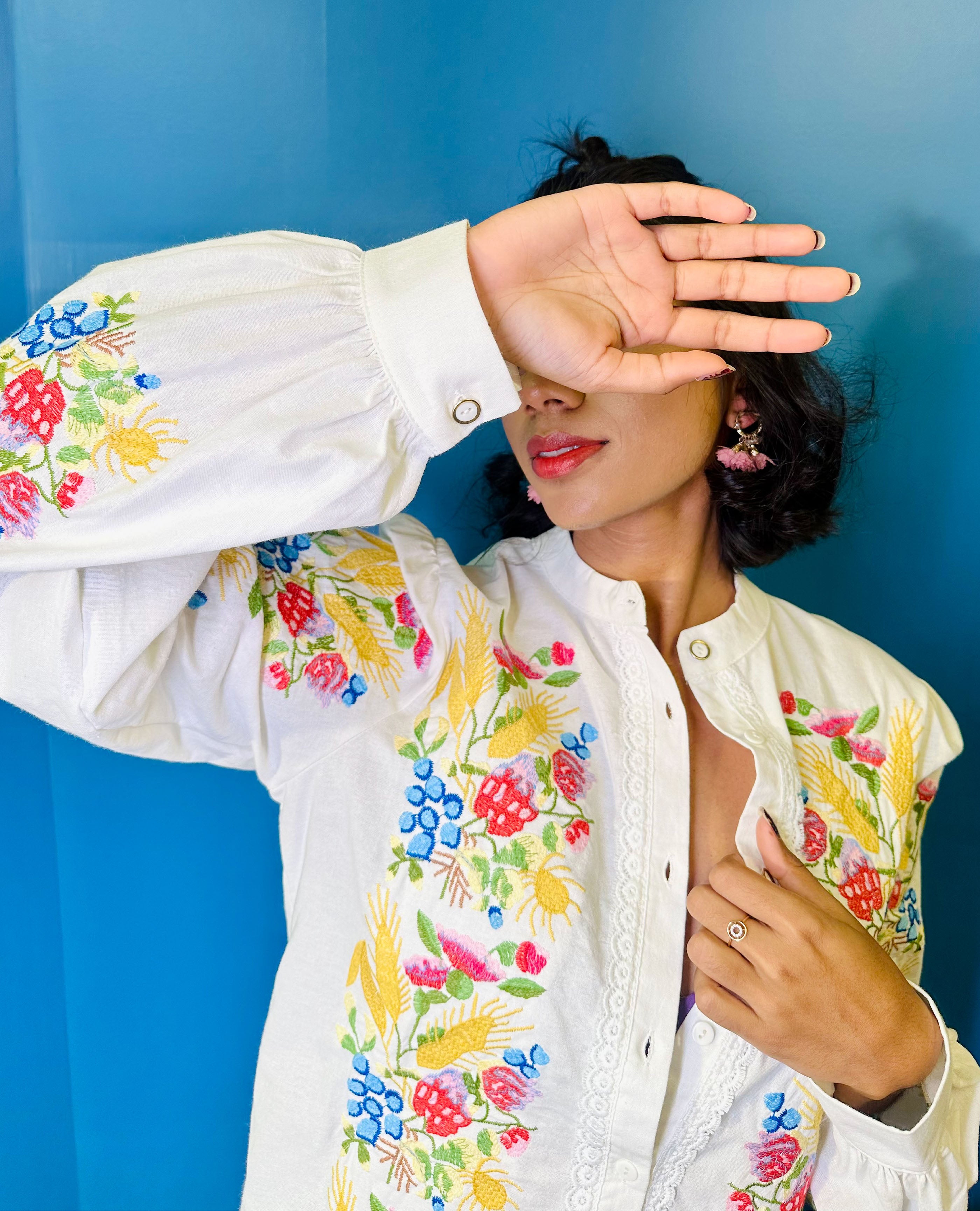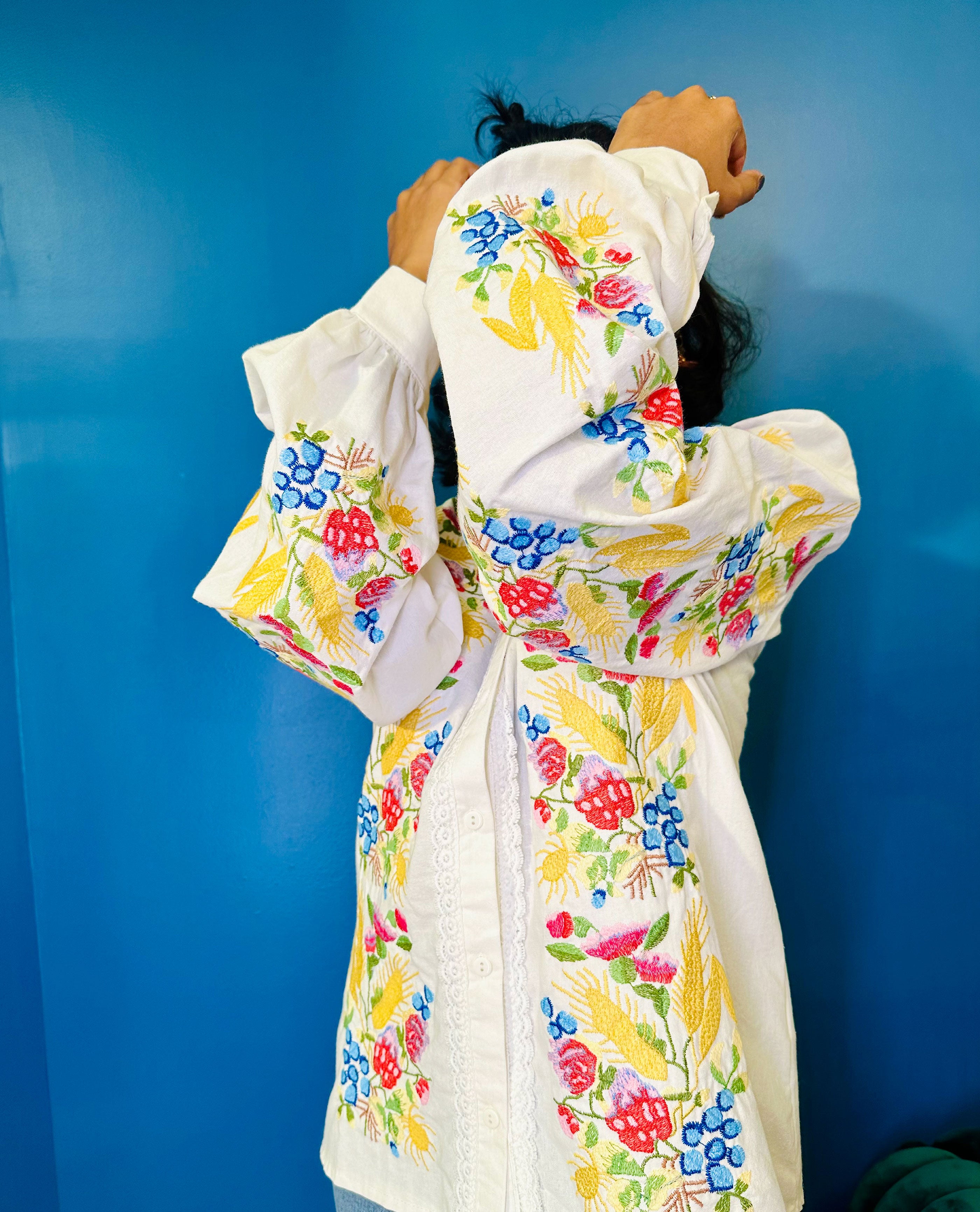 Add a touch of whimsy to your wardrobe with our “Rainbow Whisper” shirt. This enchanting off-white shirt is adorned with vibrant multi-colored embroidery, creating a captivating and joyful look. The intricate designs cover the entire front and sleeves, making it a true statement piece.