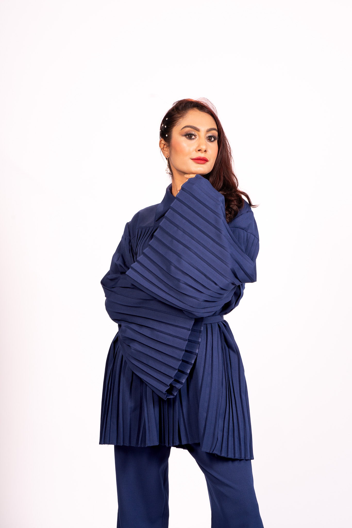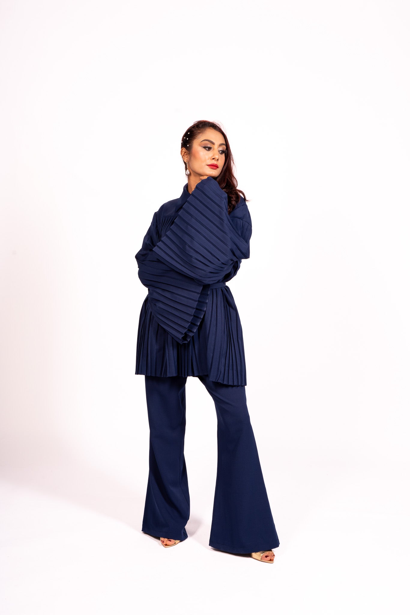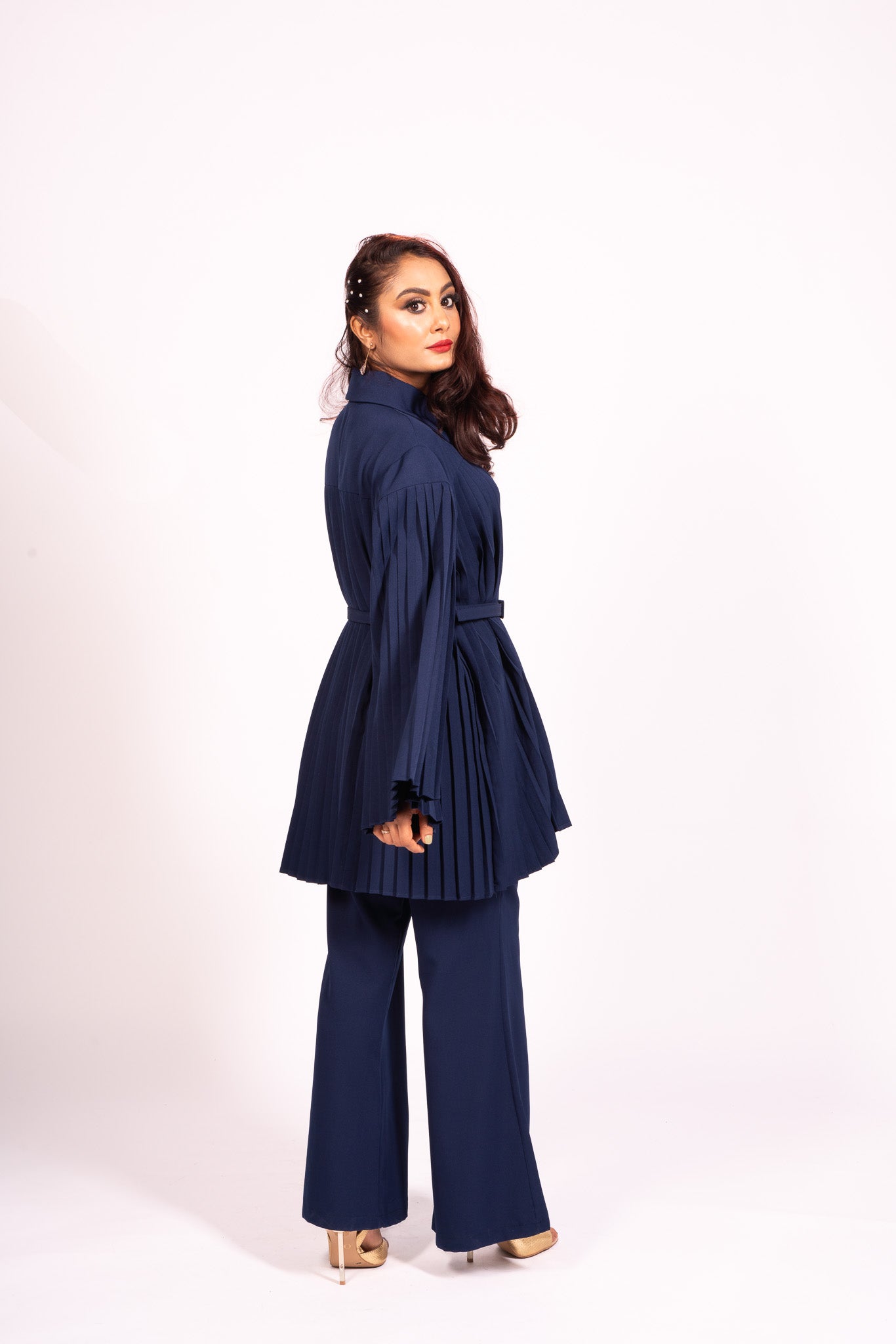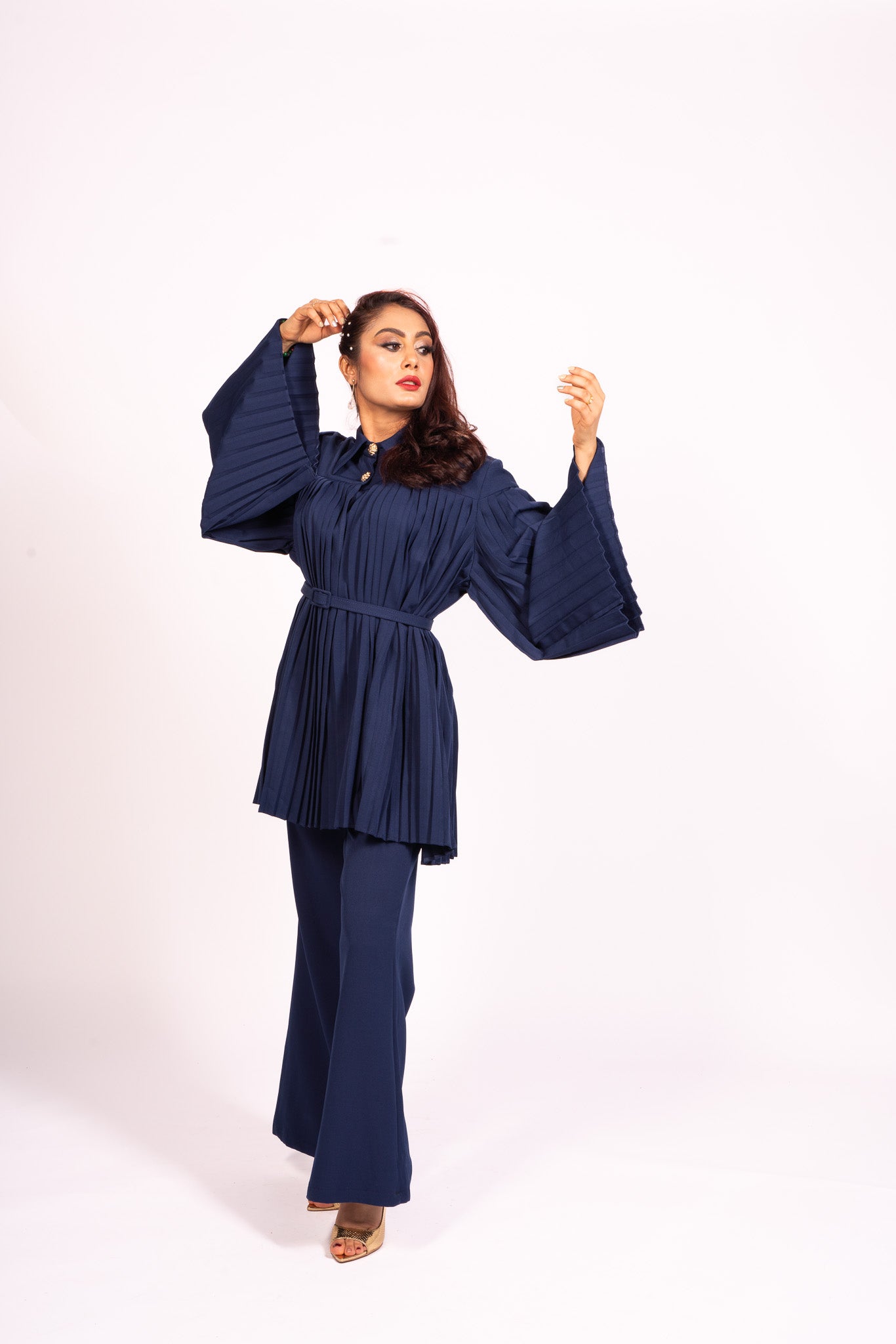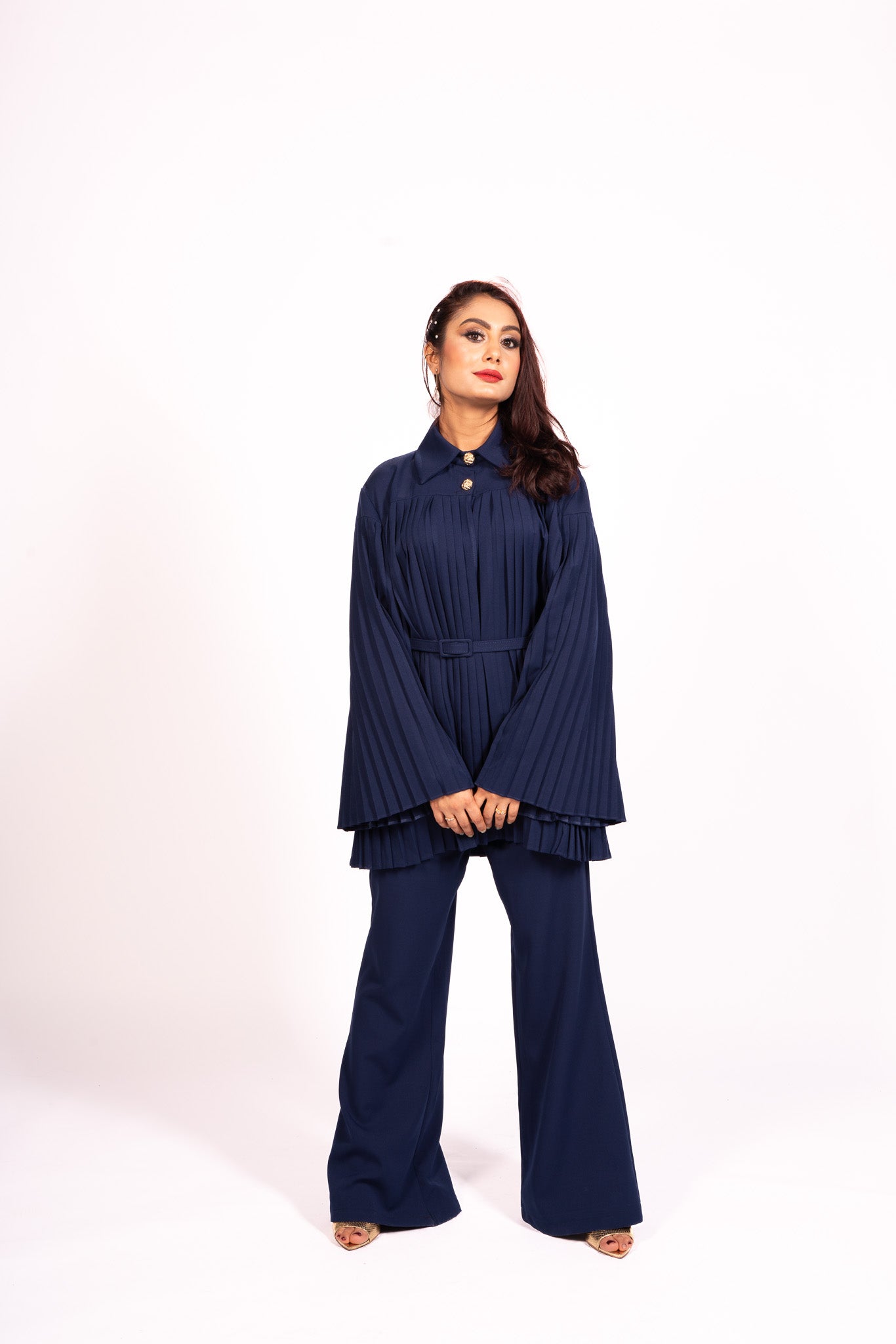 Exude sophistication and elegance with the Regal Blue Set. This striking ensemble features a pleated tunic top and matching wide-leg pants in a rich, regal blue hue. The tunic top boasts a collared neckline, long bell sleeves, and a belt that cinches at the waist, creating a flattering silhouette. The wide-leg pants complement the top, offering a cohesive and stylish look that’s perfect for various occasions.