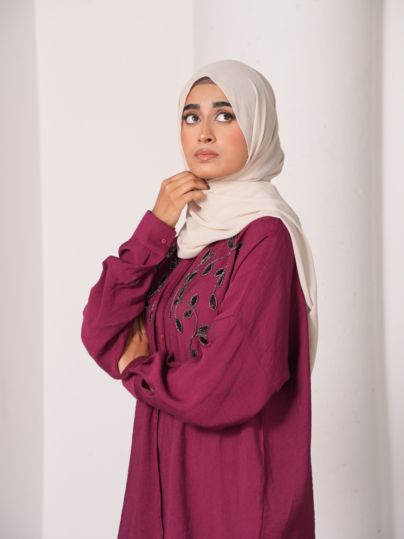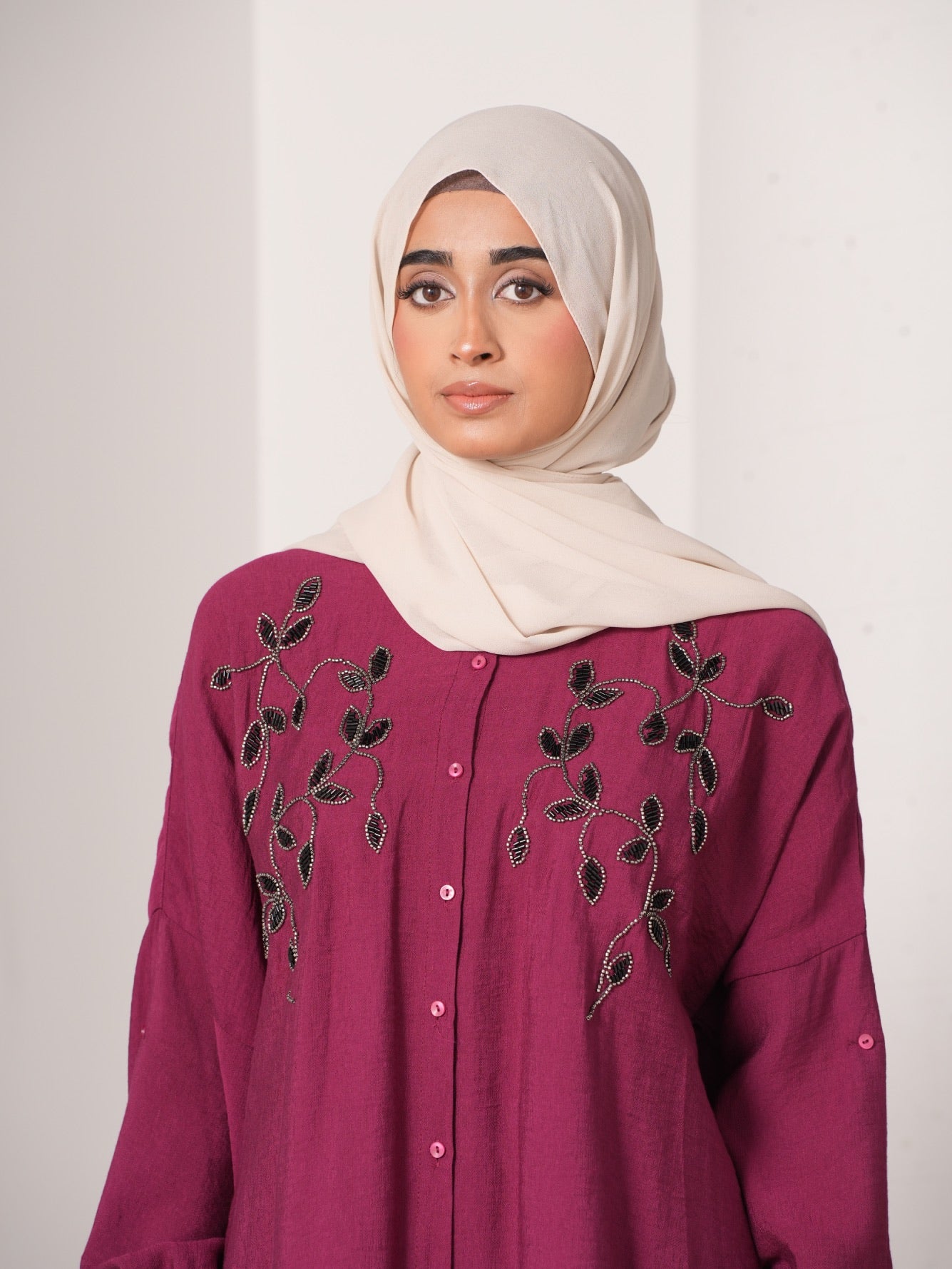 Ignite your wardrobe with the opulent charm of the Ruby Glow Coord Set. Drenched in a deep ruby hue, this ensemble is a celebration of bold elegance and artisanal craftsmanship. The shirt features exquisite beadwork and embellishments in a graceful vine motif, adding texture and dimension to its rich canvas. Designed for those who love to make a statement without saying a word.