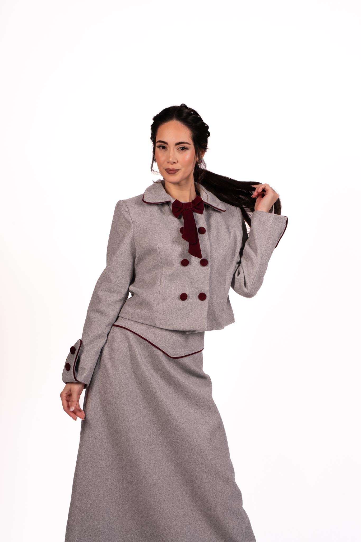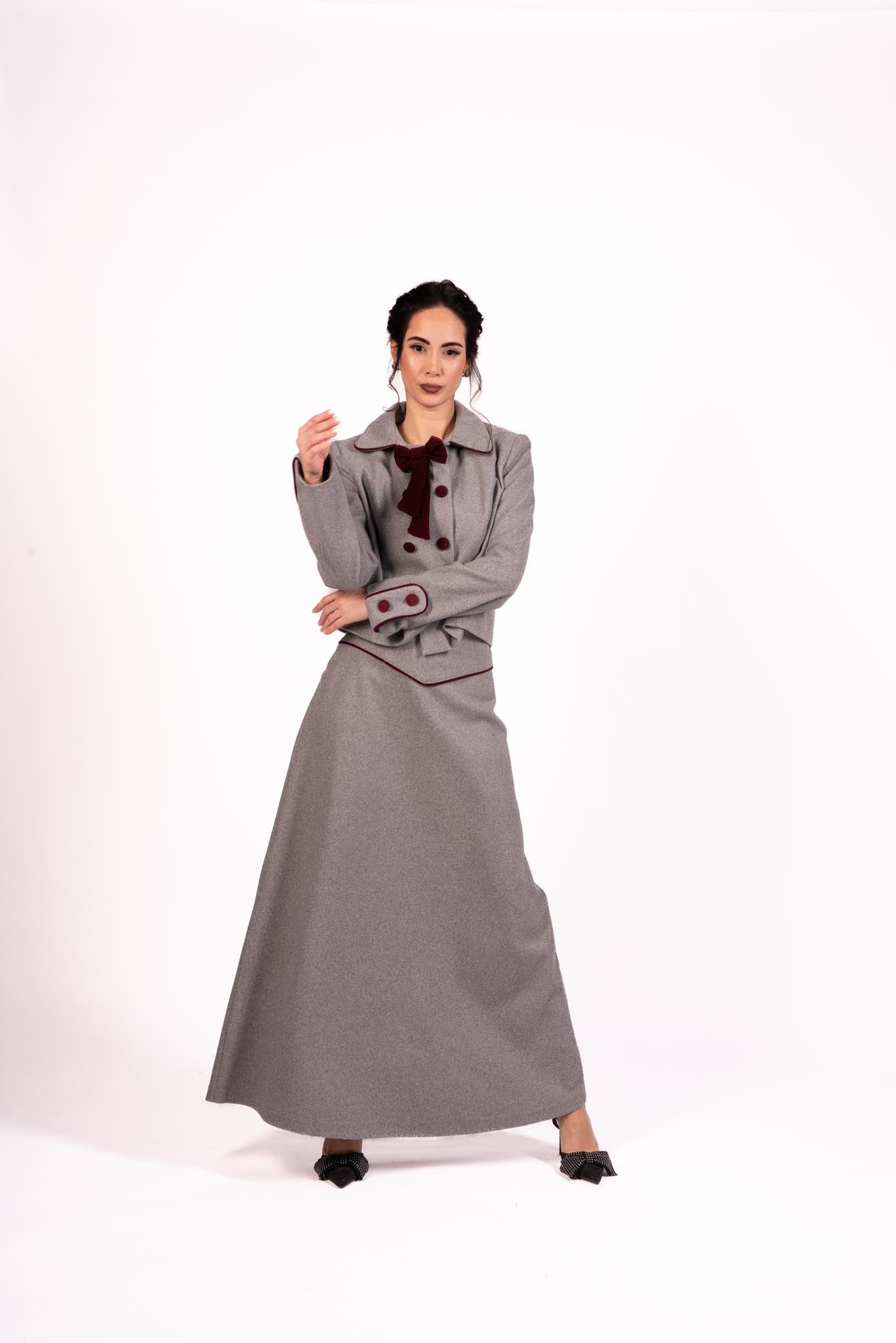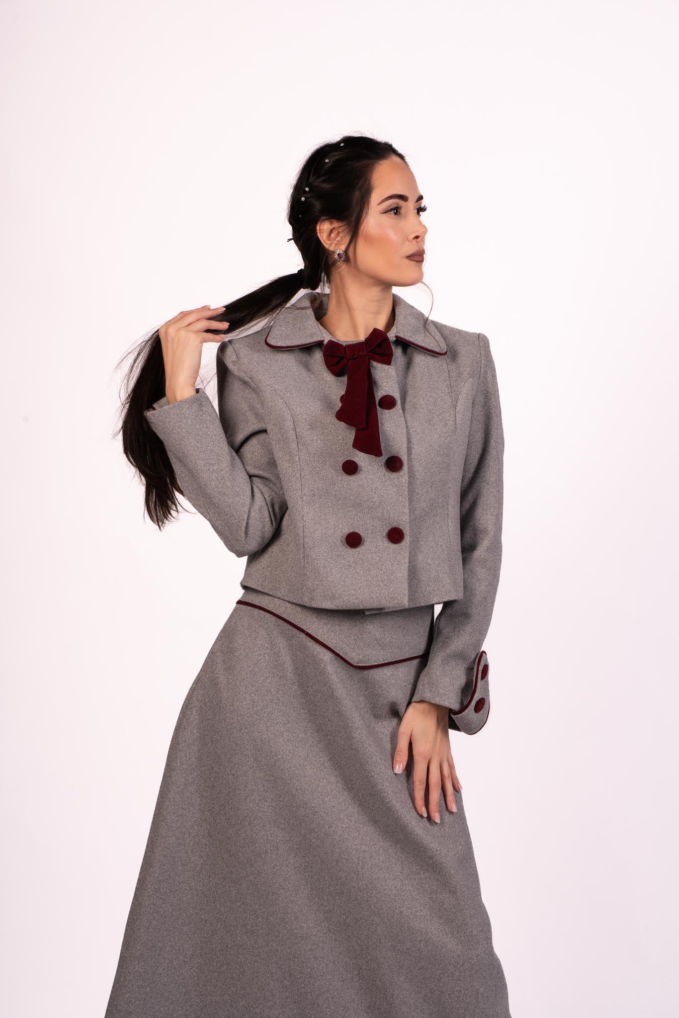 Step into elegance with the Scarlet Dream Skirt Set. This exquisite ensemble features a deep grey, long skirt and a matching double-breasted jacket. The jacket is adorned with burgundy velvet buttons, a decorative burgundy velvet bow at the collar, and burgundy velvet detailing on the cuffs. The luxurious velvet accents add a touch of sophistication to this stylish set. Ideal for formal occasions or professional settings, the Scarlet Dream Skirt Set offers both style and comfort.