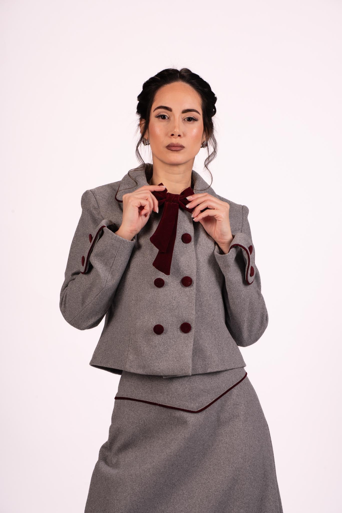 ● Design: Long skirt, double-breasted jacket with burgundy velvet buttons and bow, velvet-trimmed cuffs