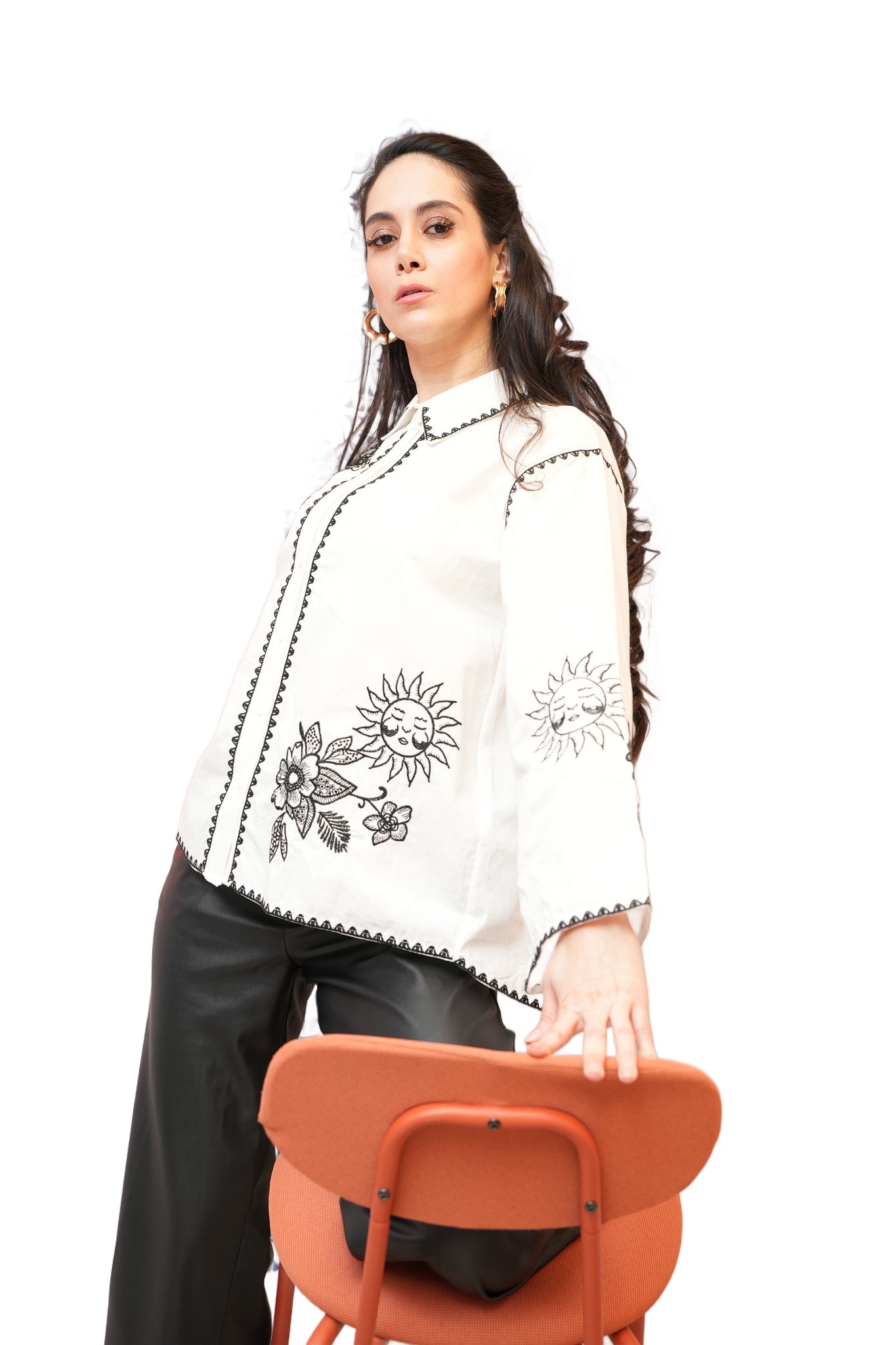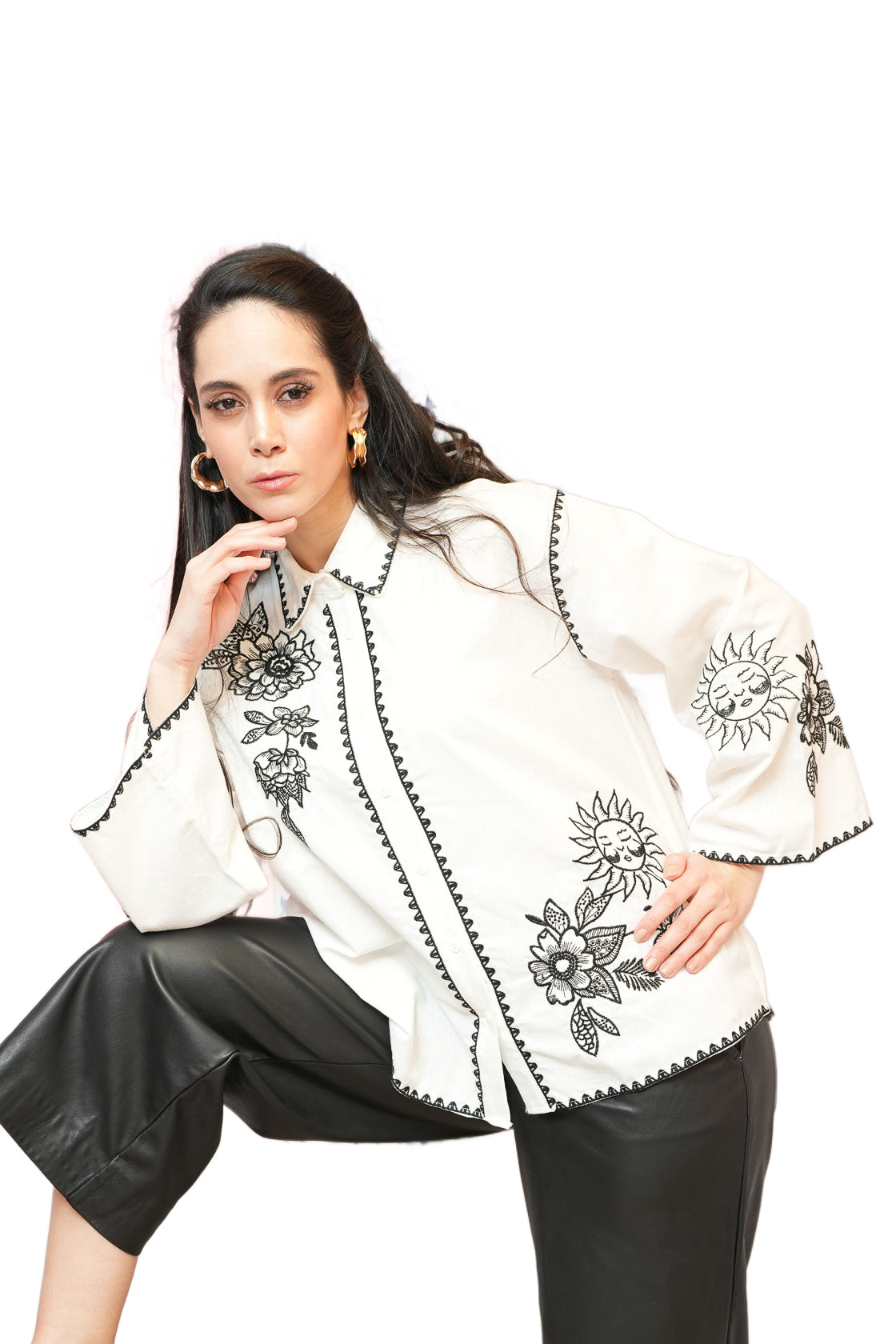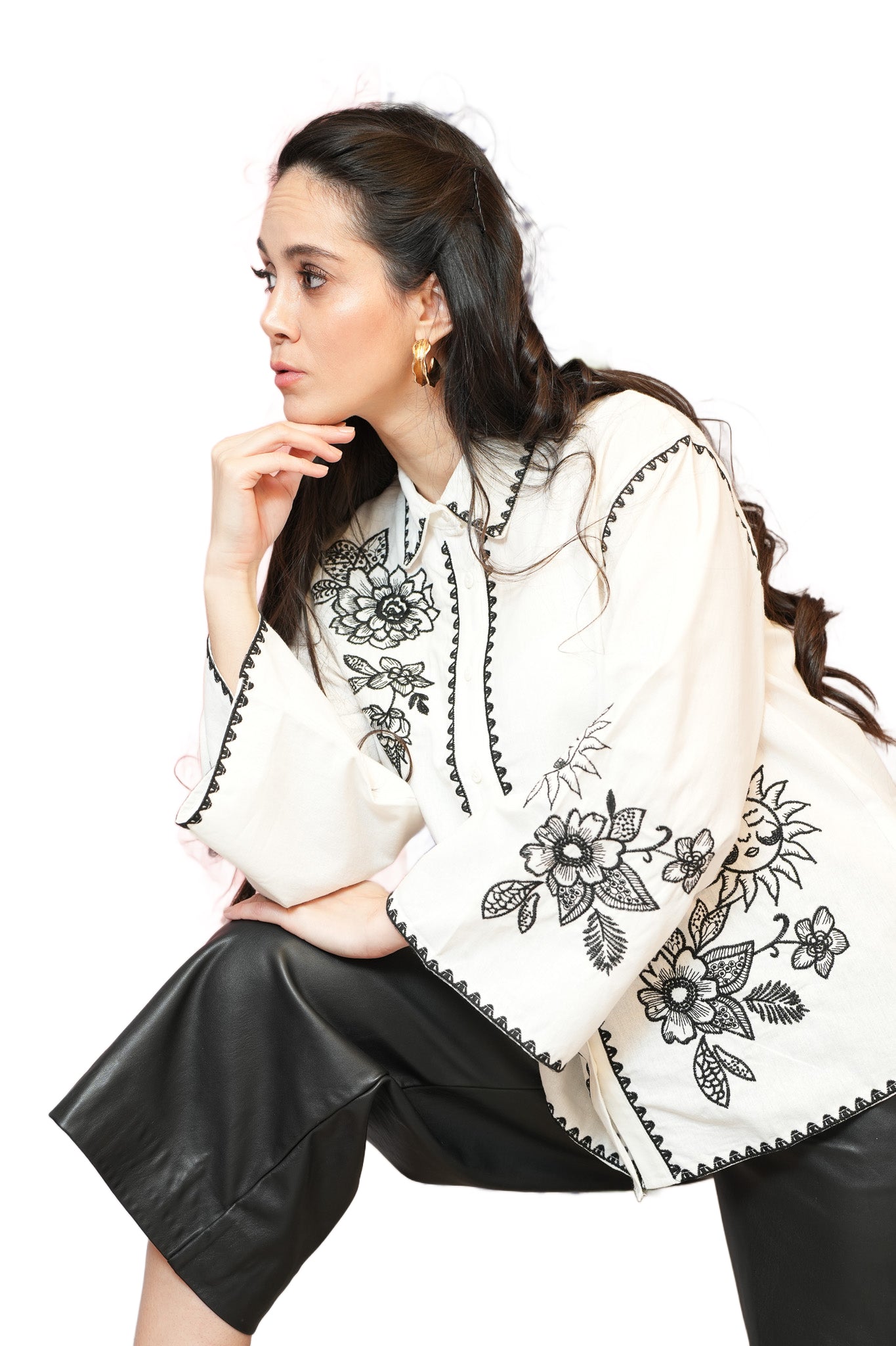 Crafted from a crisp white fabric, this long-sleeve shirt features striking black floral embroidery, adding a sophisticated and timeless charm. The detailed stitching extends to the cuffs and edges, enhancing its refined look. With a relaxed yet tailored fit, this shirt is perfect for making a statement in both casual and polished settings.